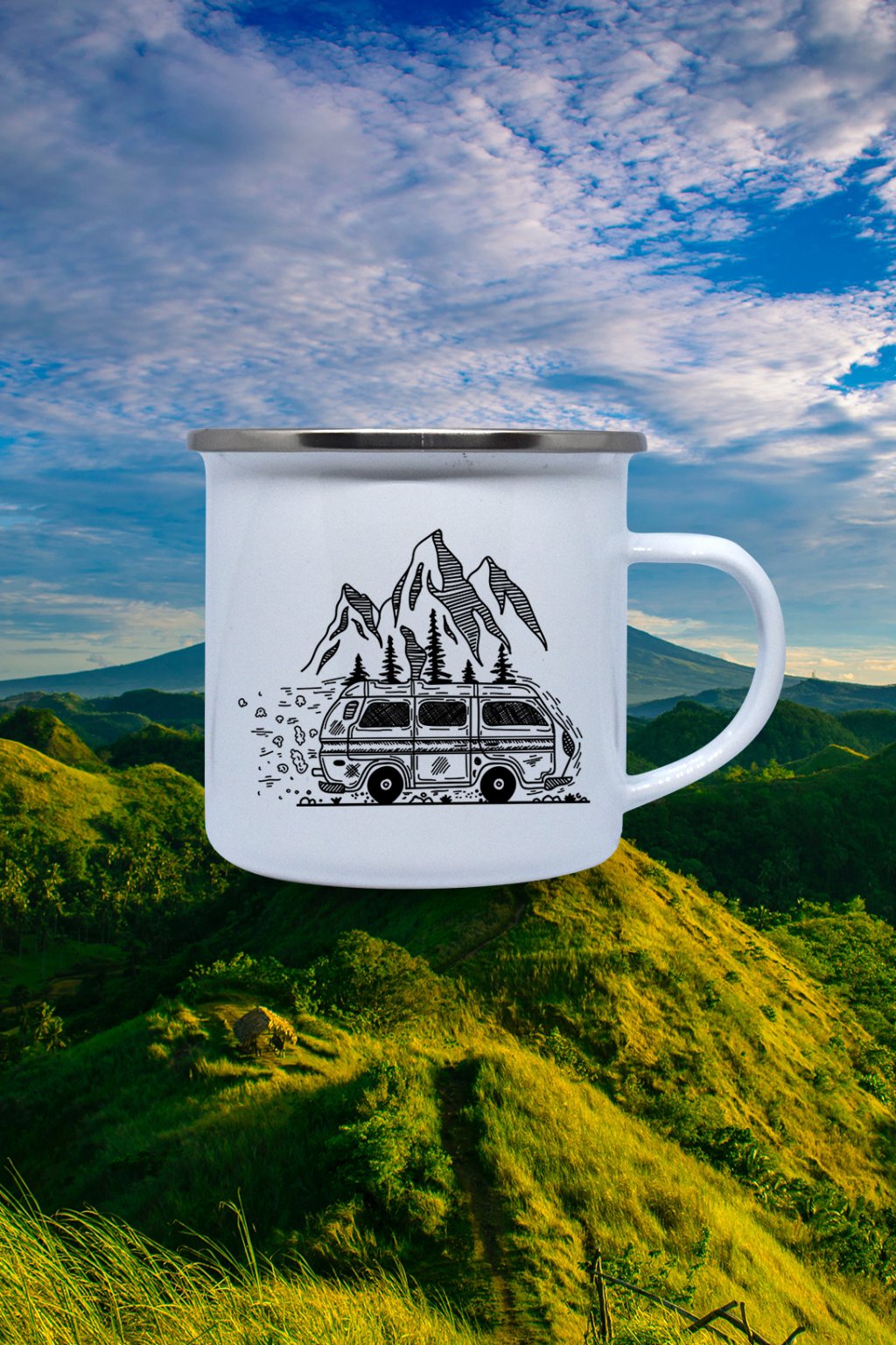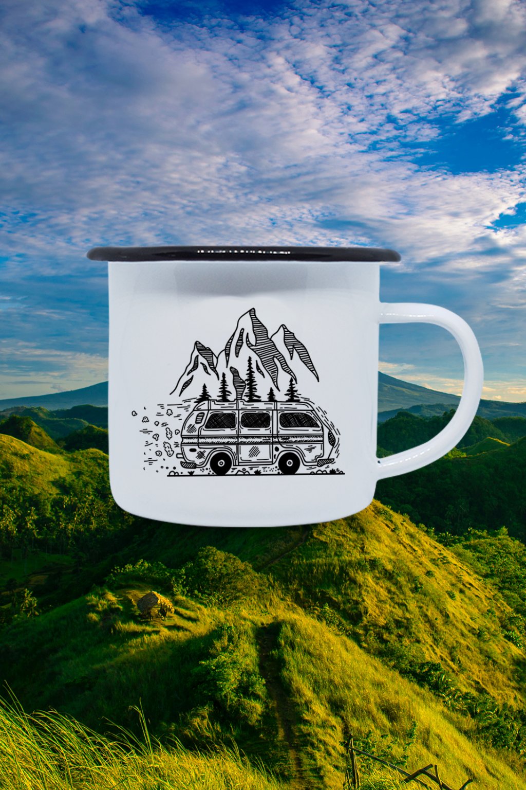 Plechový hrnček, na ktorom je obrázok auta. Plecháčik je ako stvorený pre každého milovníka turistiky.