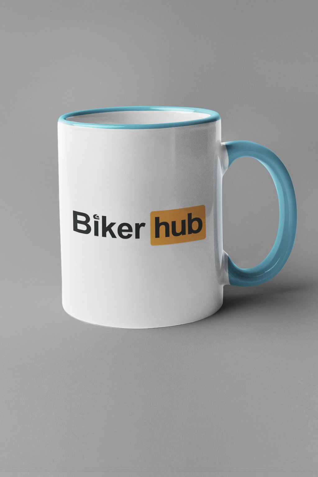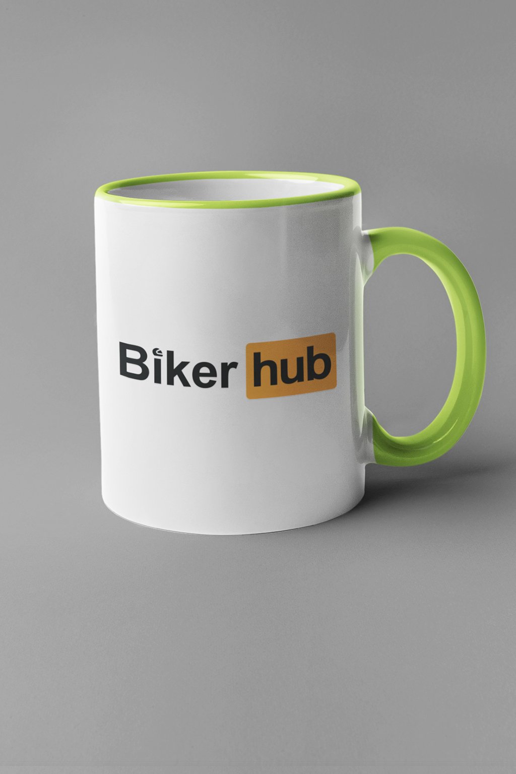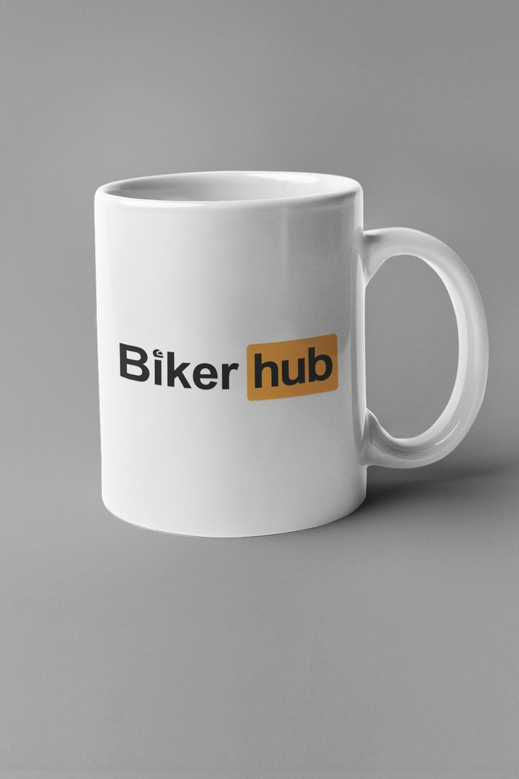 Biely keramický hrnček, na ktorom je nápis: "Biker HUB."