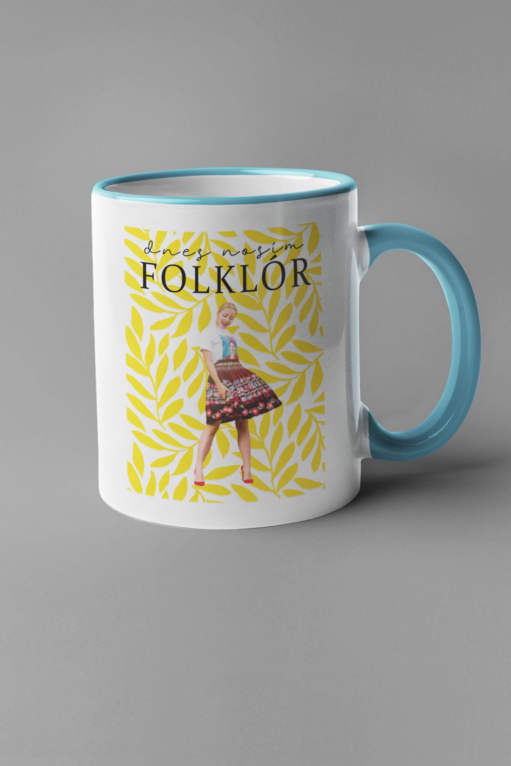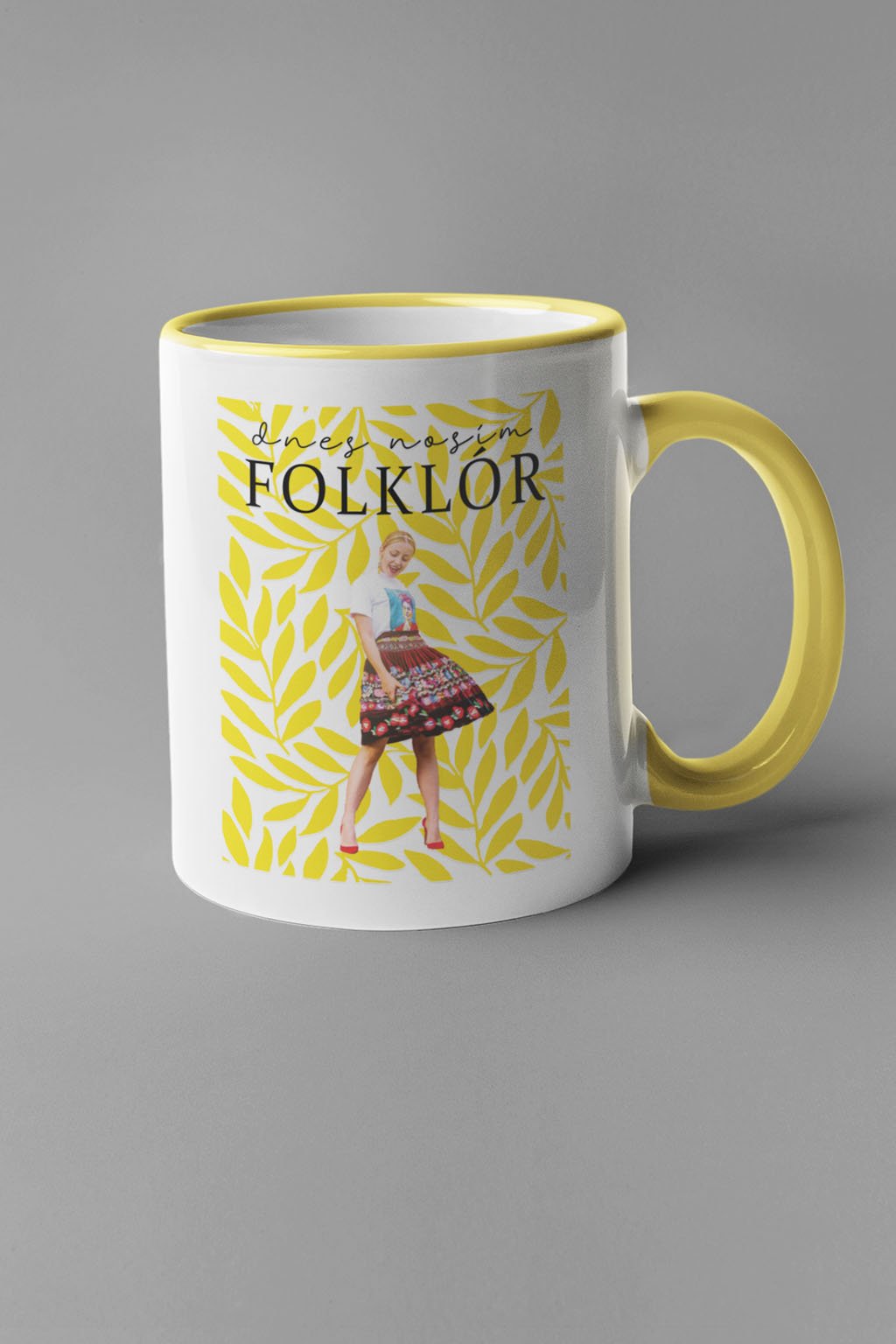 Biely keramický folklórny hrnček pre hrdú Slovenku. Na šálke je nápis "Dnes nosím folklór," na ktorom je moderný ľudový motív.