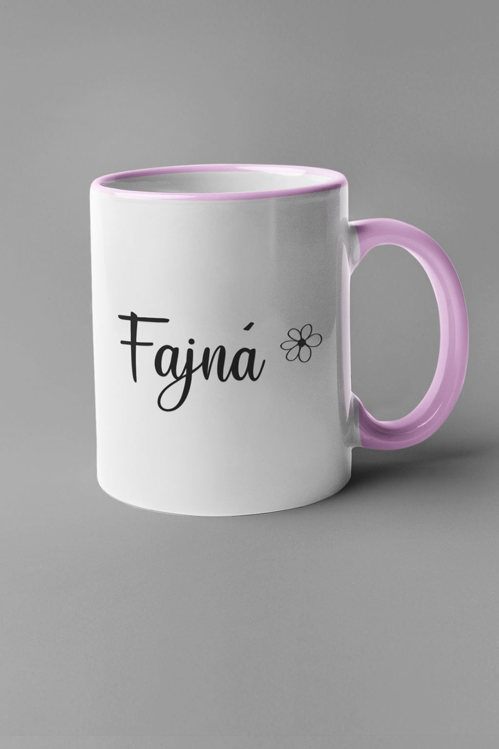 Biely keramický hrnček so slovenským prídavným menom. Na šálke je jedno slovo, ktoré ťa presne vystihne: ,,Fajná."
