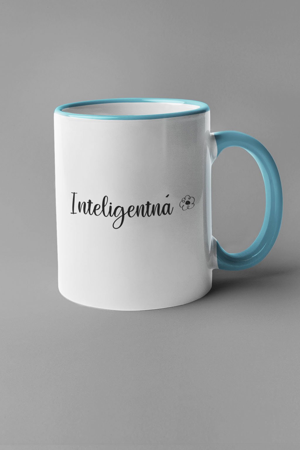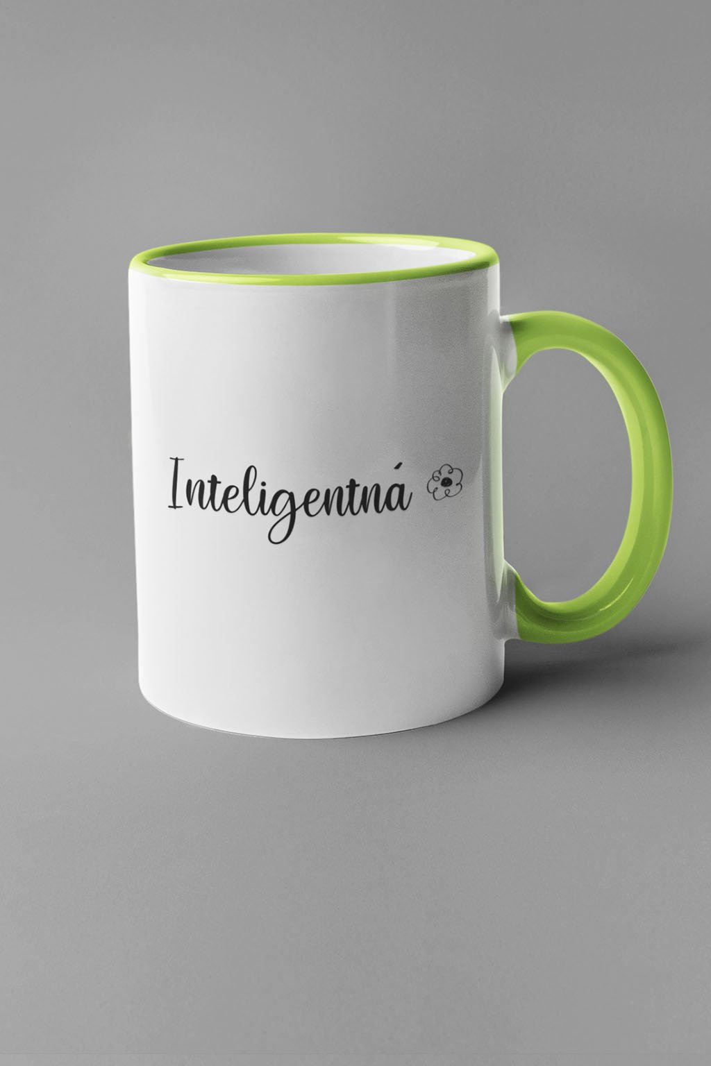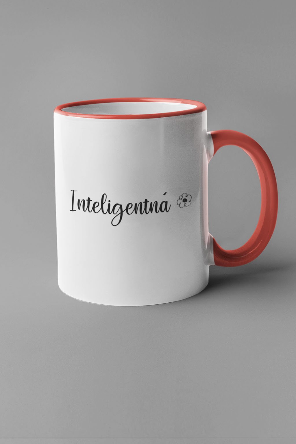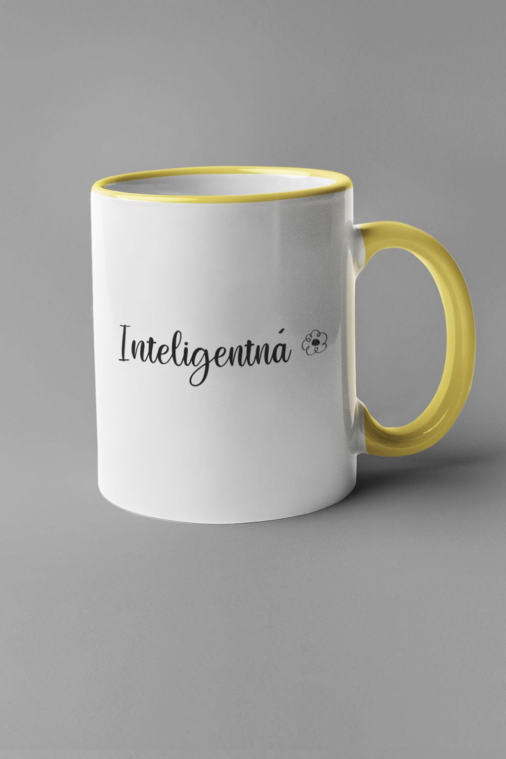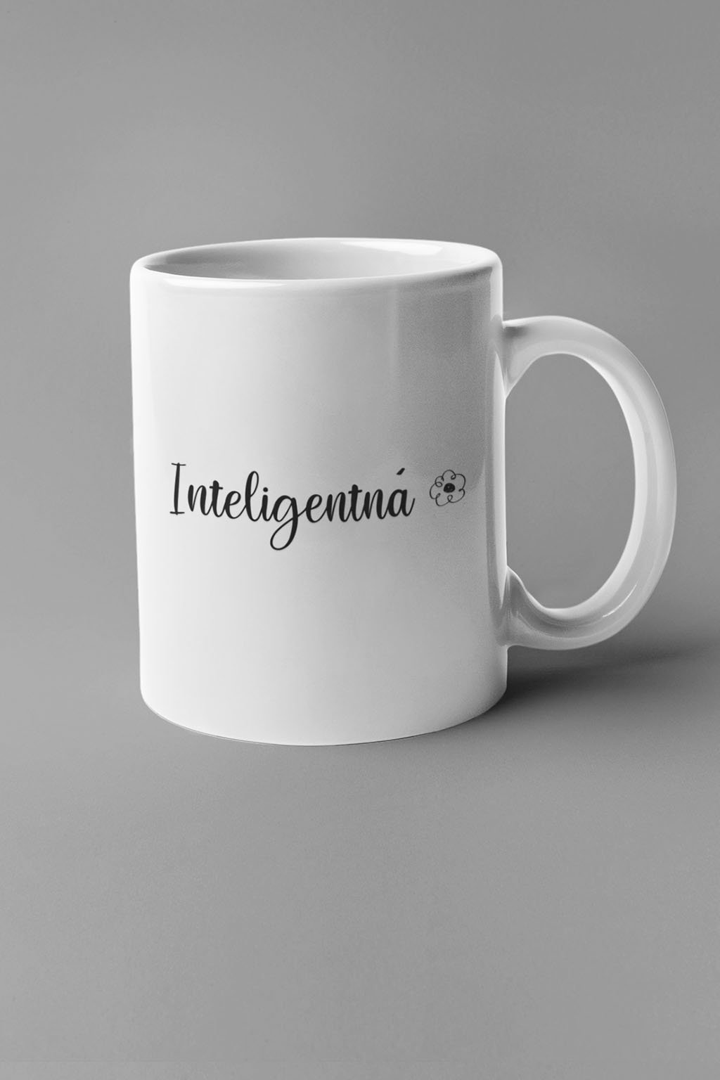 Biely keramický hrnček so slovenským prídavným menom. Na šálke je jedno slovo, ktoré ťa presne vystihne: ,,Inteligentná."