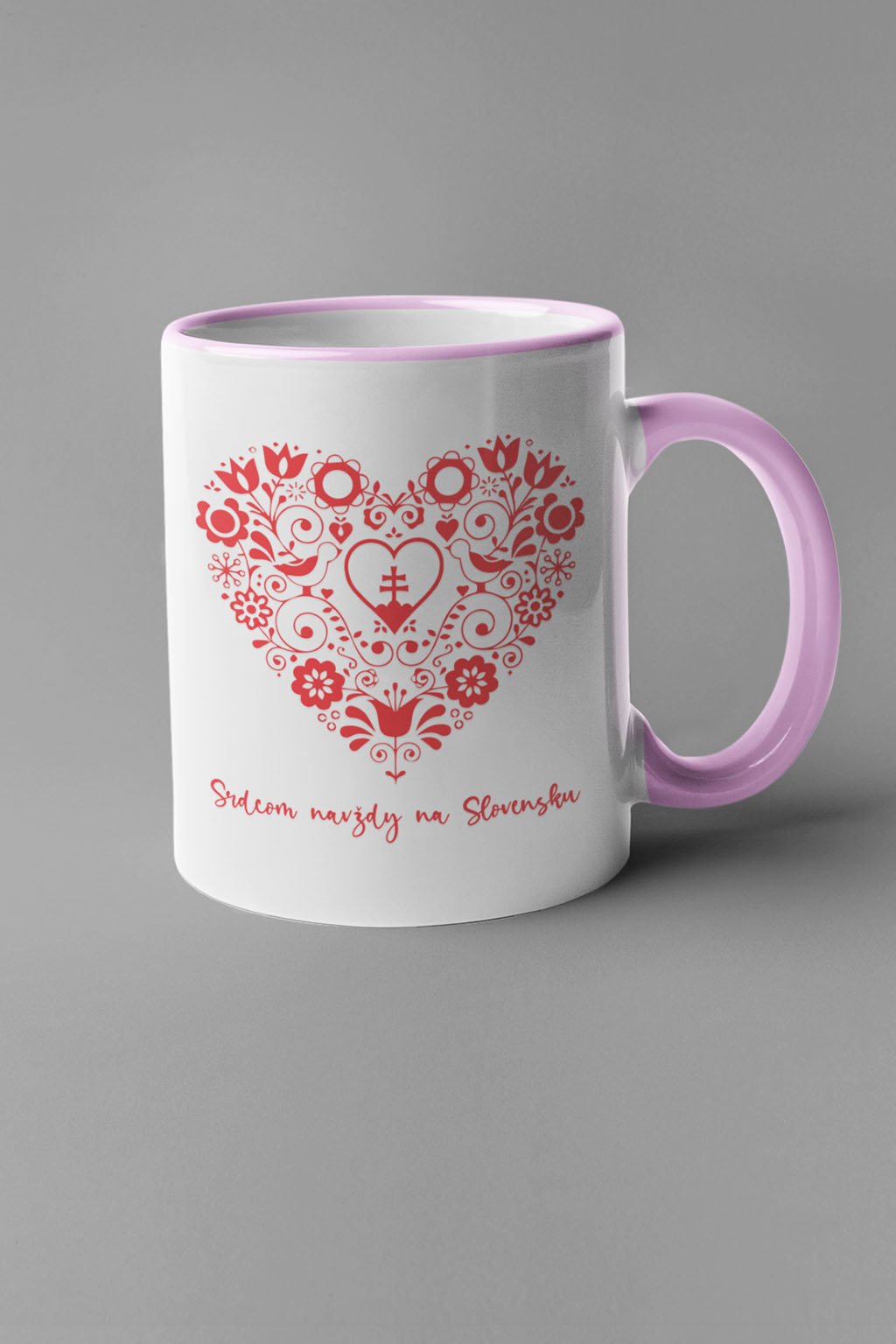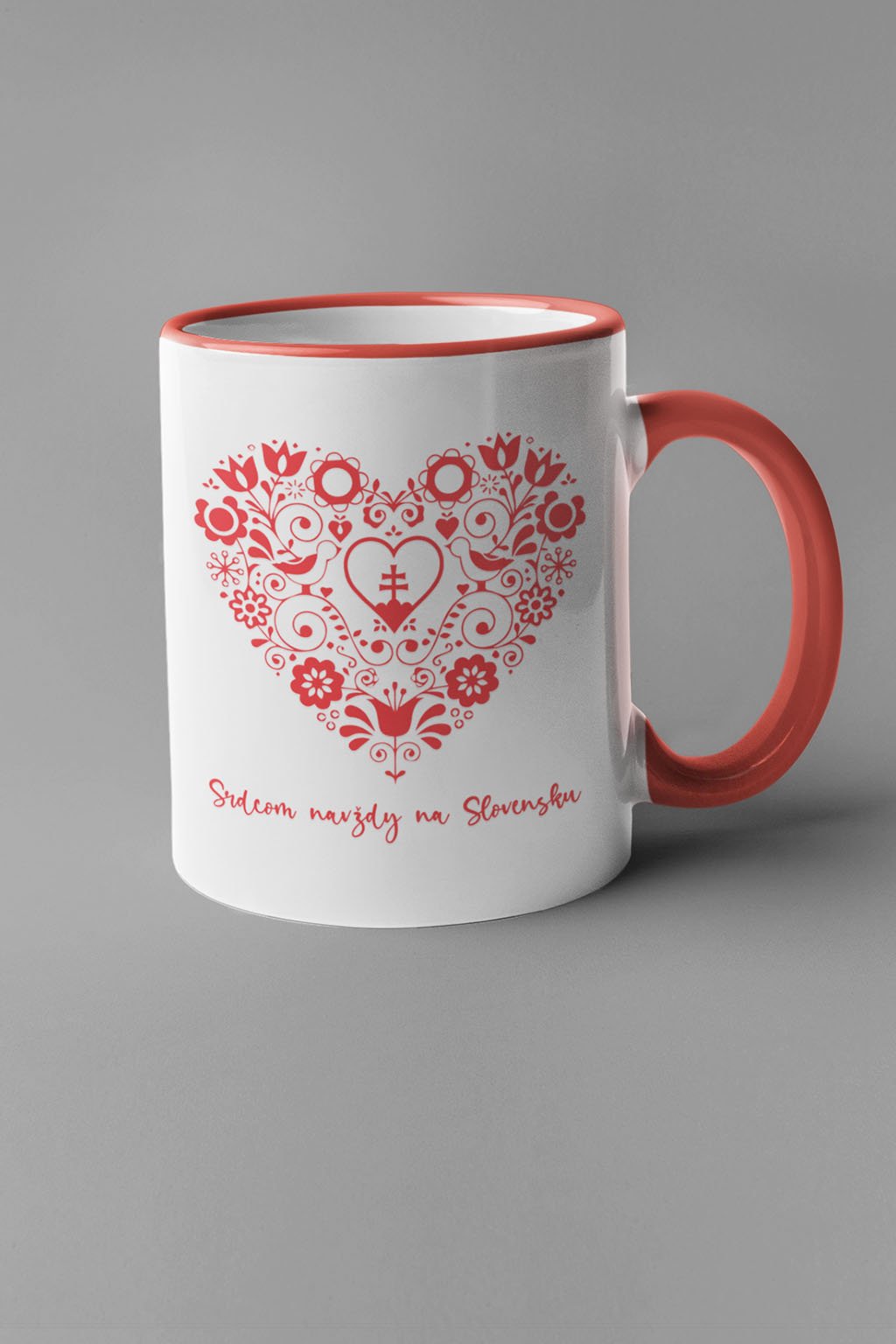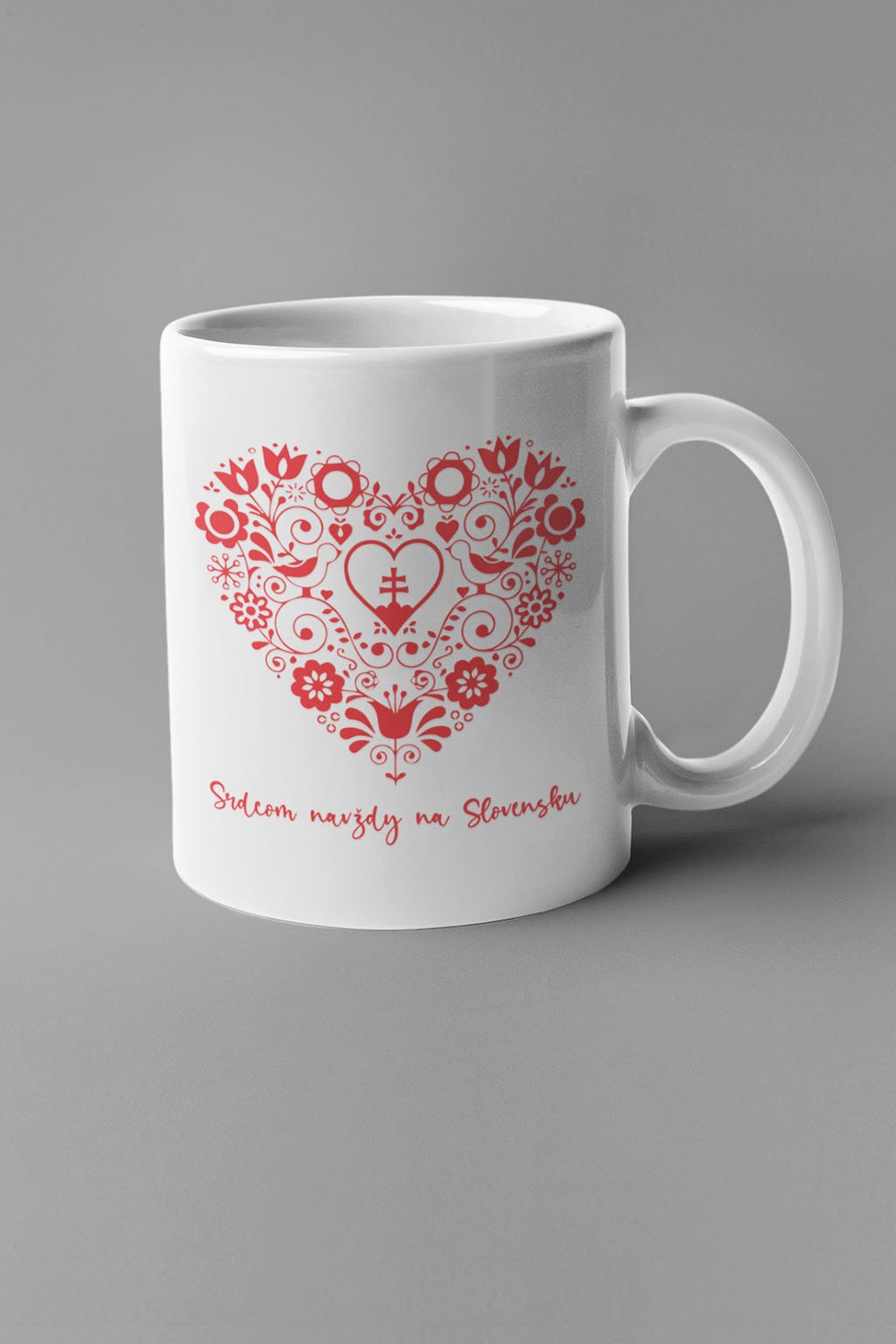 Biely keramický hrnček pre hrdého Slováka alebo hrdú Slovenku. Na šálke je nápis "Srdcom navždy na Slovensku".