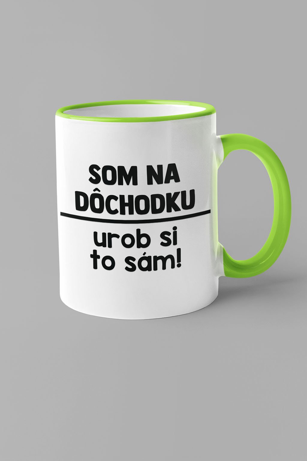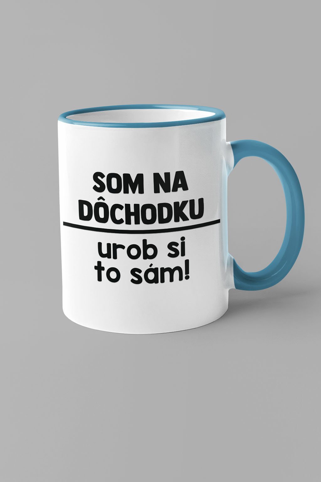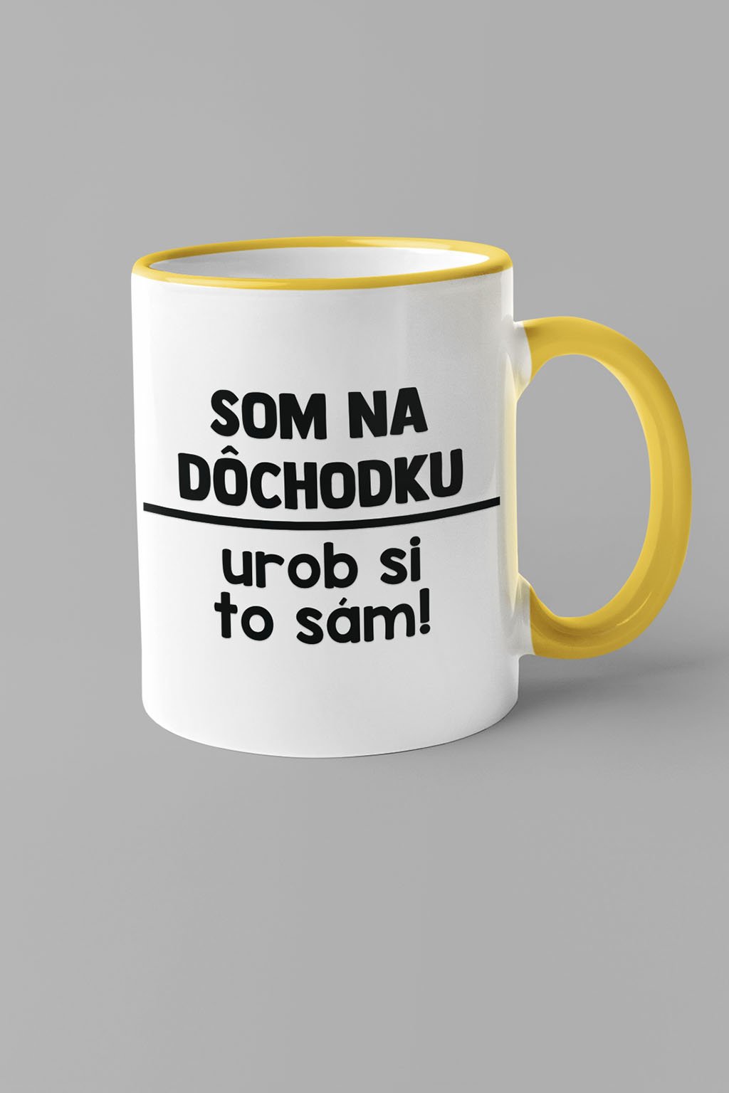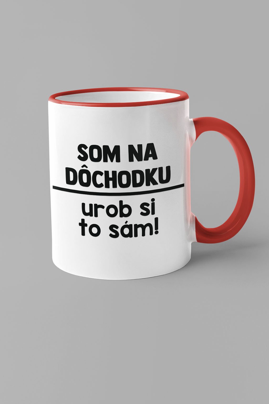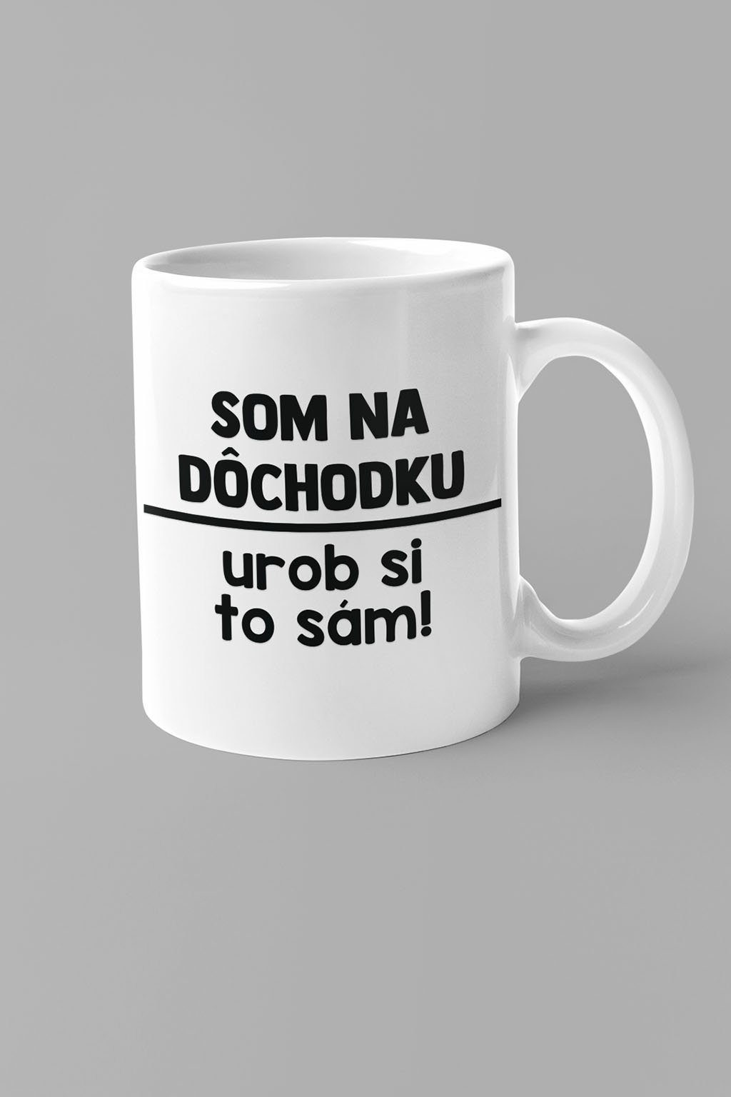 Biely keramický hrnček, na ktorom je vtipný nápis "SOM NA DÔCHODKU, UROB SI TO SÁM!" Šálka je vhodná pre ženy aj pre mužov.