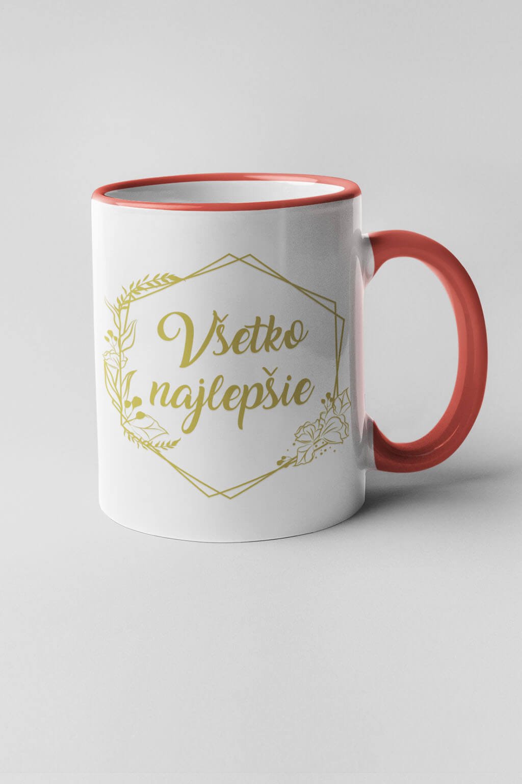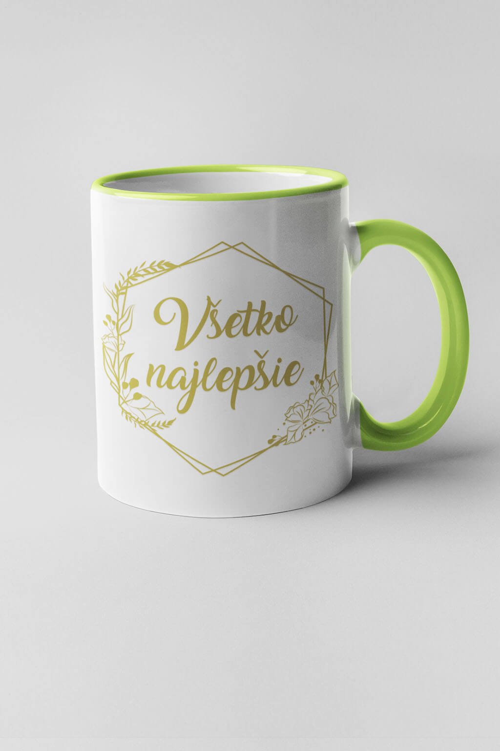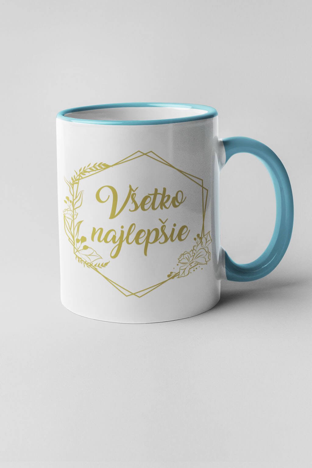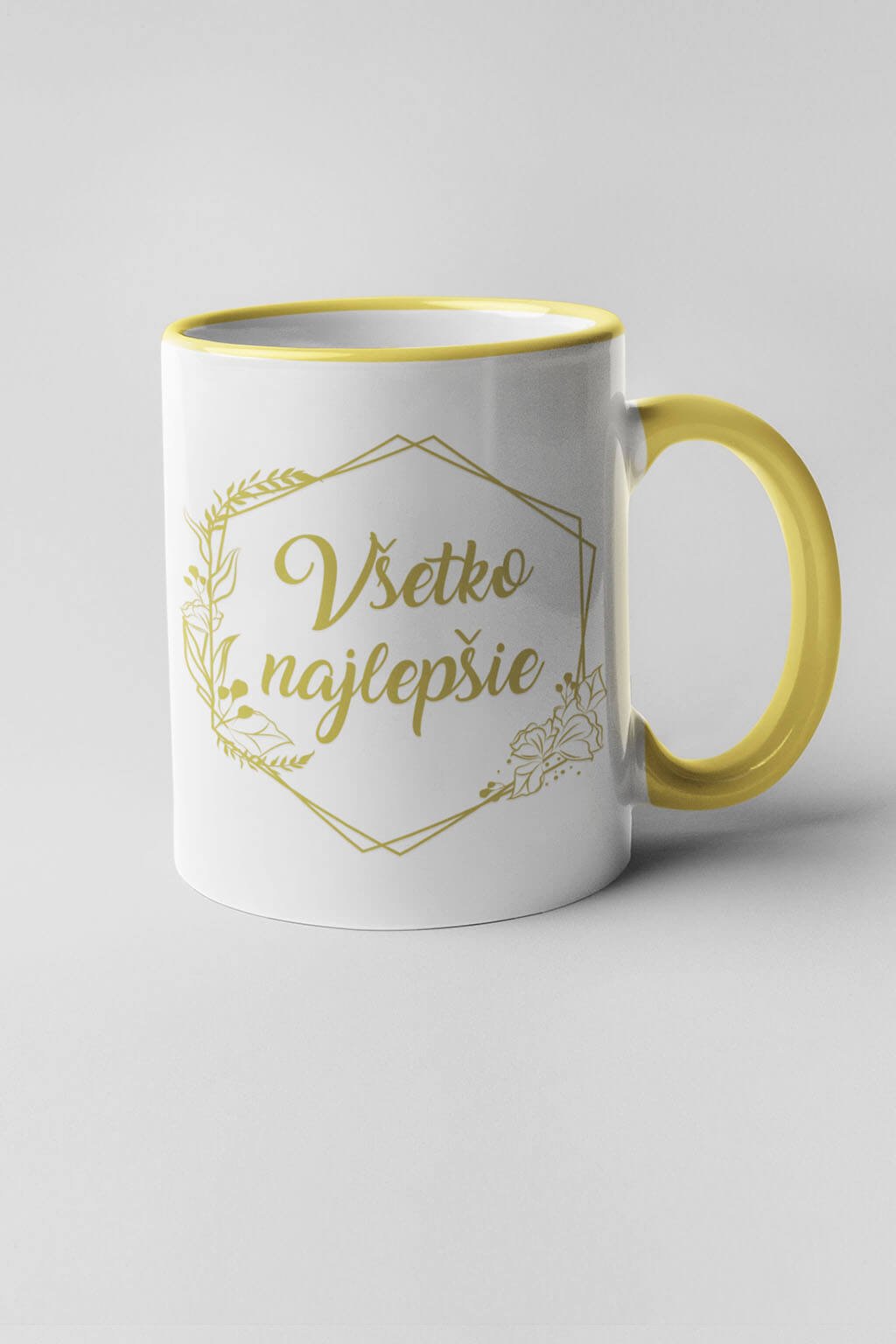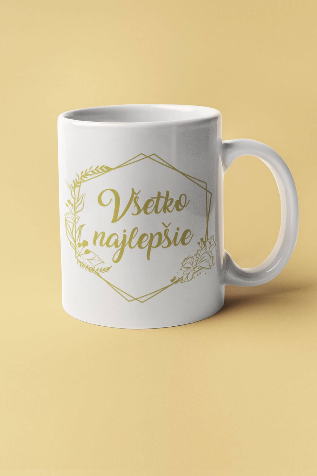 Biely keramický hrnček pre všetkých, ktorí radi pijú kávu alebo čaj. Na šálke je nápis "VŠETKO NAJLEPŠIE."