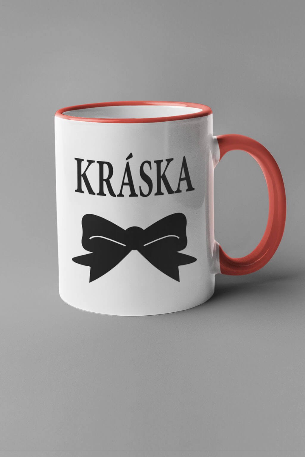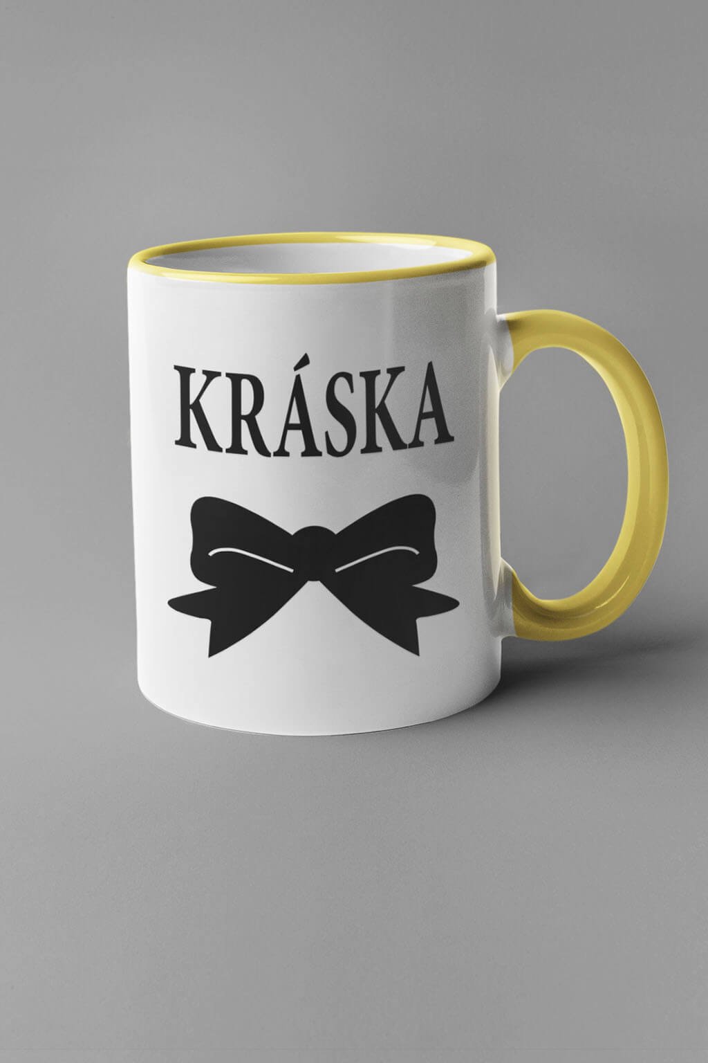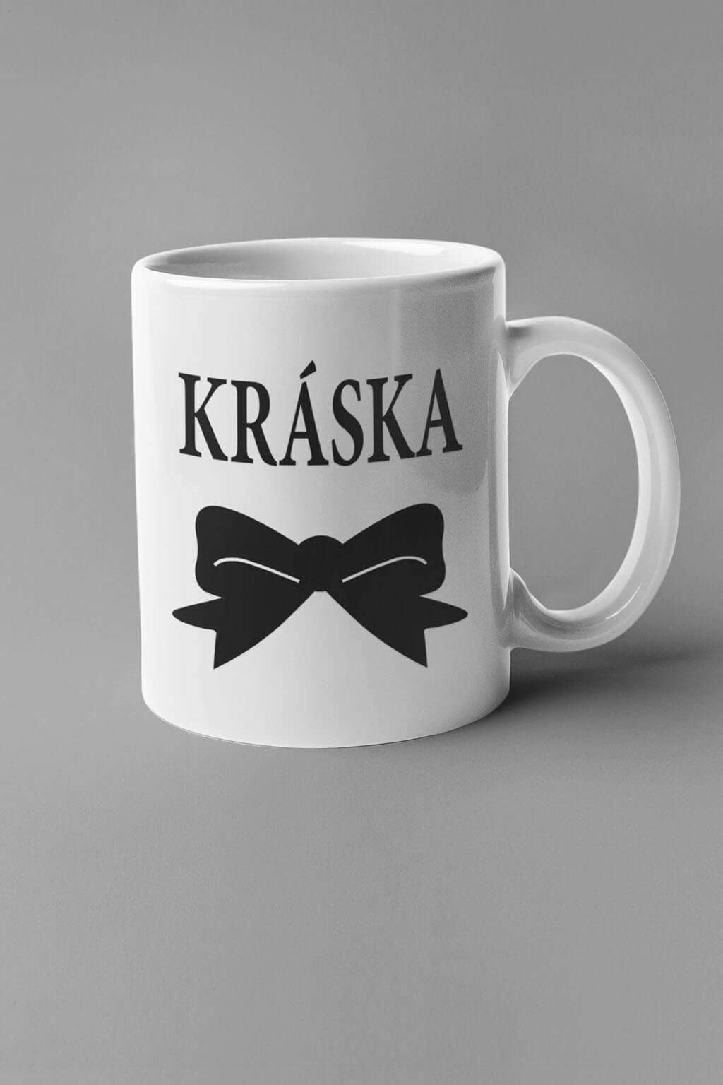 Biely keramický hrnček pre všetkých zaľúbených. Pánska šálka s nápisom: ,,Zviera," a pod ním obrázok činiek a na dámskej šálka je nápis: ,,Kráska," a pod ním obrázok mašličky.