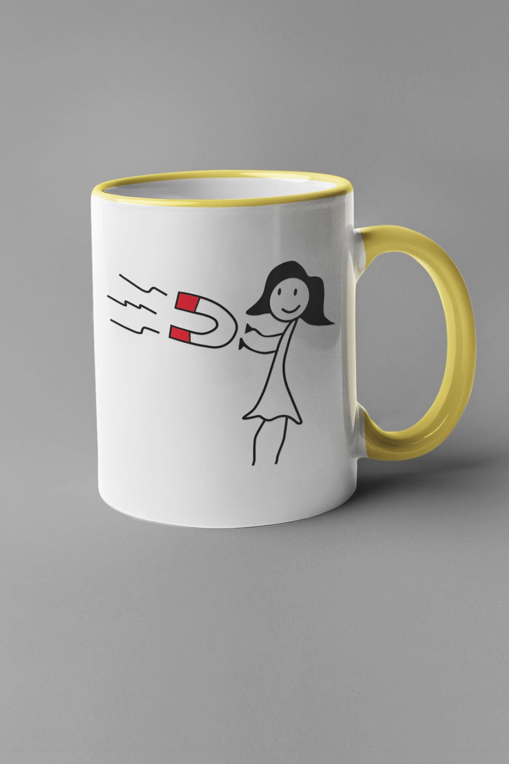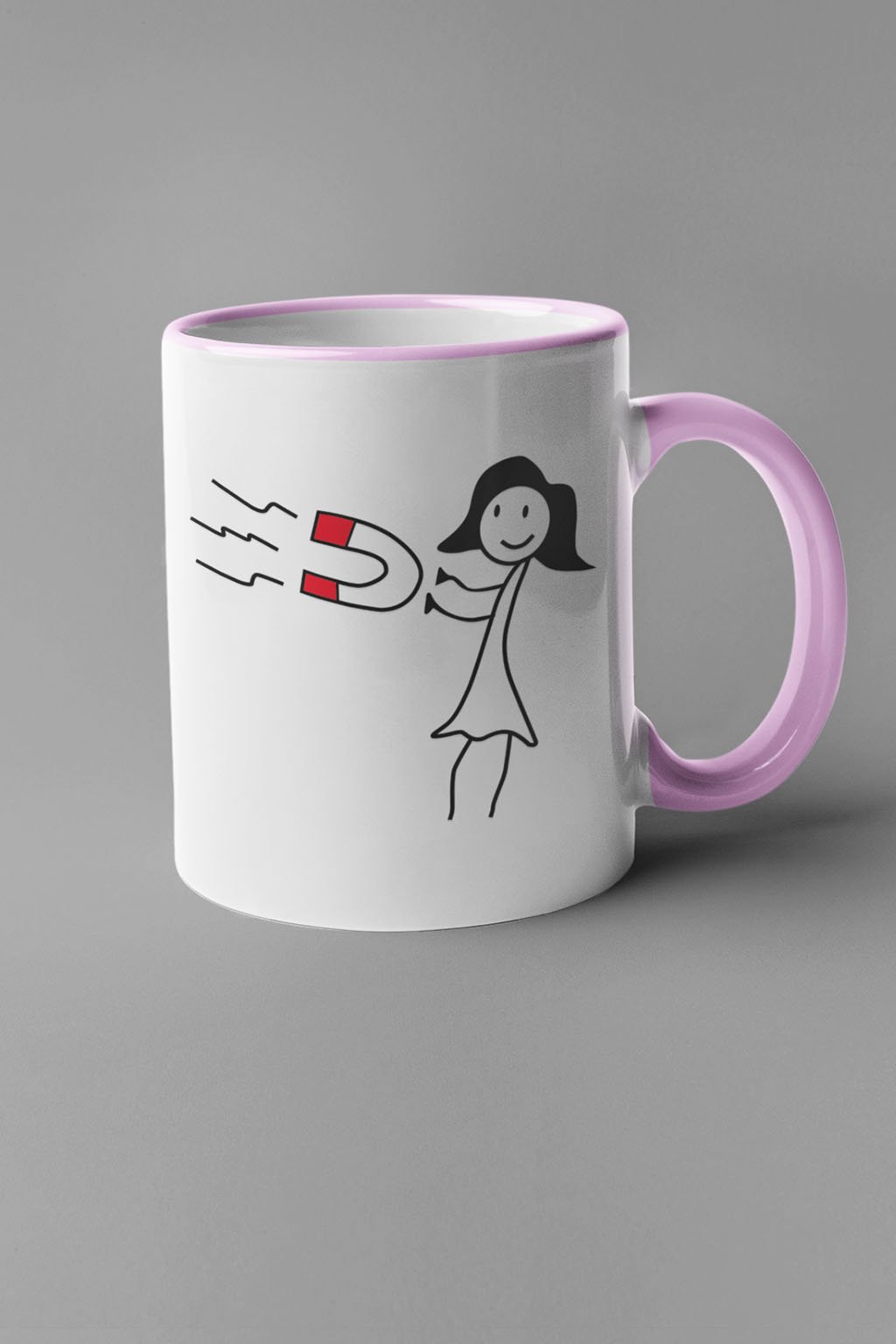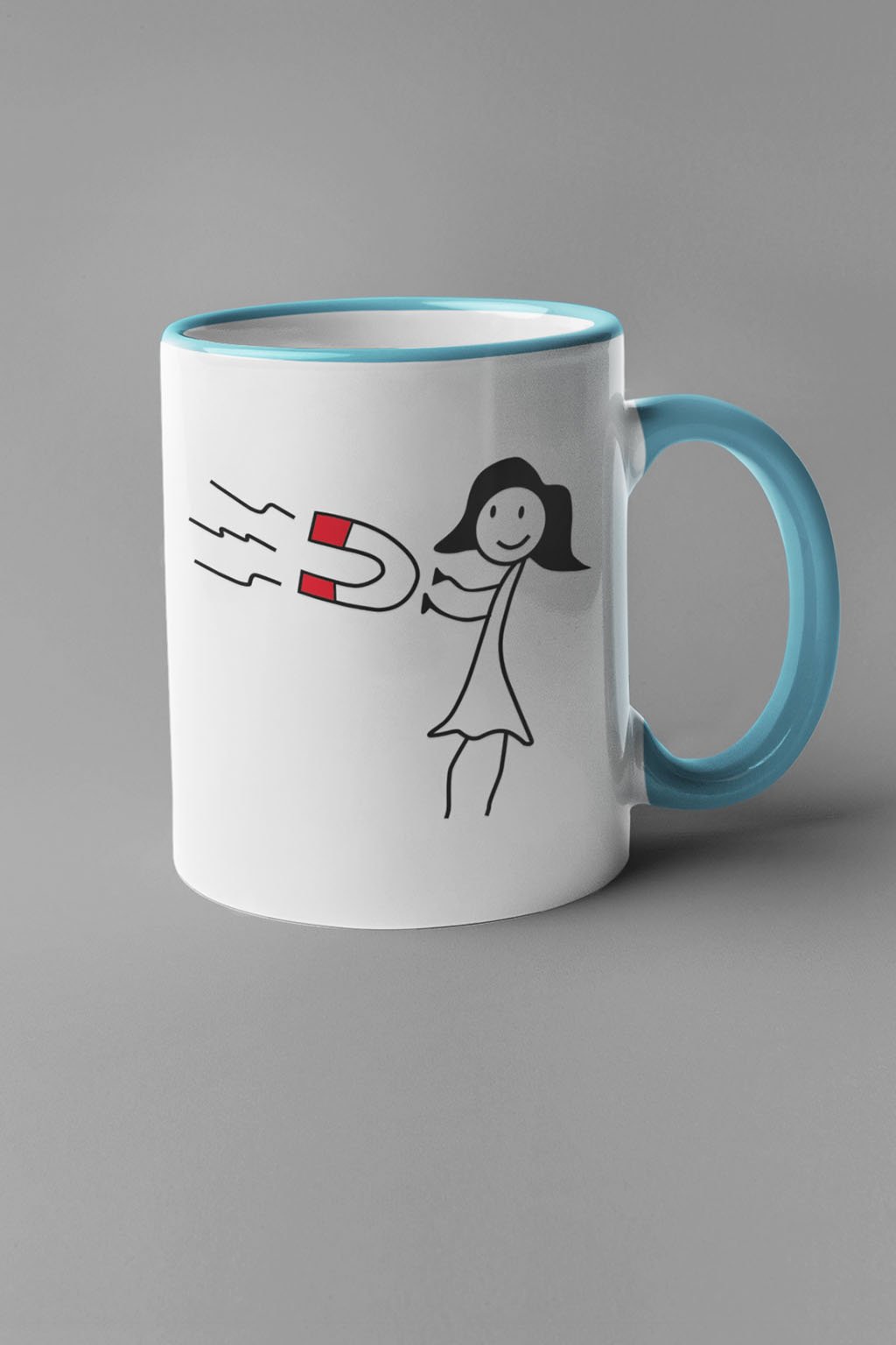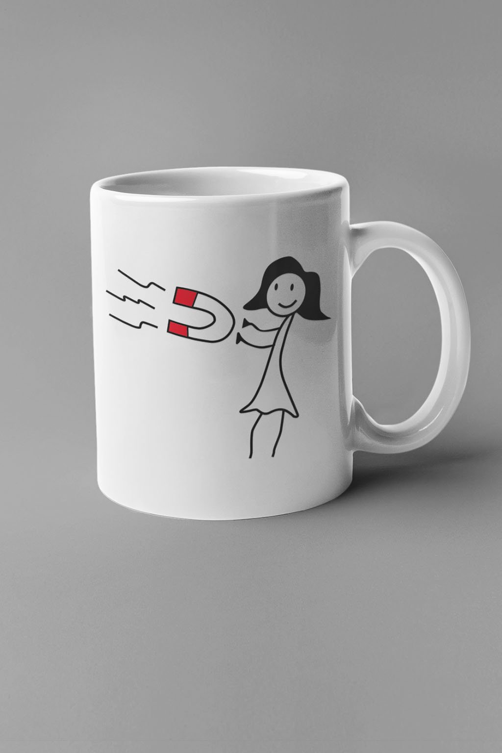 Biely keramický hrnček pre všetkých zaľúbených. Dámska šálka má obrázok postavičku dievčaťa s magnetom a pánska šálka postavičku chlapca so srdiečkom.