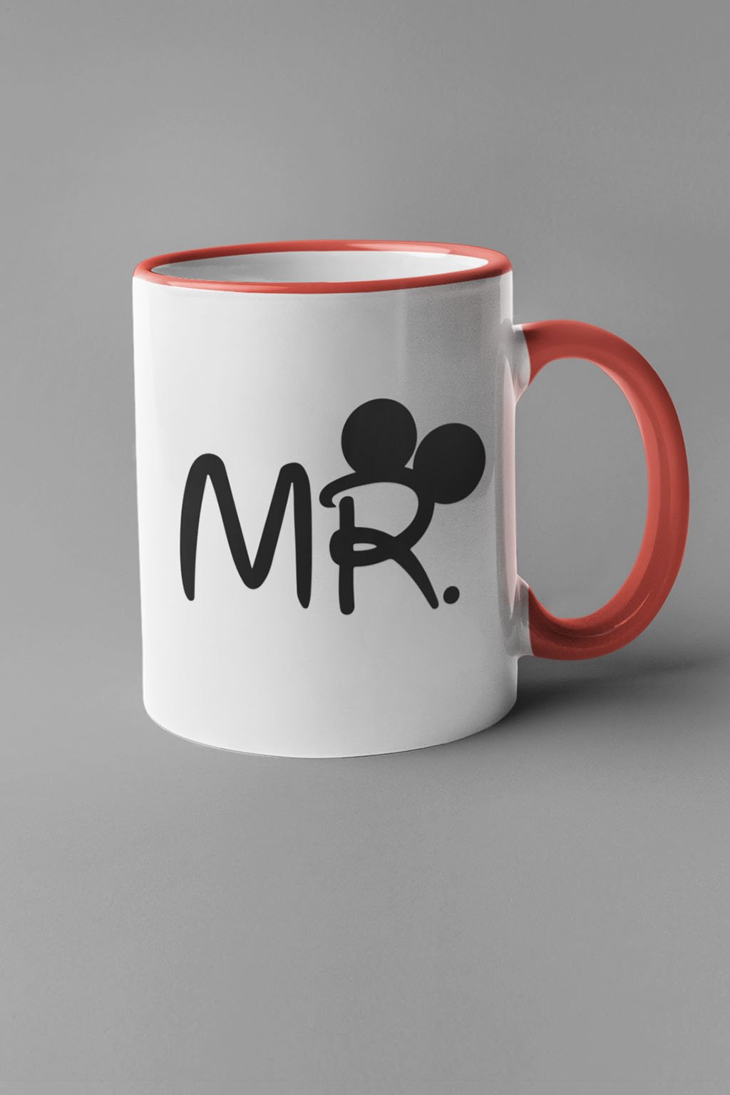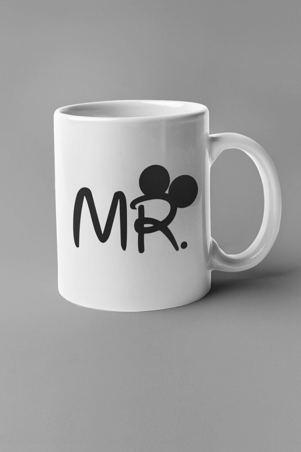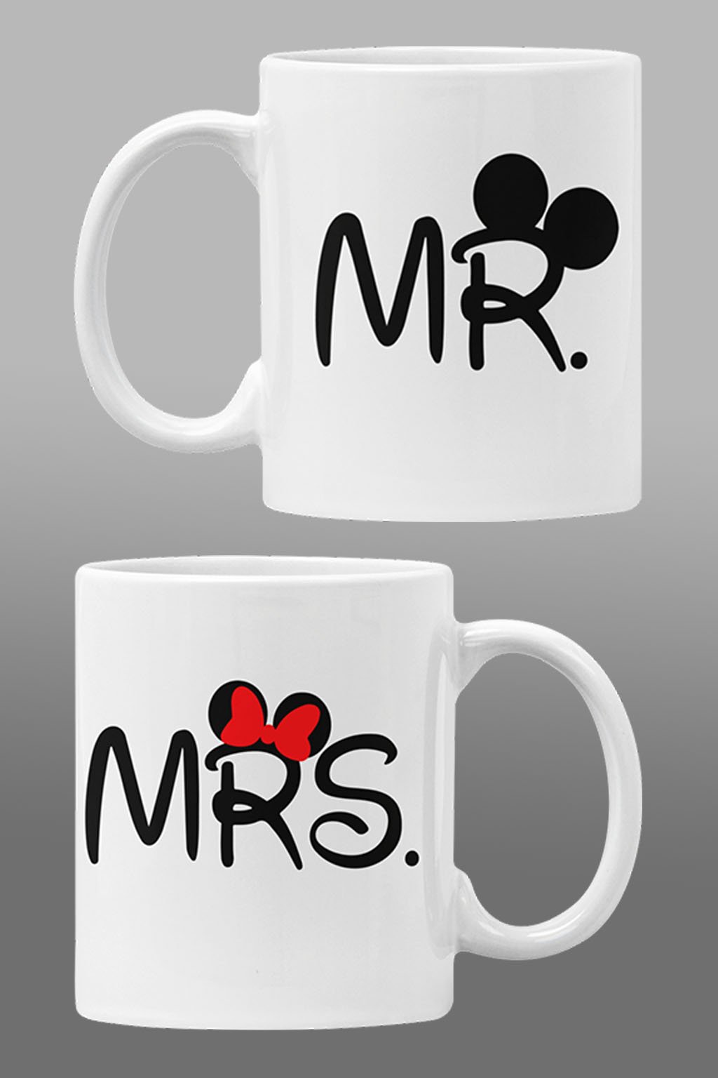 Biely keramický hrnček pre všetkých zaľúbených. Na pánskej šálke je skratka MR. s Mickeyho uškami. Dámska šálka má skratku MRS. s Minniemi uškami a červenou mašľou.
