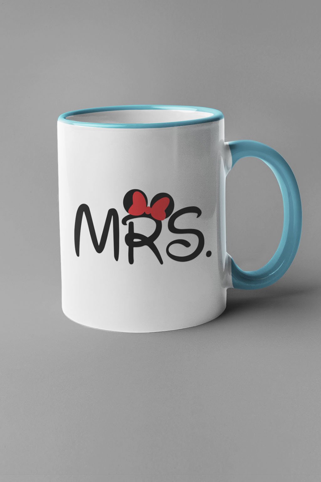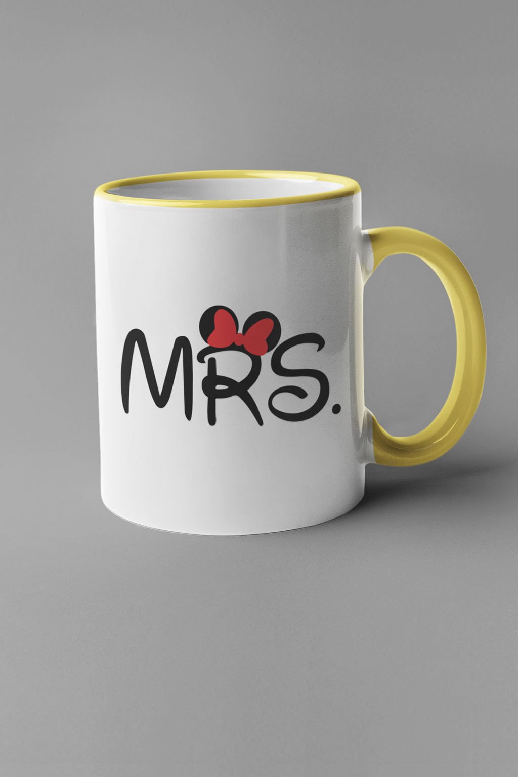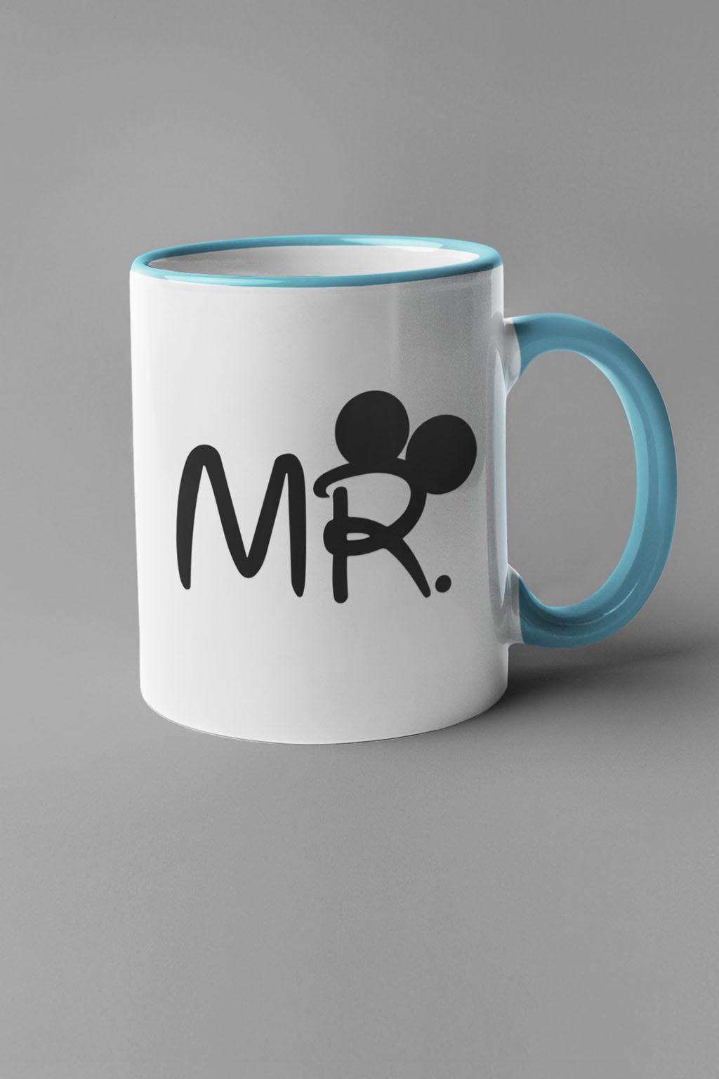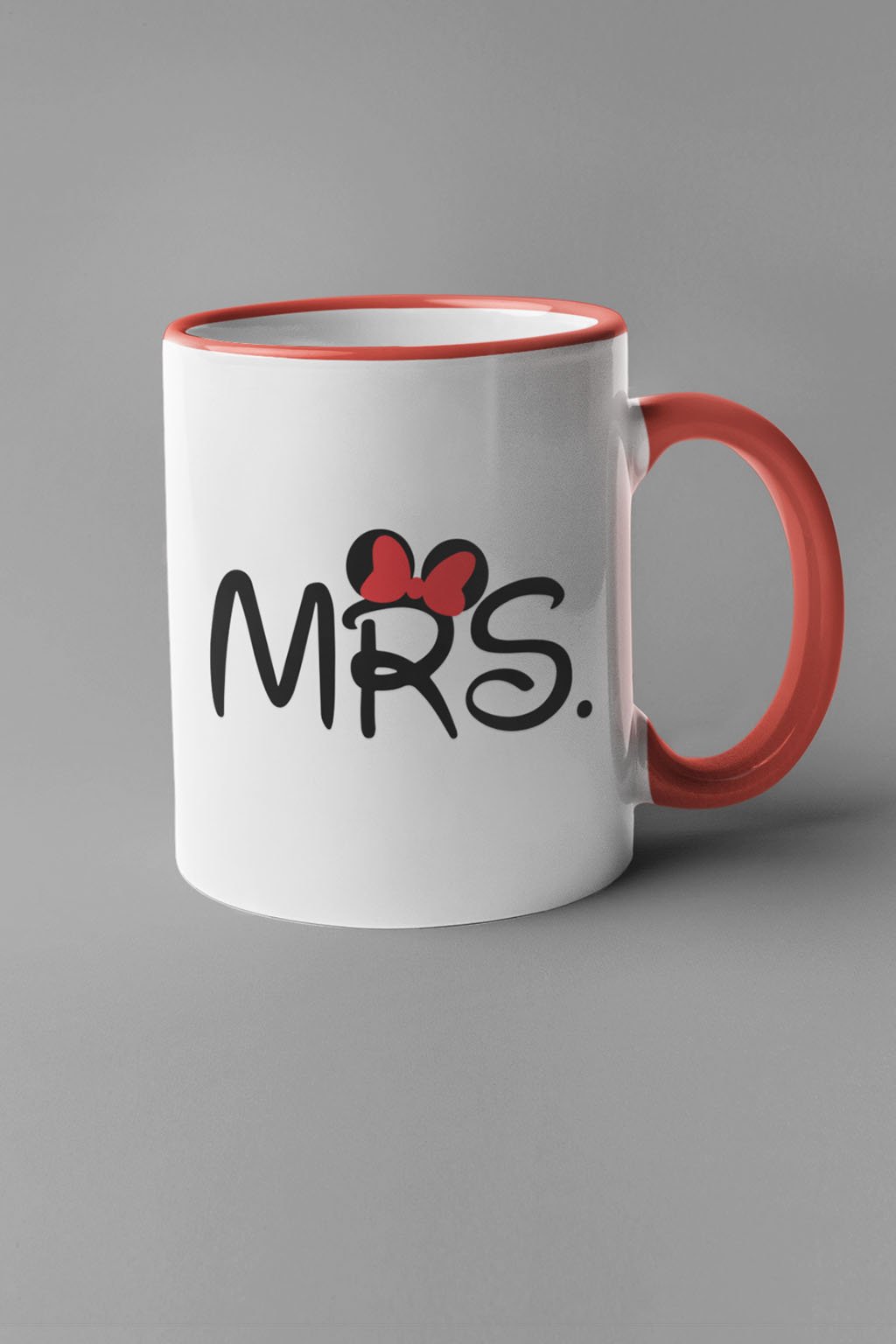 Biely keramický hrnček pre všetkých zaľúbených. Na pánskej šálke je skratka MR. s Mickeyho uškami. Dámska šálka má skratku MRS. s Minniemi uškami a červenou mašľou.