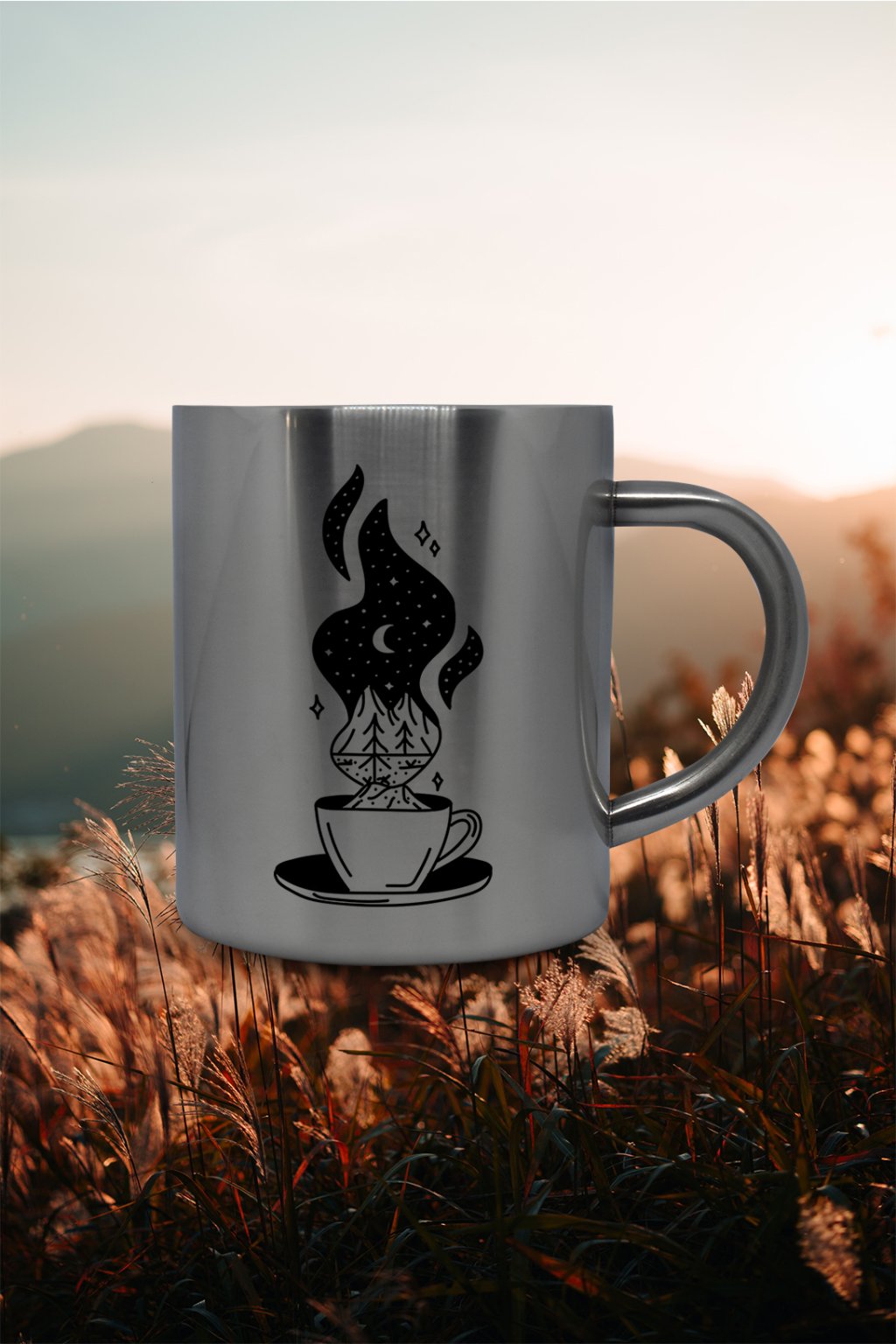 Termohrnček, na ktorom je obrázok šálky. Hrnček je ako stvorený pre každého milovníka turistiky.
