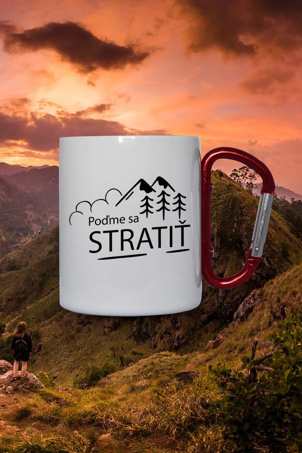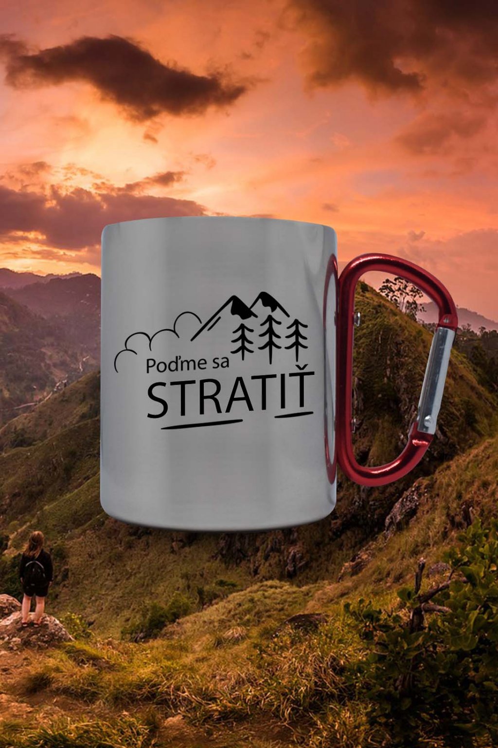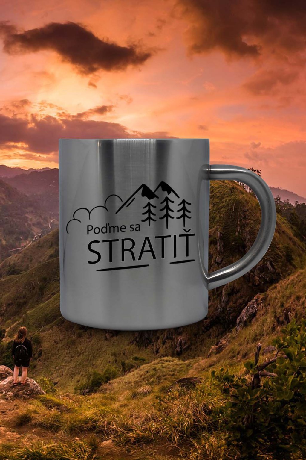 Termohrnček na ktorom je obrázok s motívom prírody a nápisom: ,,Poďme sa STRATIŤ." Hrnček je ideálny pre vášnivého turistu.
