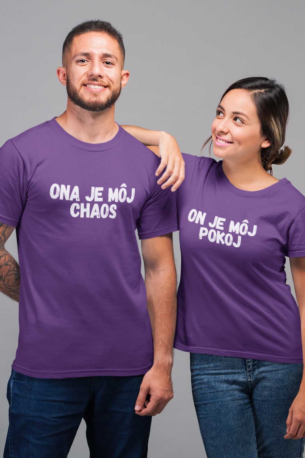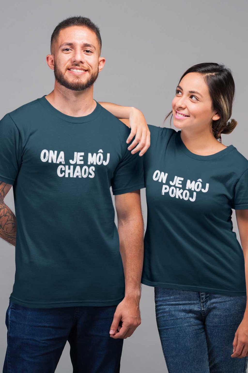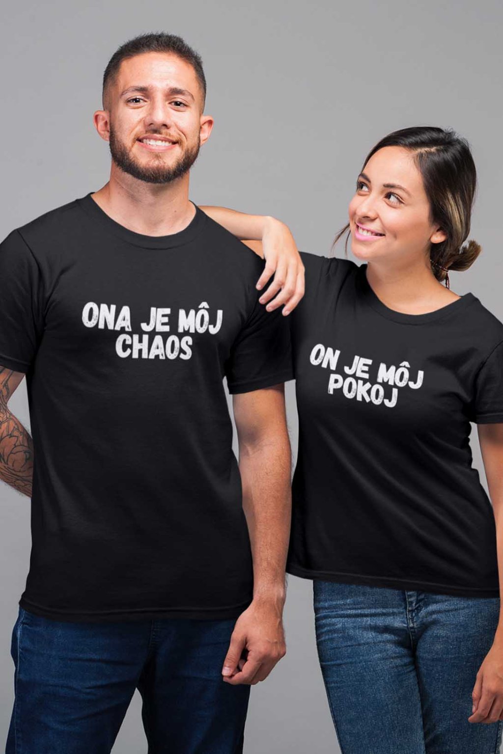 Bavlnené tričká pre s textom "Ona je môj chaos." pre pánske a dámske "On je môj pokoj.". Tričká, ktoré sa vzájomne dopĺňajú potešia všetkých zamilovaných.