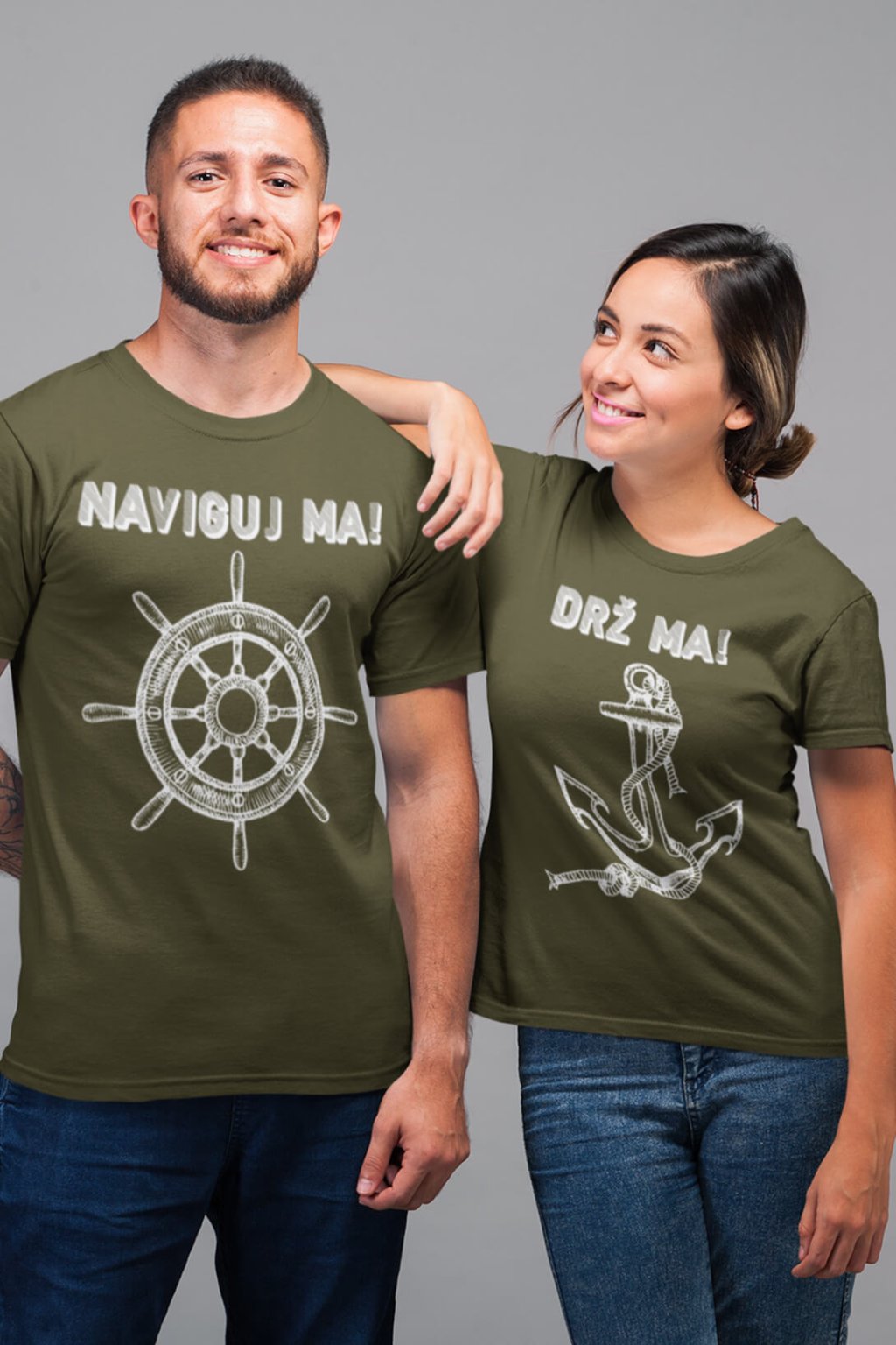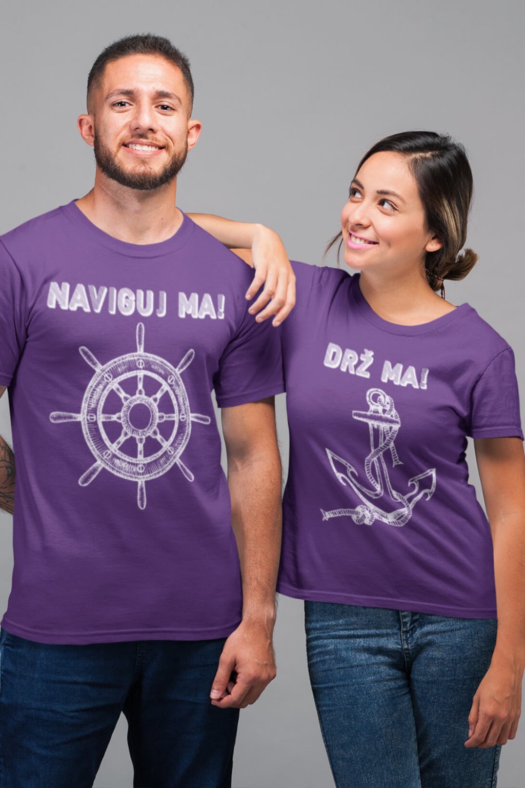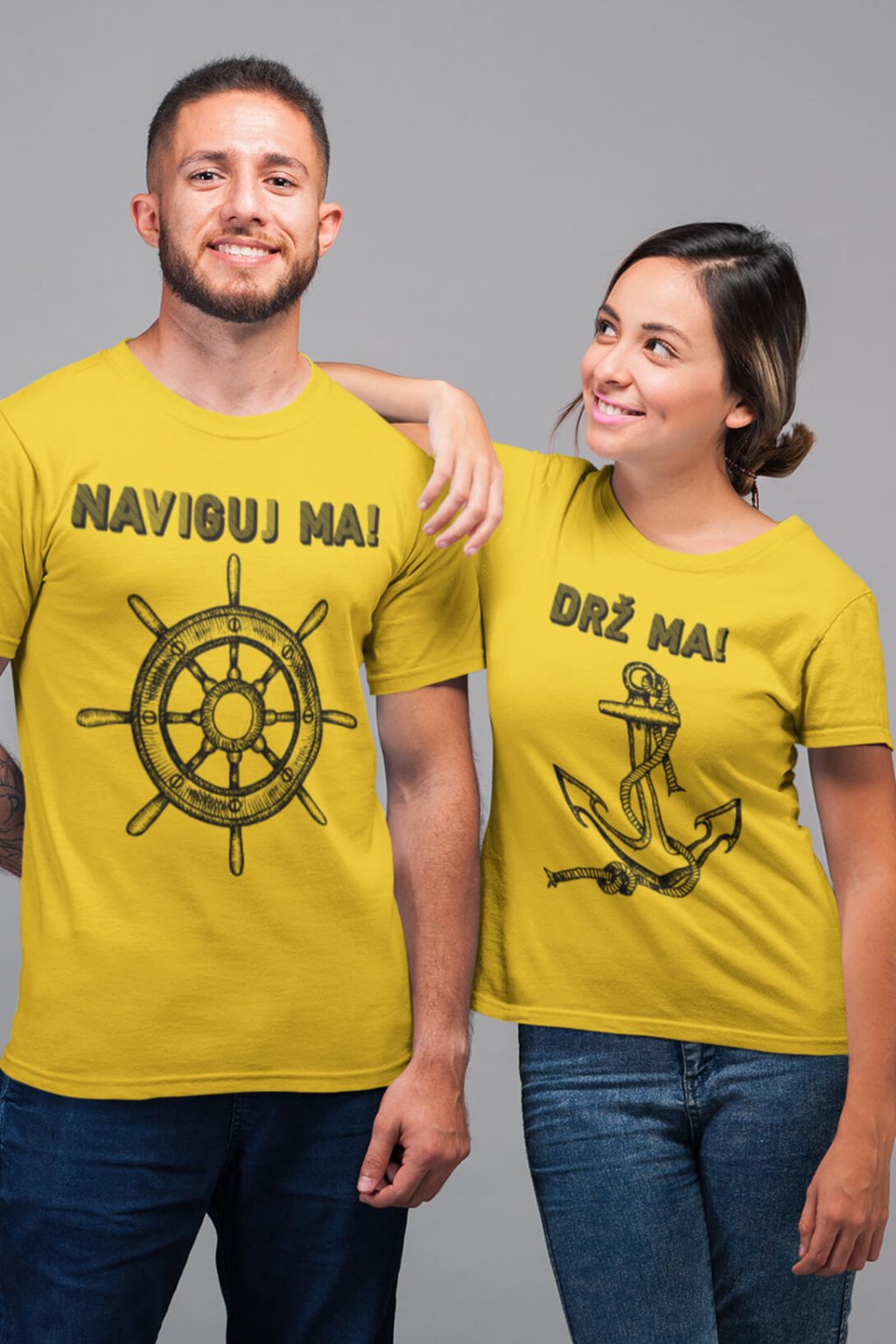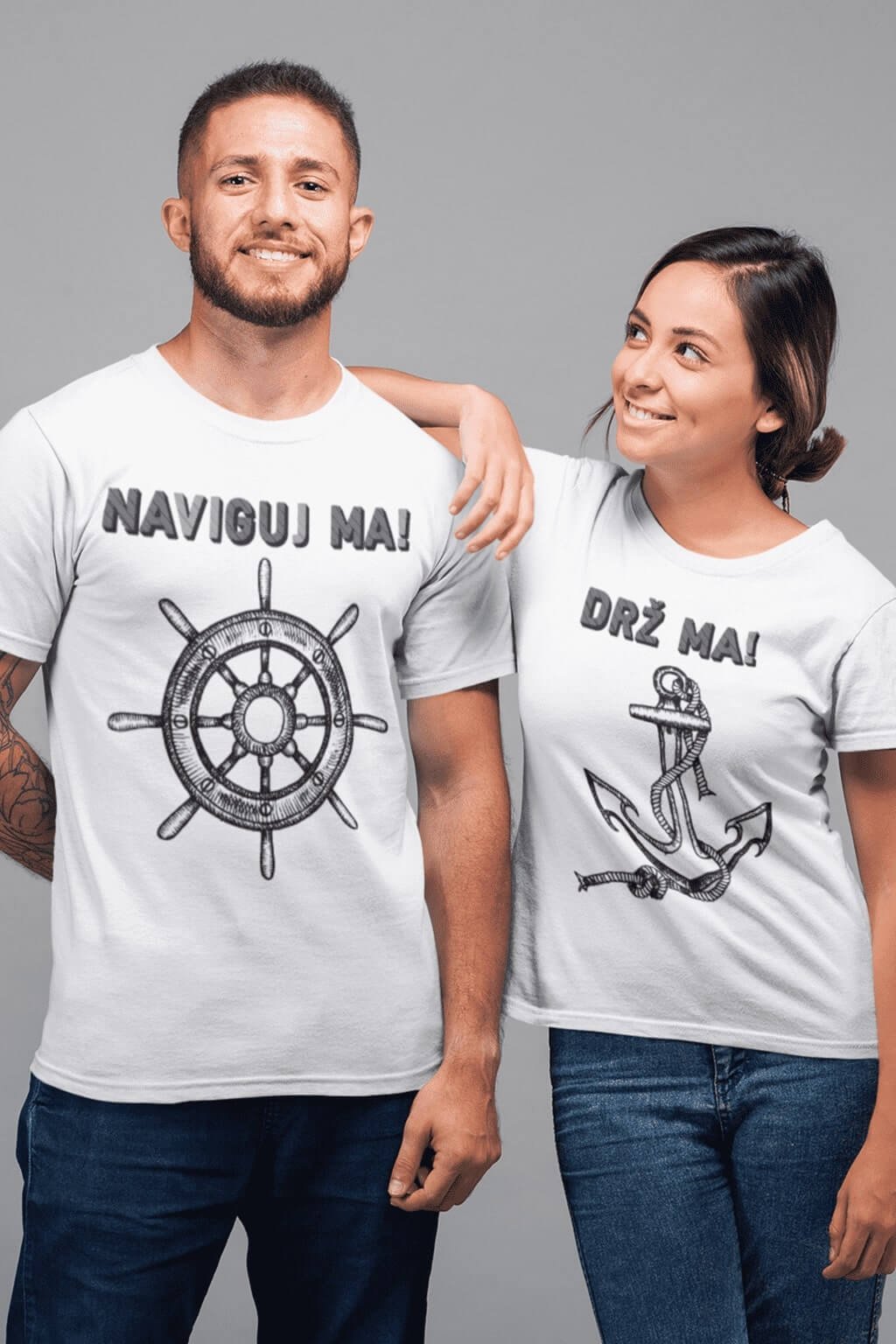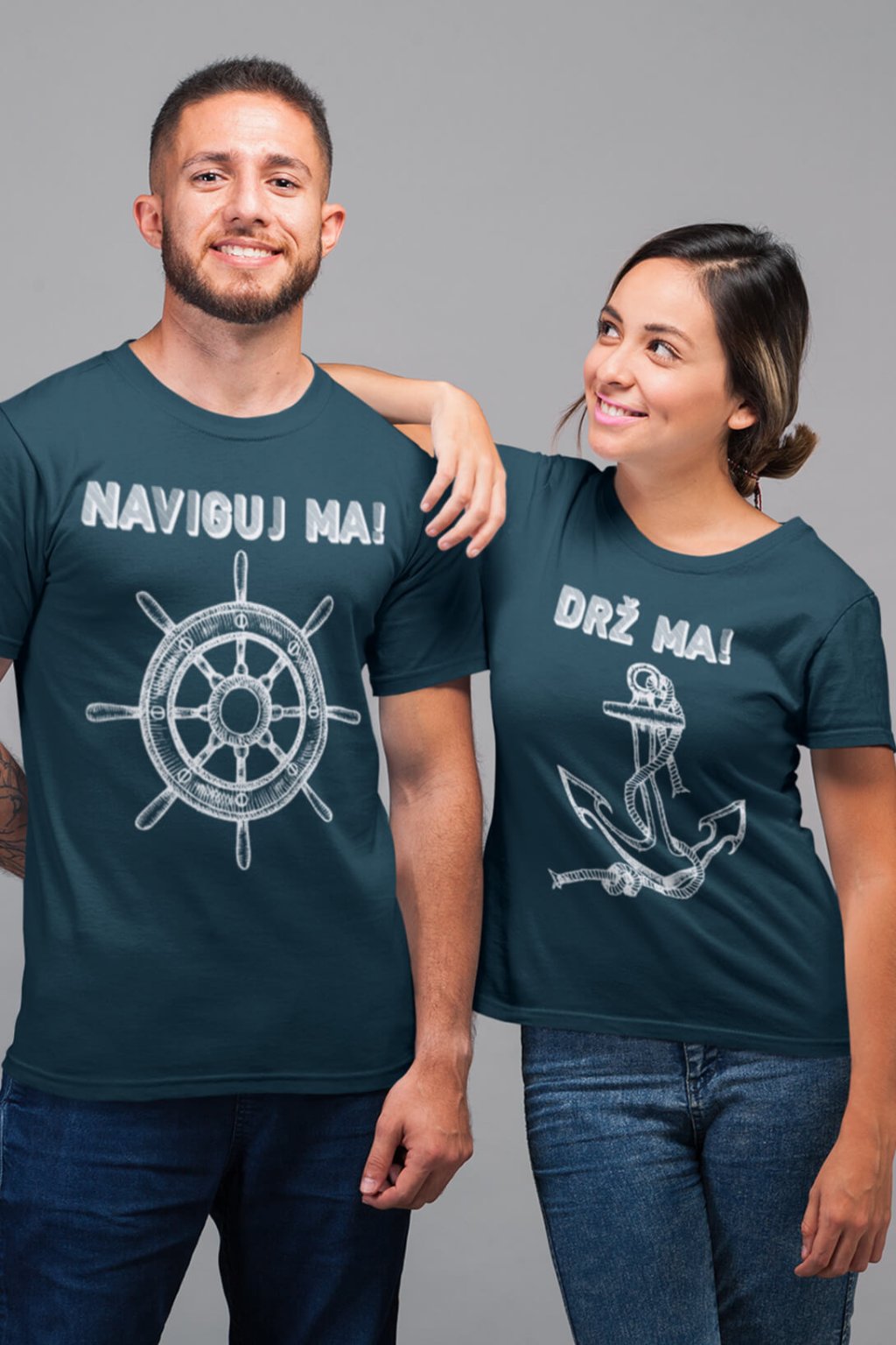 Bavlnené tričká pre páry s roztomilou potlačou. Na pánskom tričku je obrázok kormidla s nápisom: ,,Naviguj ma!" Dámy majú na svojom tričku obrázok kotvy, nad ktorou je nápis: ,,Drž ma!