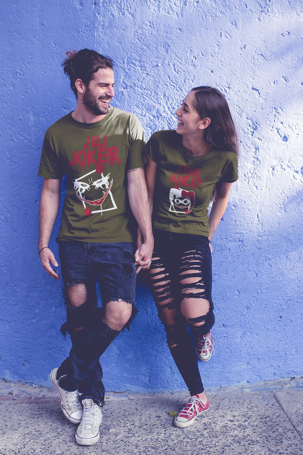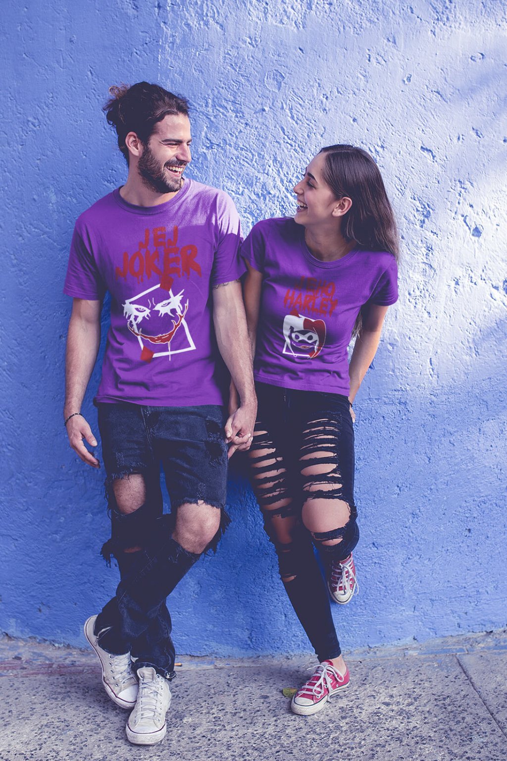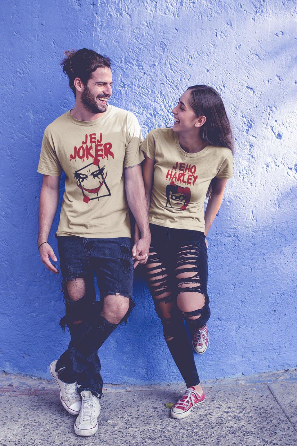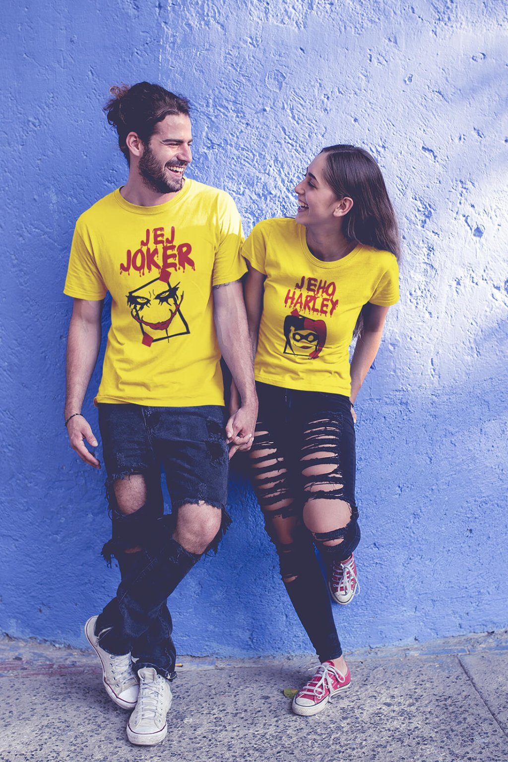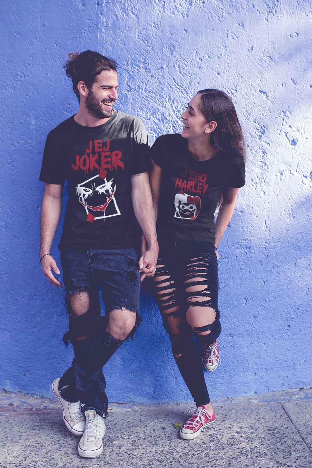 Bavlnené tričká pre páry s originálnou potlačou. Na pánskom tričku je nápis: „JEJ JOKER." Ženy majú nápis: „JEHO HARLEY."