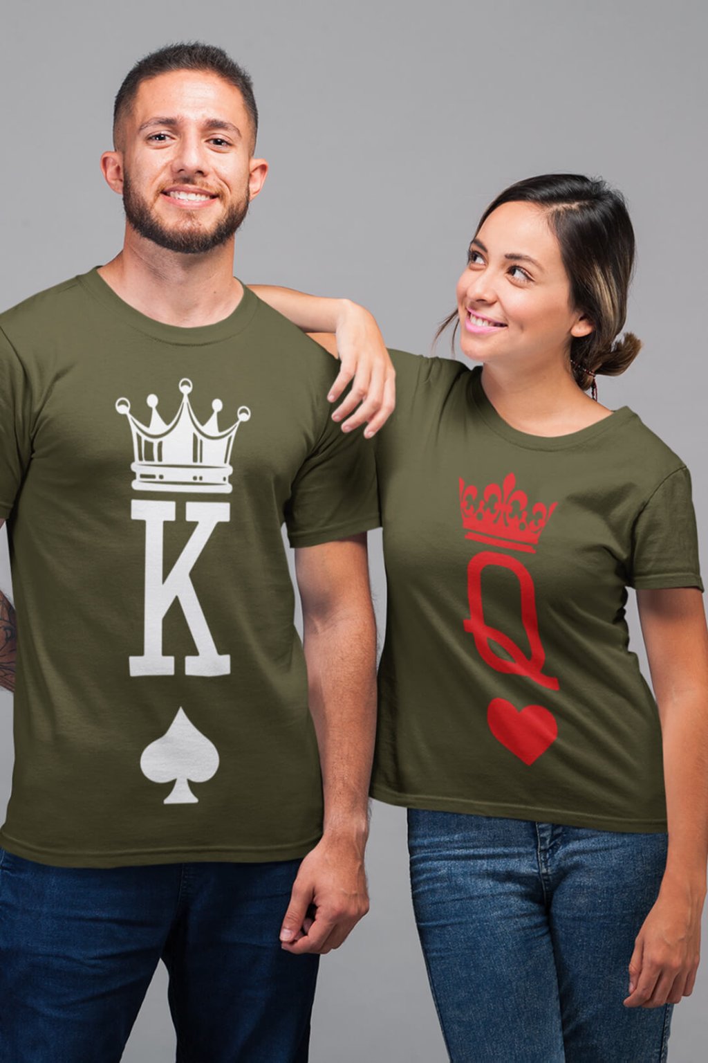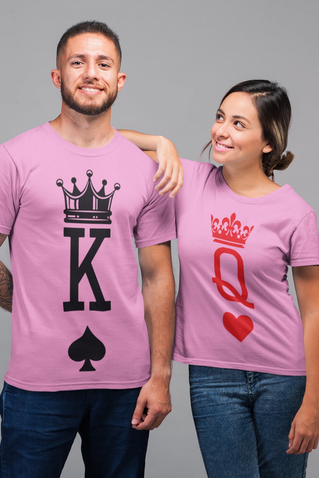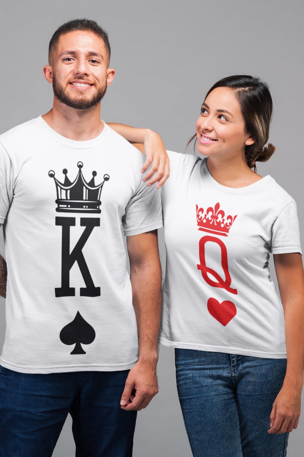 Bavlnené tričká pre páry s roztomilou potlačou. Na pánskom tričku je symbolický znak kráľa K z kariet aj s korunou čiernej/ bielej farby. Na dámskom tričku je znak kráľovnej Q s korunkou červenej farby.