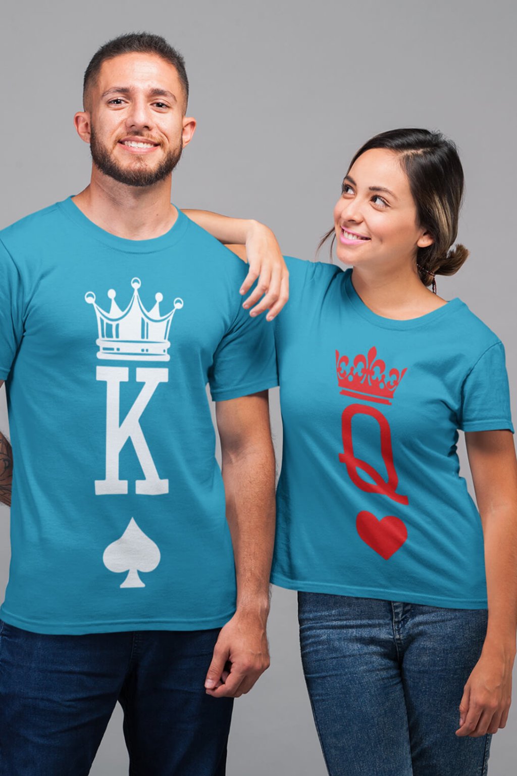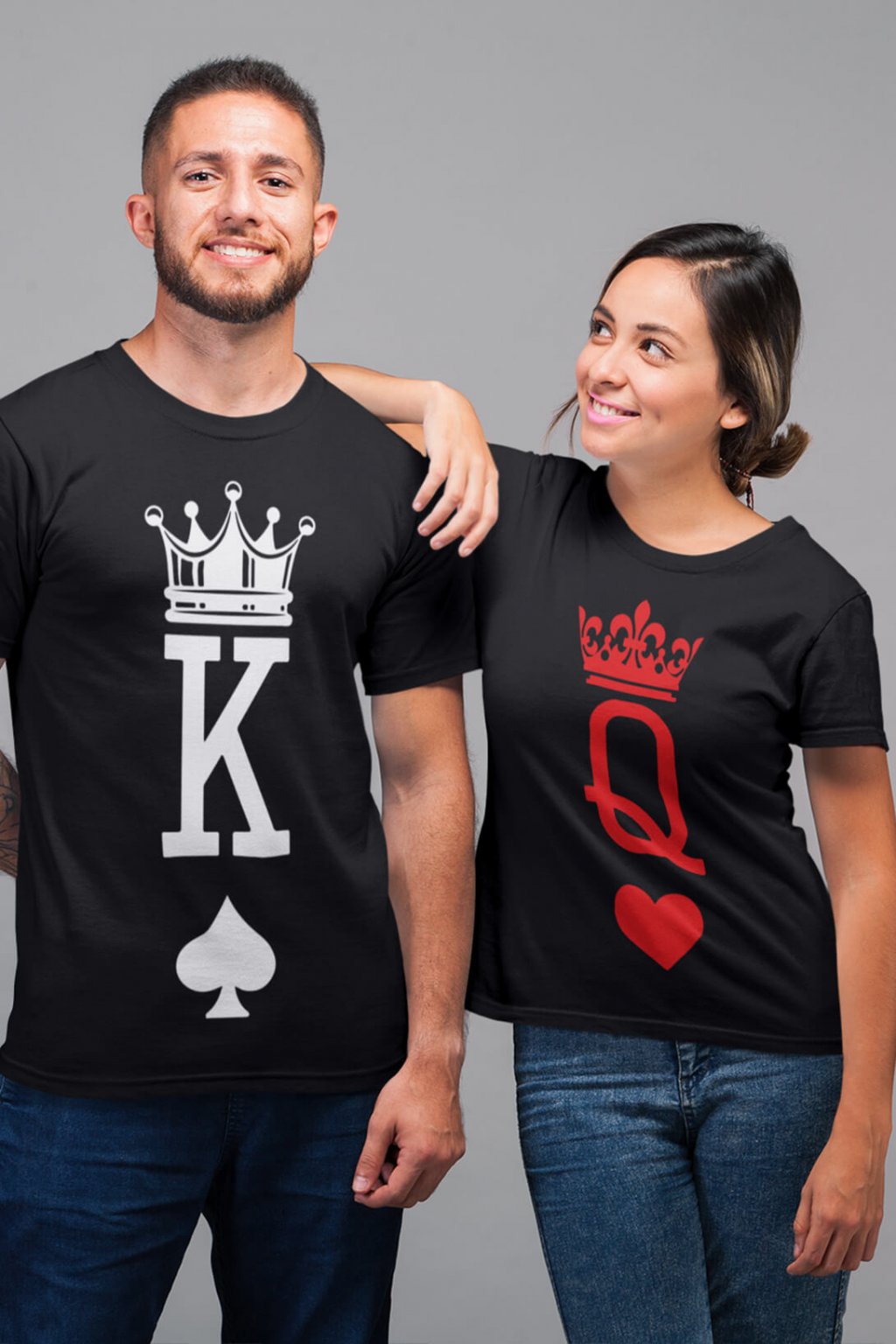 Bavlnené tričká pre páry s roztomilou potlačou. Na pánskom tričku je symbolický znak kráľa K z kariet aj s korunou čiernej/ bielej farby. Na dámskom tričku je znak kráľovnej Q s korunkou červenej farby. Tričká, ktoré sa vzájomne dopĺňajú potešia všetkých zamilovaných.