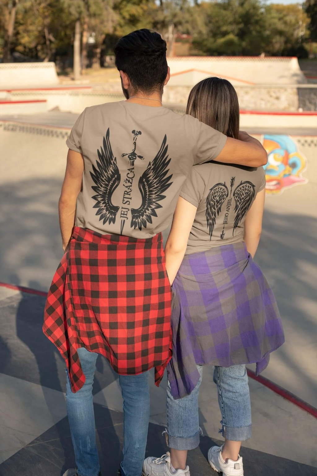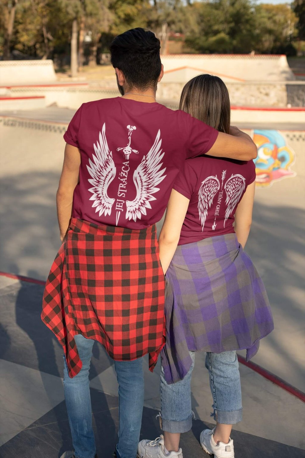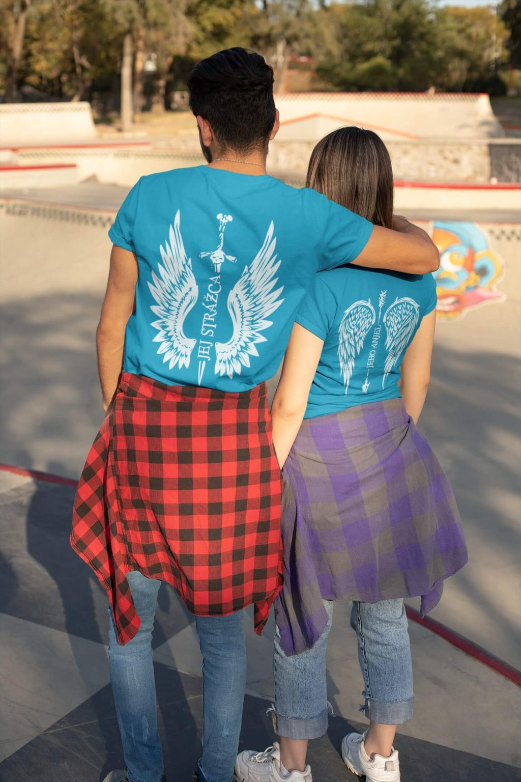 Bavlnené tričká pre páry s originálnou potlačou. Na obidvoch tričkách je obrázok krídeľ. Na pánskom tričku je nápis: „JEJ STRÁŽCA" Ženy majú nápis: "JEHO ANJEL." Tričká, ktoré sa vzájomne dopĺňajú potešia všetkých zamilovaných.
