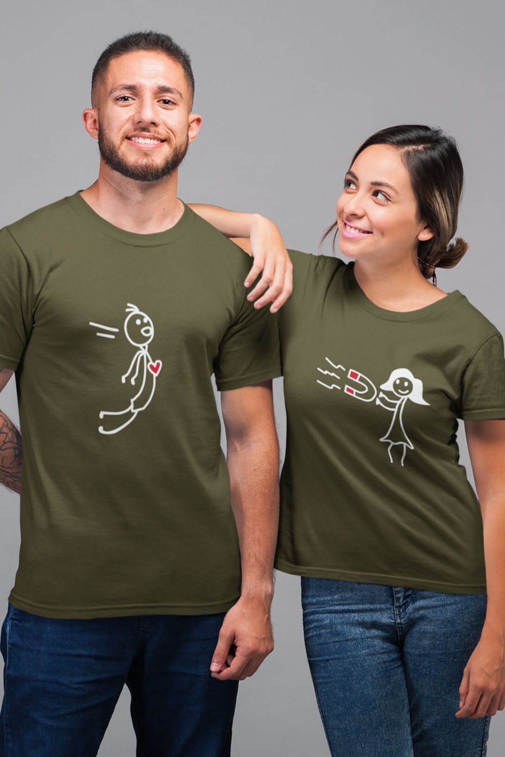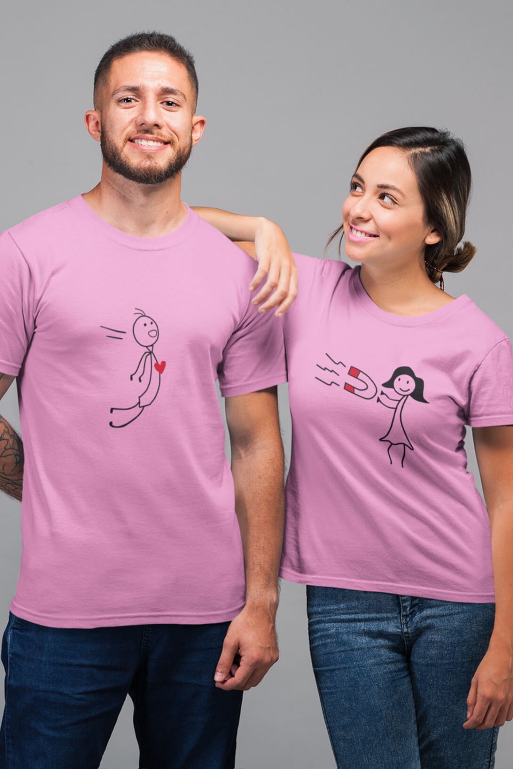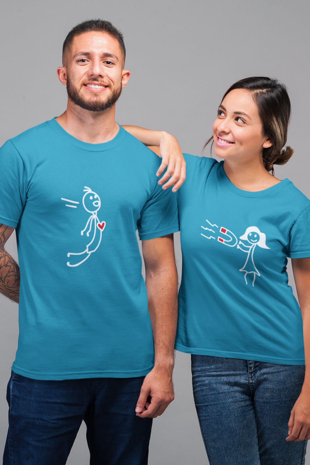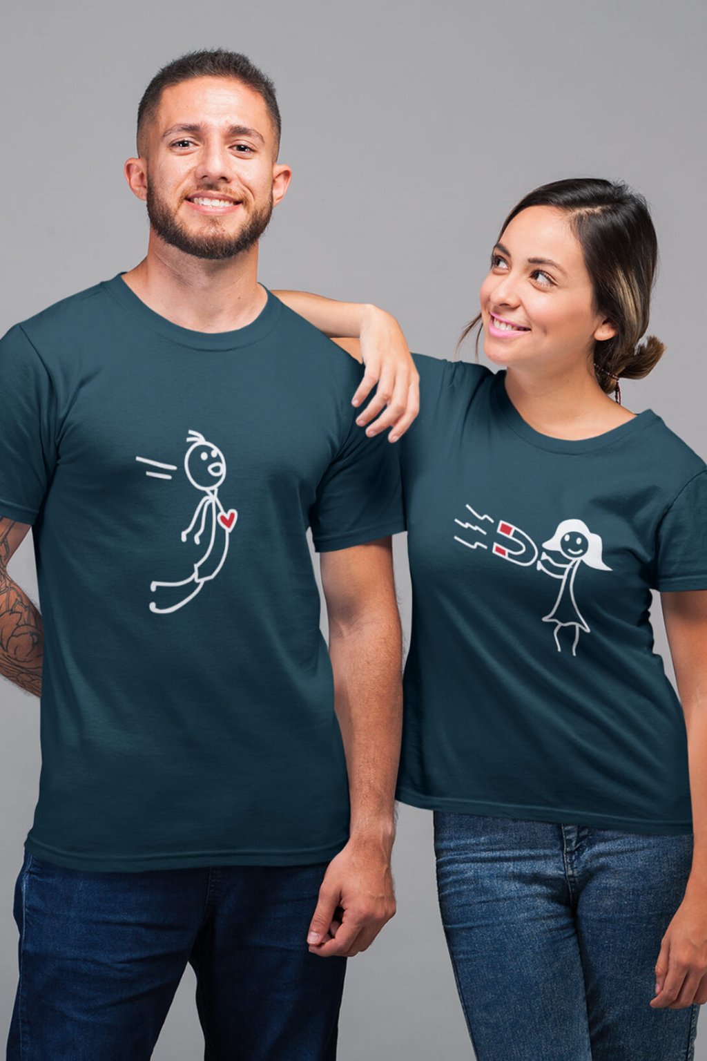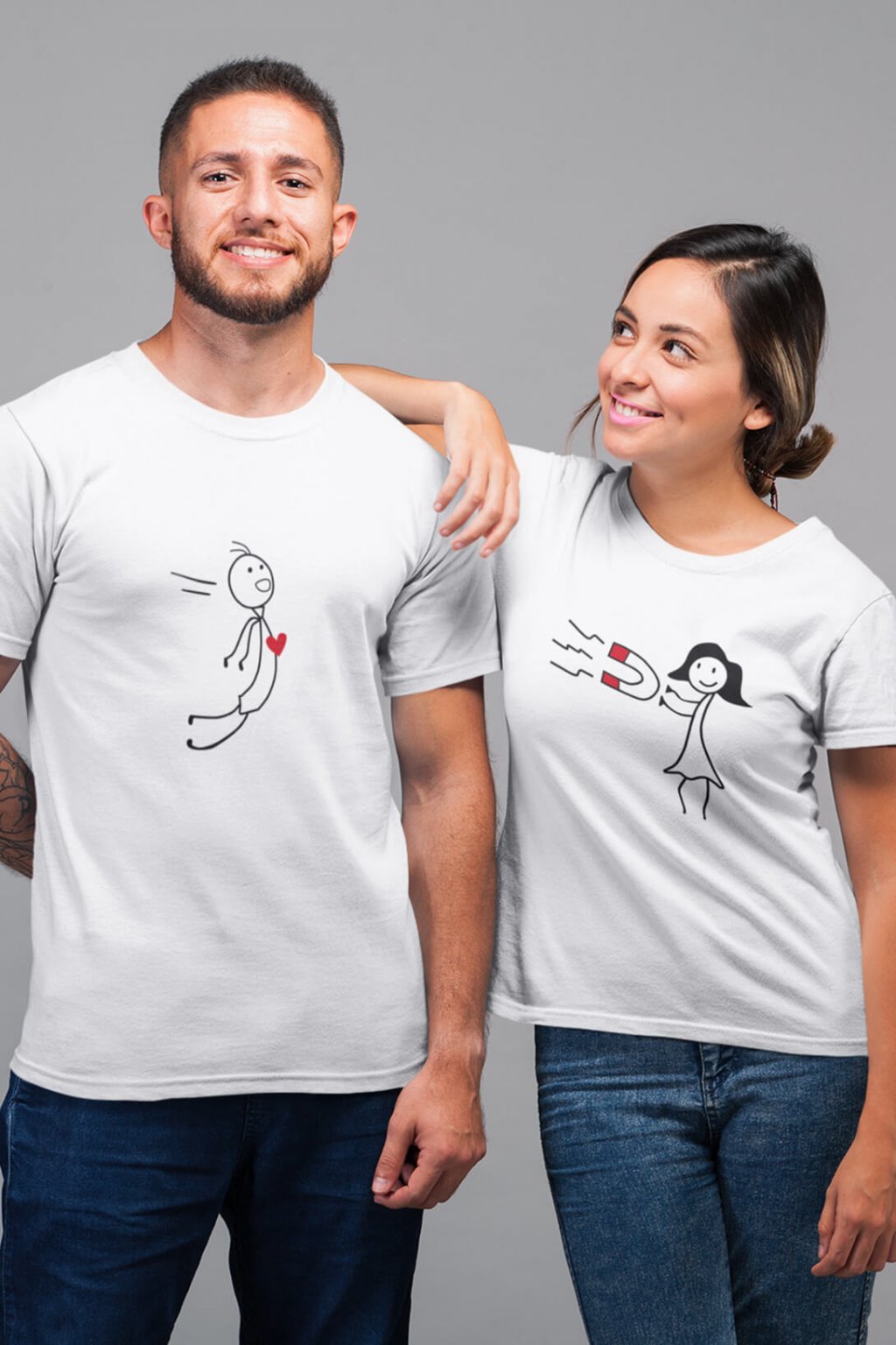 Bavlnené tričká pre páry s roztomilou potlačou. Žena má na tričku obrázok postavičku dievčaťa s magnetom a muž postavičku chlapca so srdiečkom.