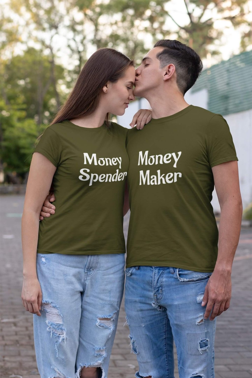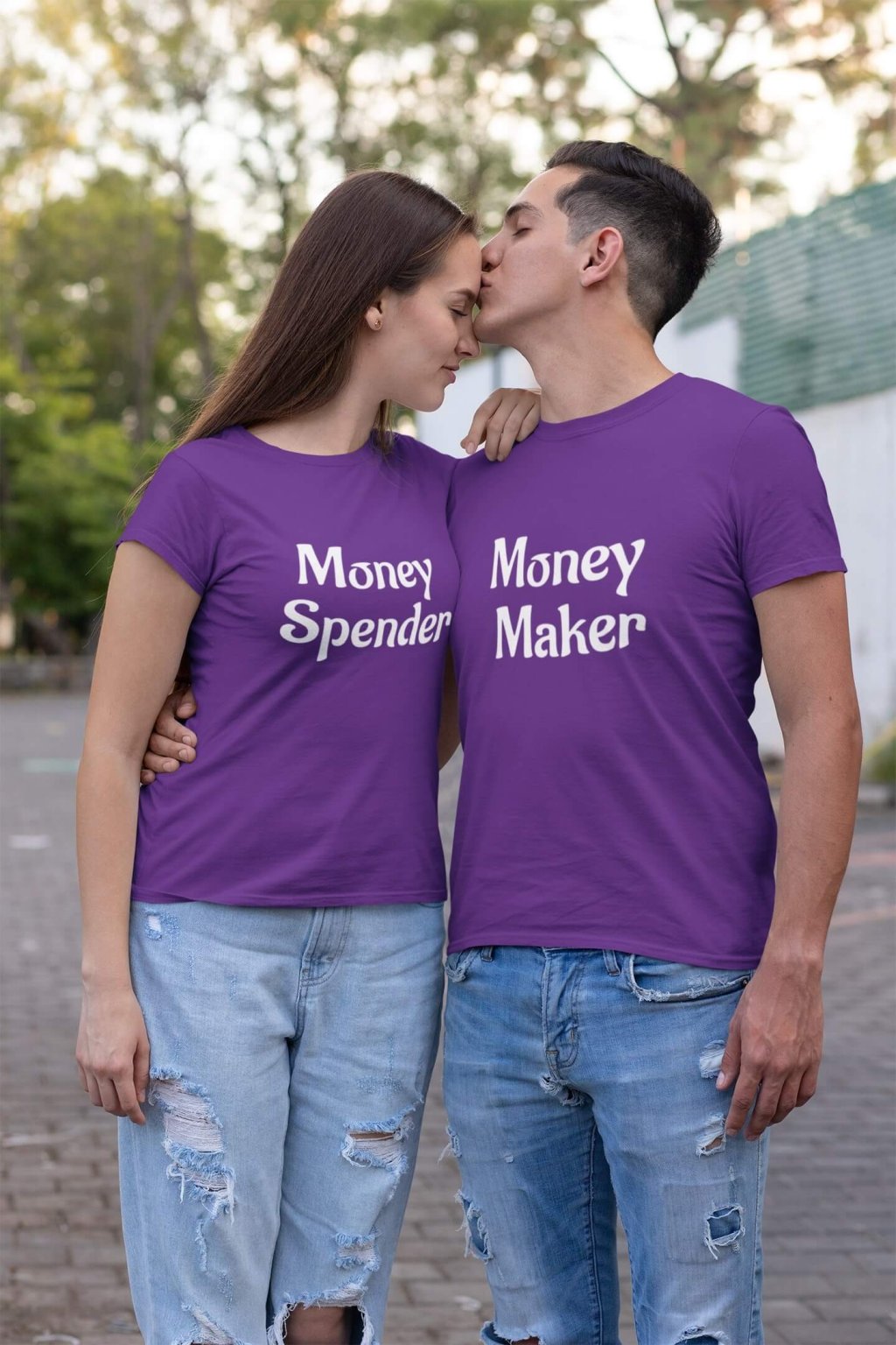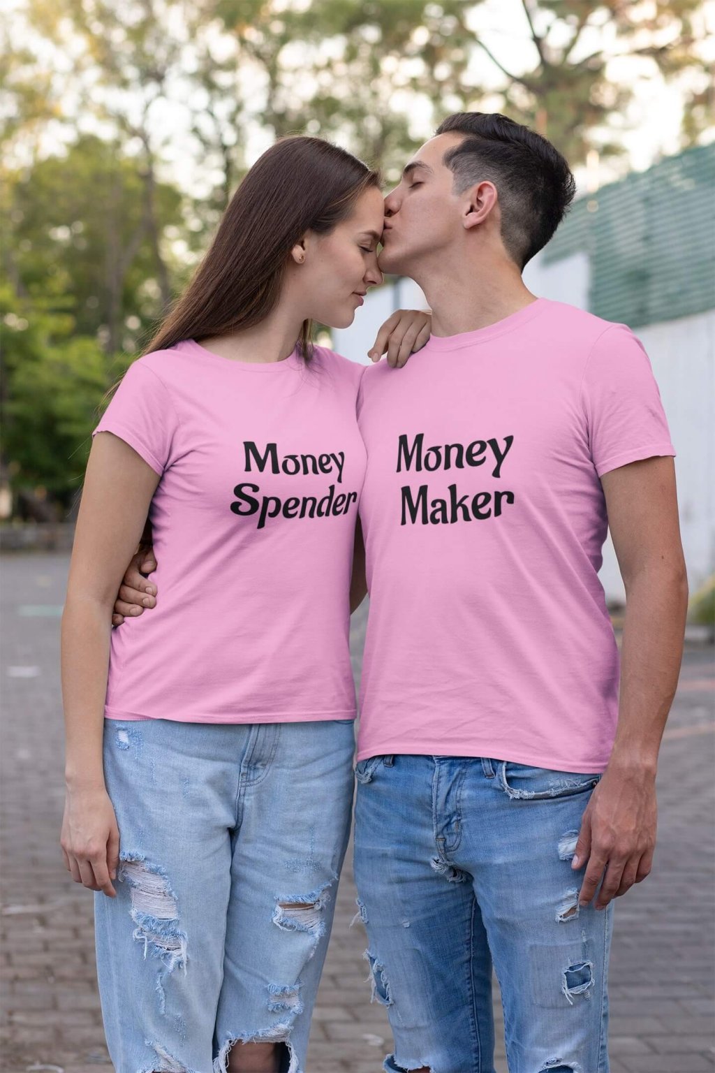 Bavlnené tričká pre páry s potlačou. Na tričkách je doplňujúci sa text, na pánskom: ,,Money Maker" a na ženskom: ,,Money Spender." Tričká, ktoré sa vzájomne dopĺňajú potešia všetkých zamilovaných.