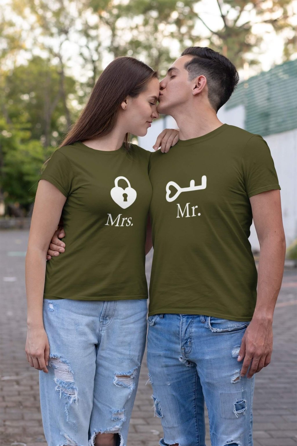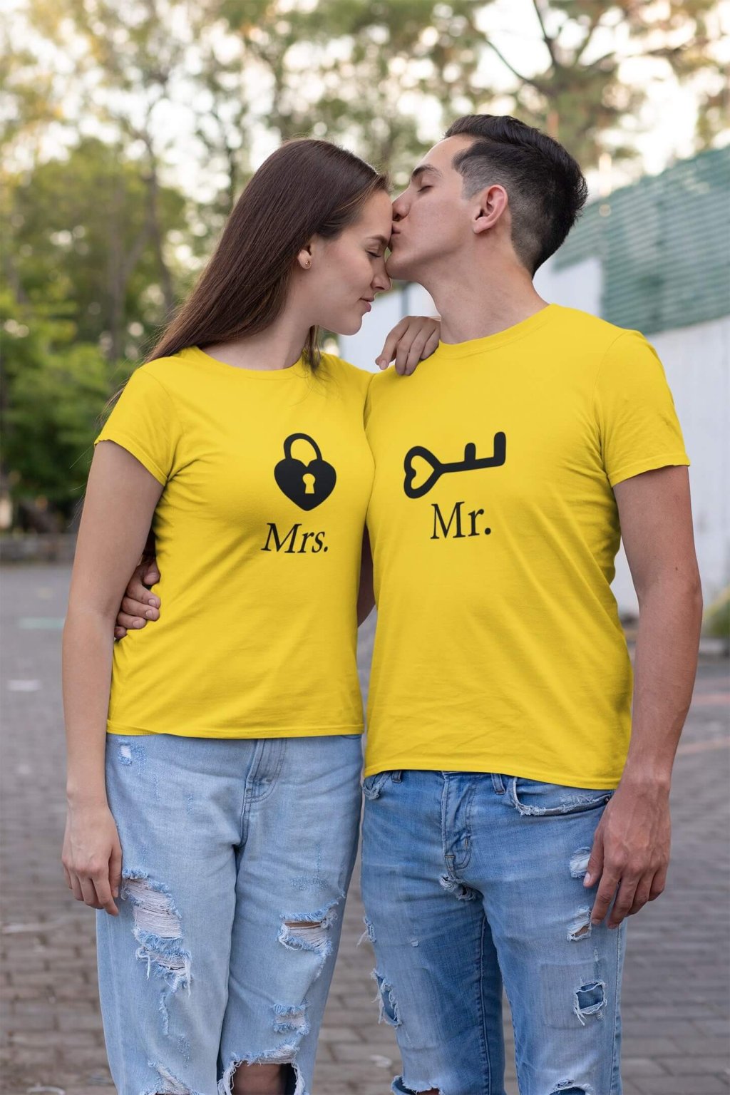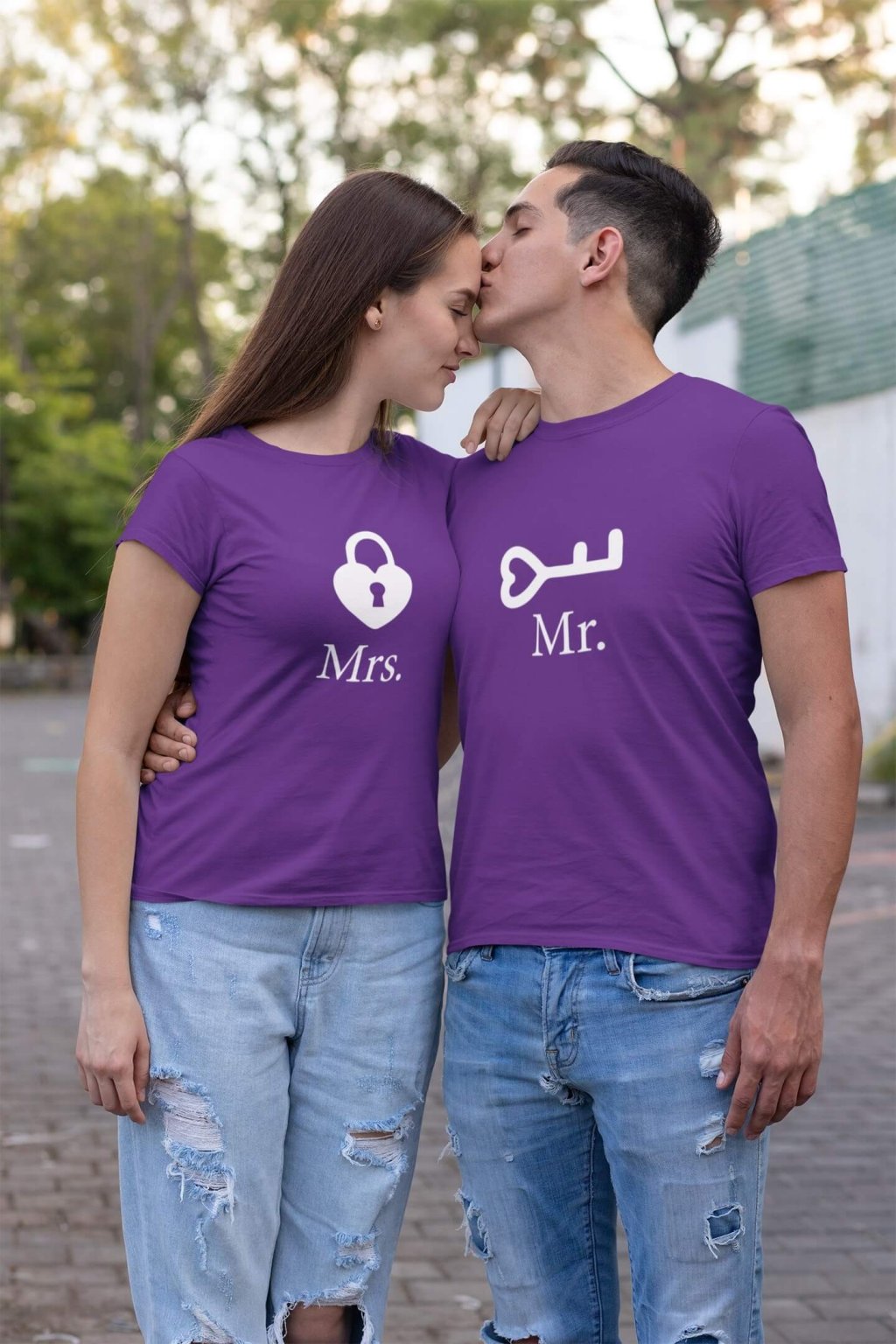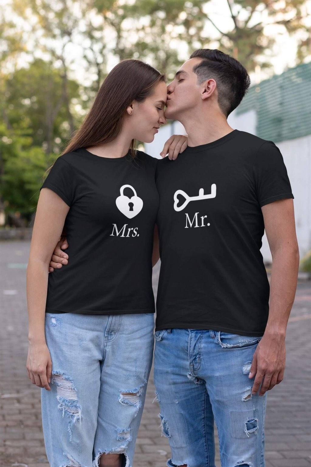 Bavlnené tričká pre páry s roztomilou potlačou. Na pánskom tričku je skratka MR. so srdcovým kľúčikom. Dámske tričko má skratku MRS. so srdcovým zámkom.