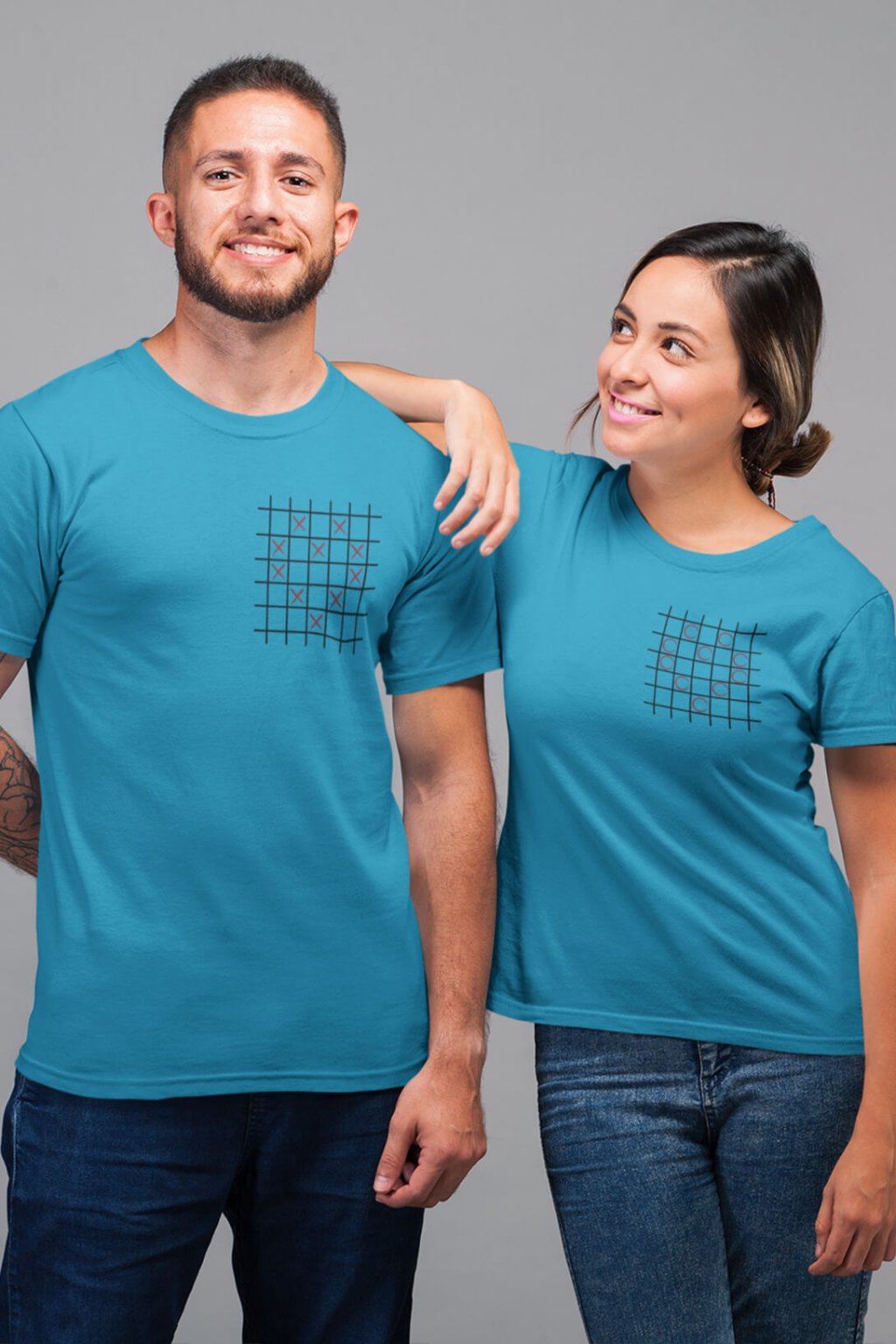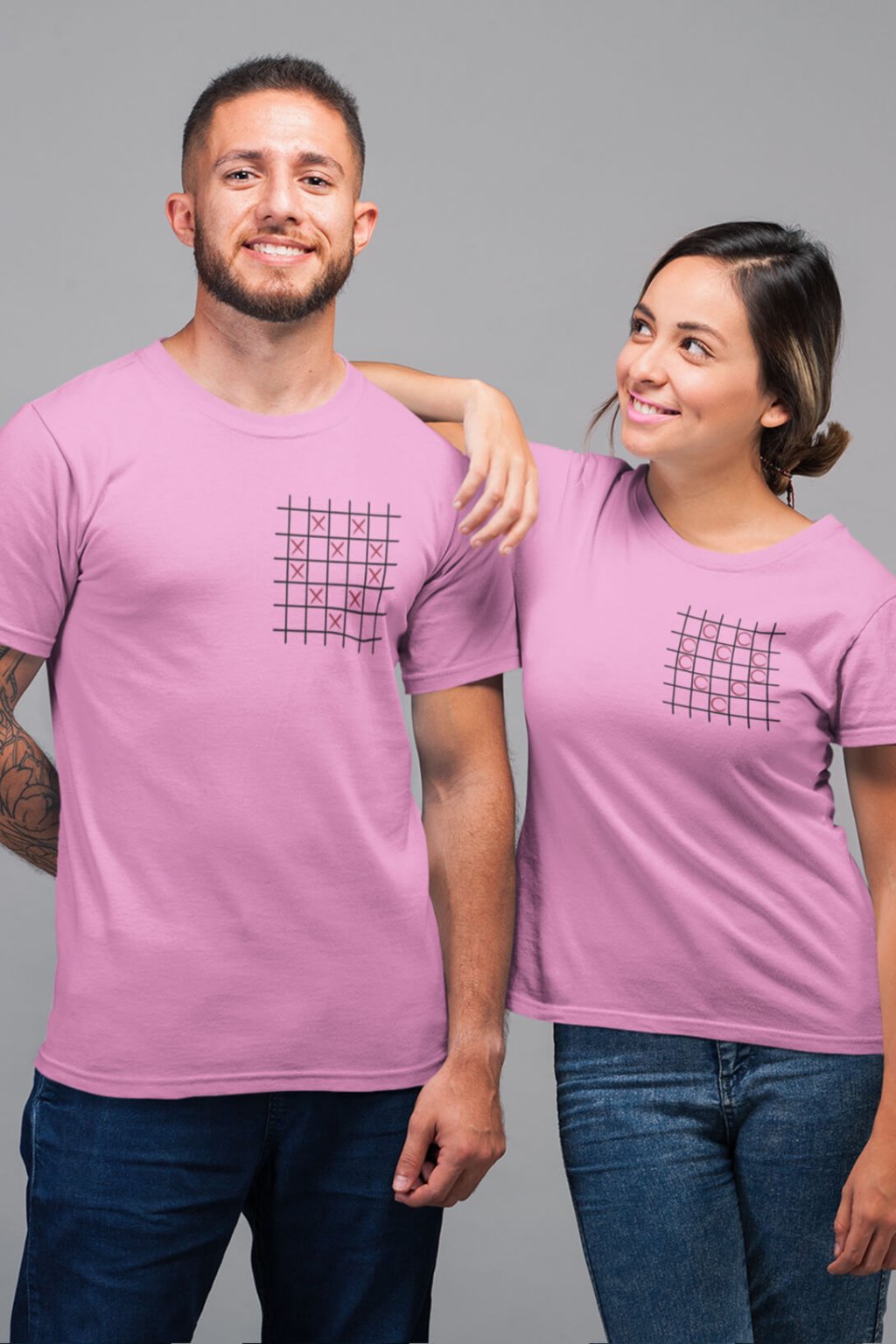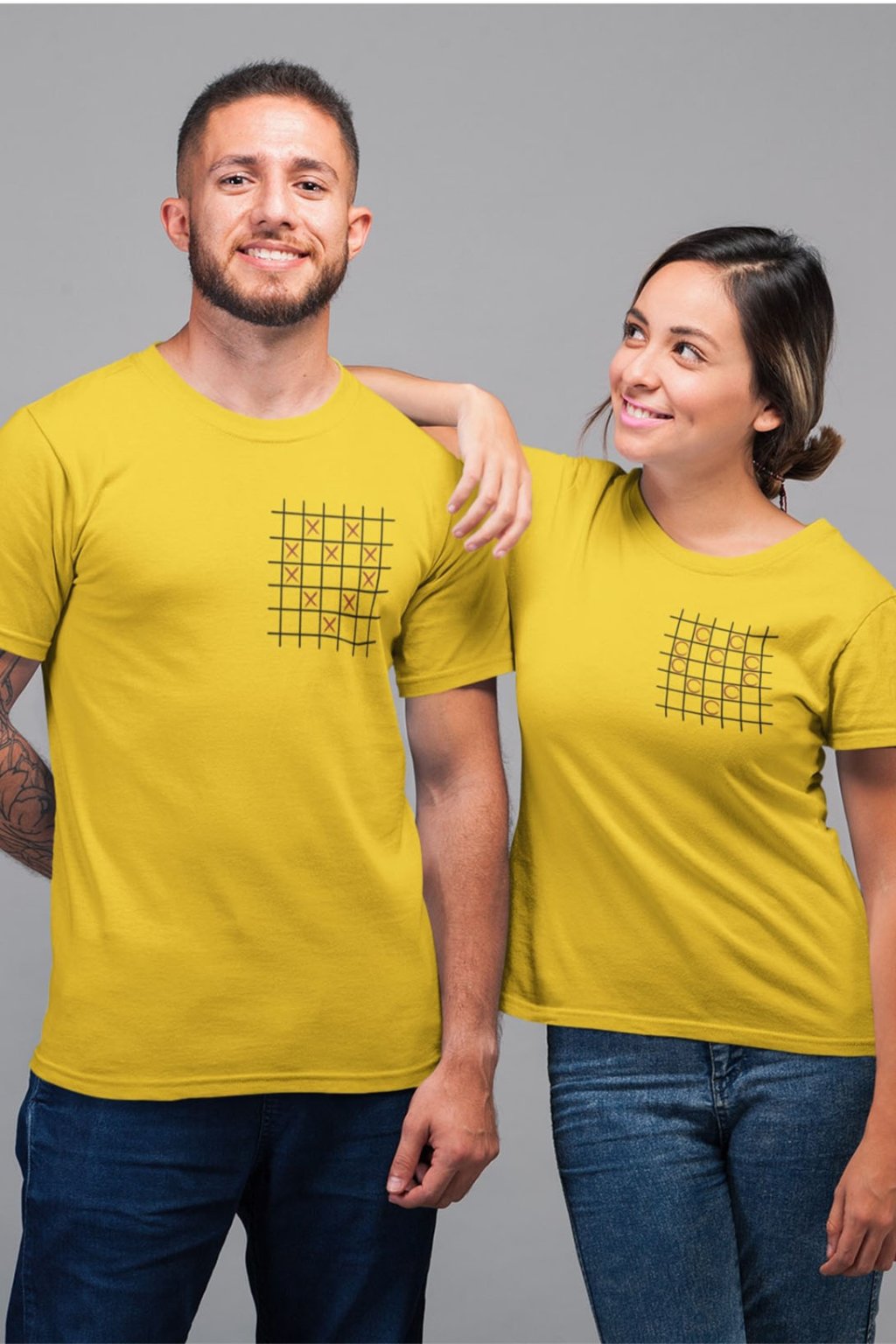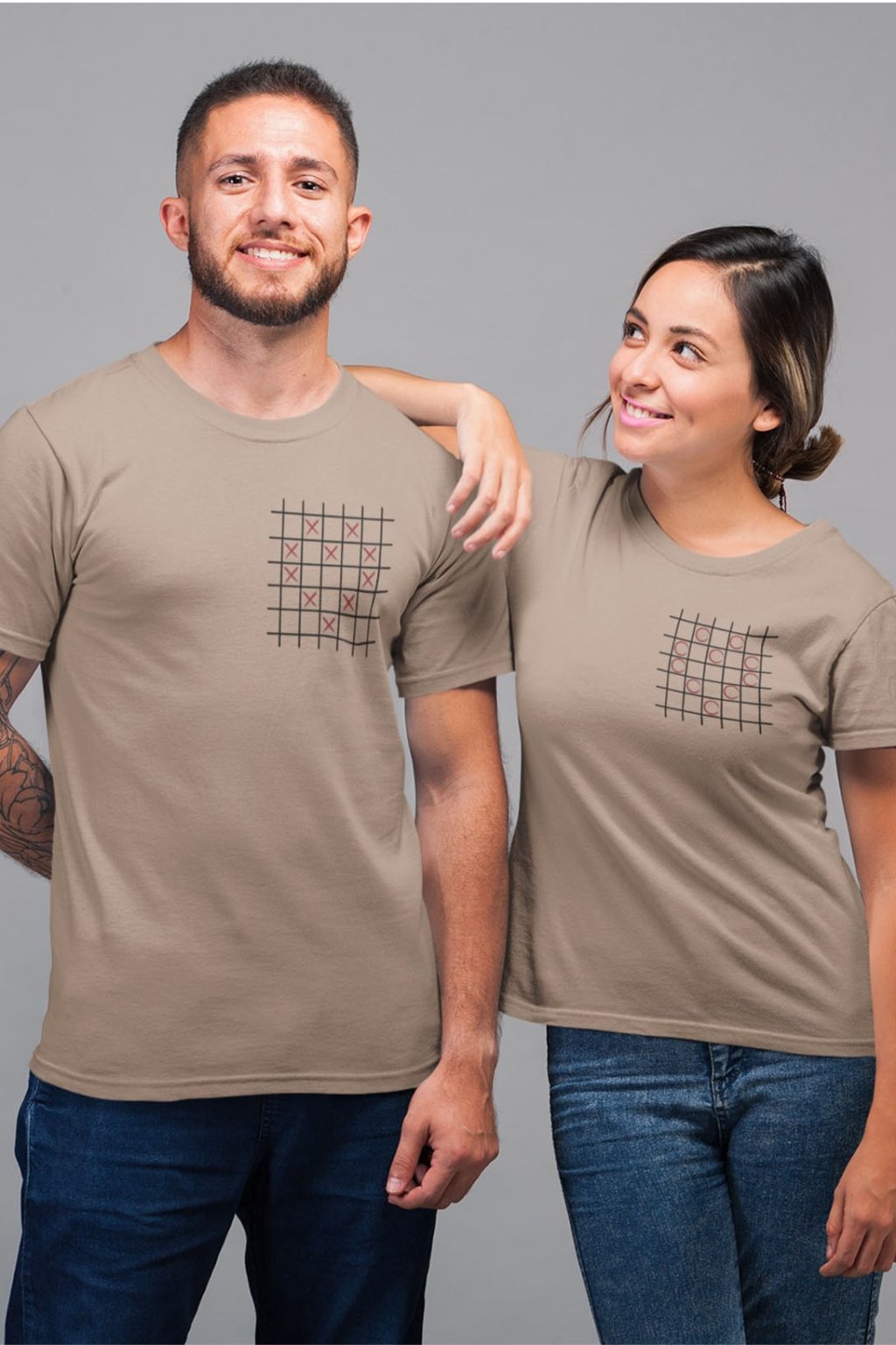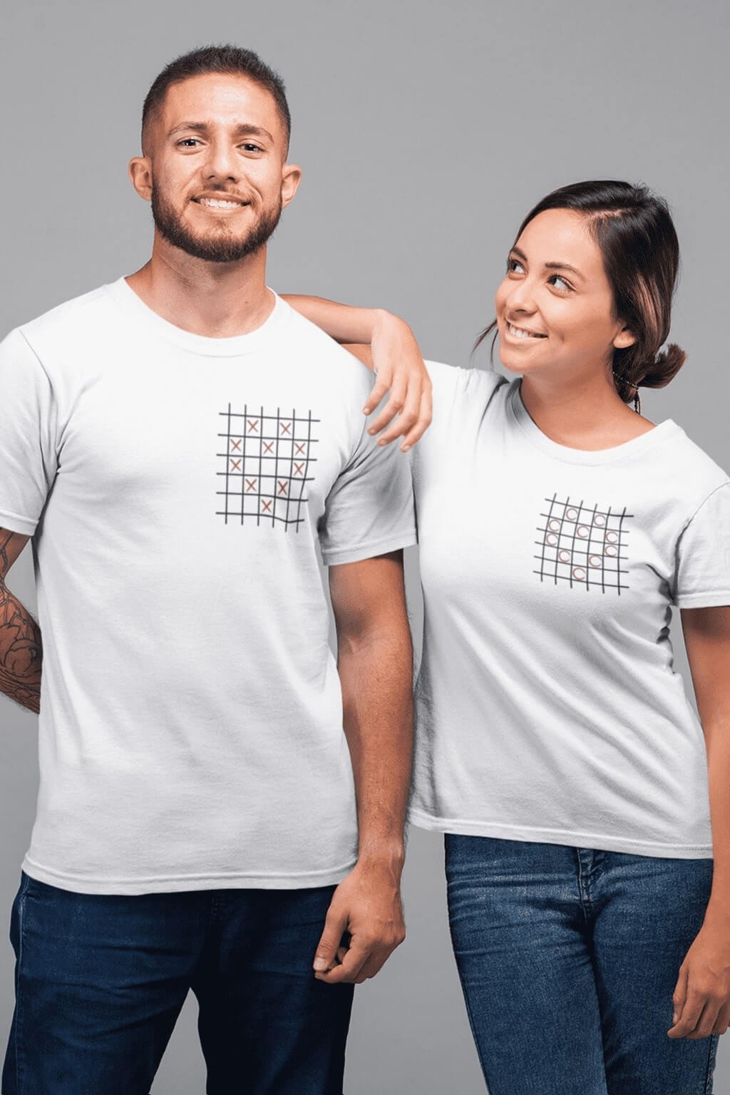 Bavlnené tričká pre páry s roztomilou potlačou. Každý si pamätá časy zo školských lavíc, keď sme potajomky hrávali piškvorky pod lavicou so ,,susedom." Na pánskom tričku sú krížiky poukladané do tvaru srdiečka. Na dámskom je to isté, ale namiesto krížikov sú krúžky. Tričká, ktoré sa vzájomne dopĺňajú potešia všetkých zamilovaných.