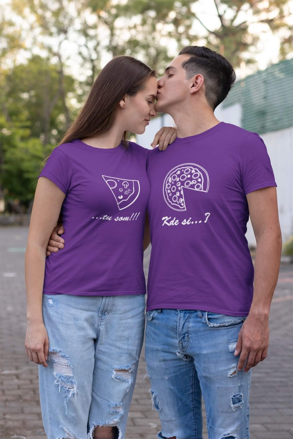 Bavlnené tričká pre páry s roztomilou potlačou. Na pánskom tričku je obrázok pizze a nápis: "Kde si ?". Na dámskom tričku je obázok pizzového trojuholníka a nápis "...tu som!!!".