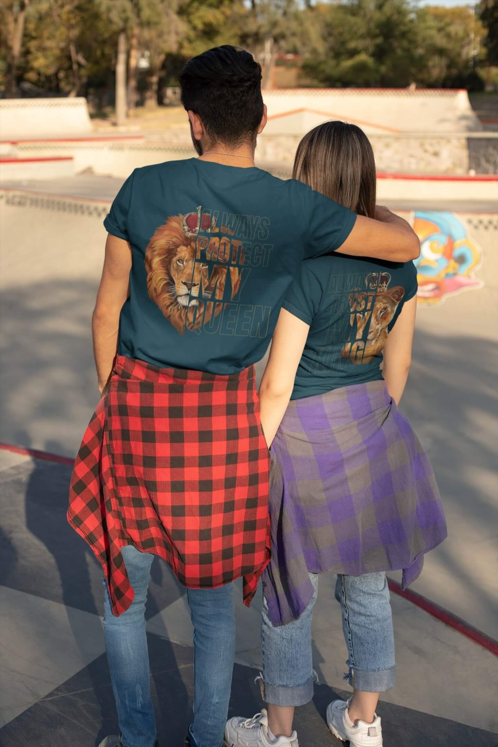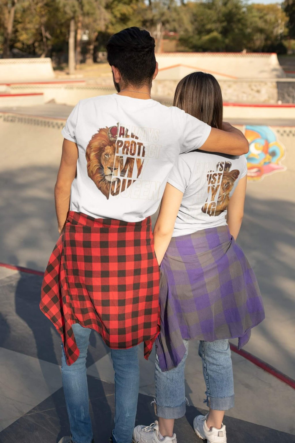 Bavlnené tričká pre páry s originálnou potlačou. Na tričkách je obrázok leva alebo levice. Na pánskom tričku je nápis: „ALWAYS PROTECT MY QUEEN" Ženy majú nápis: "ALWAYS TRUST MY KING.! Tričká, ktoré sa vzájomne dopĺňajú potešia všetkých zamilovaných.