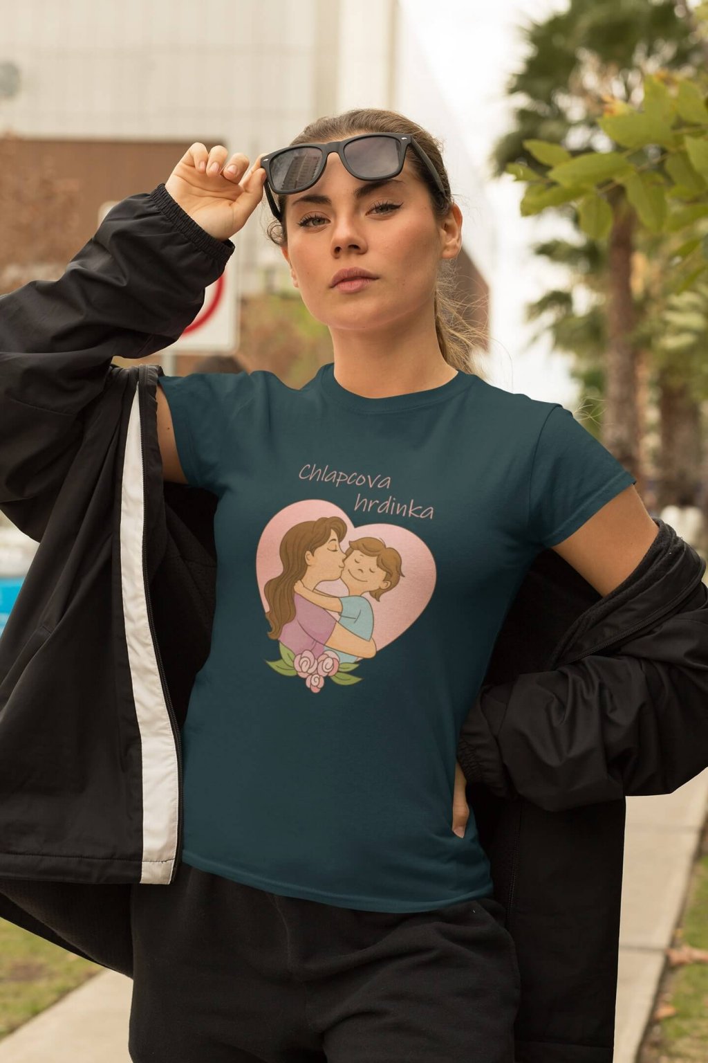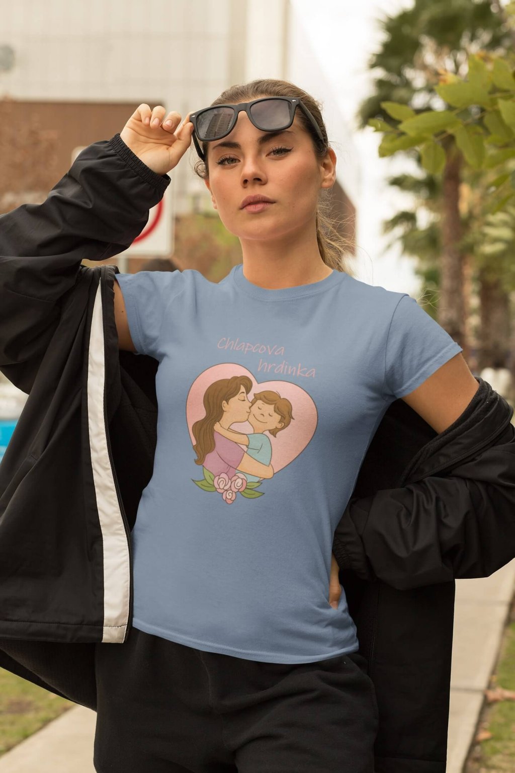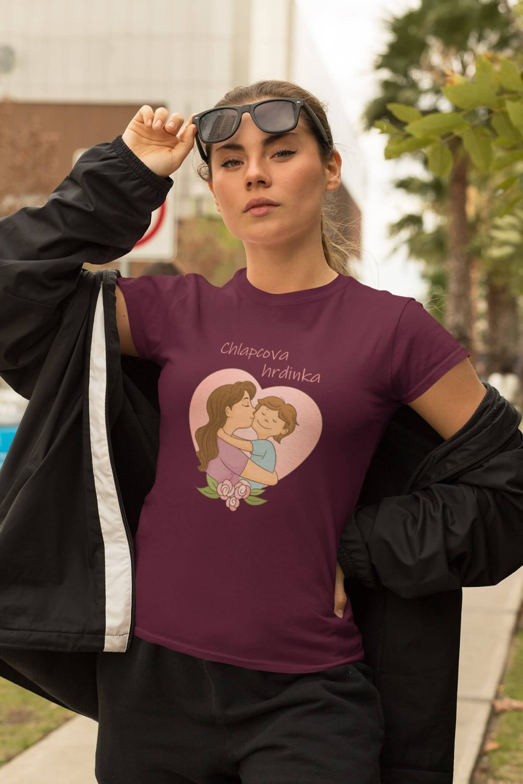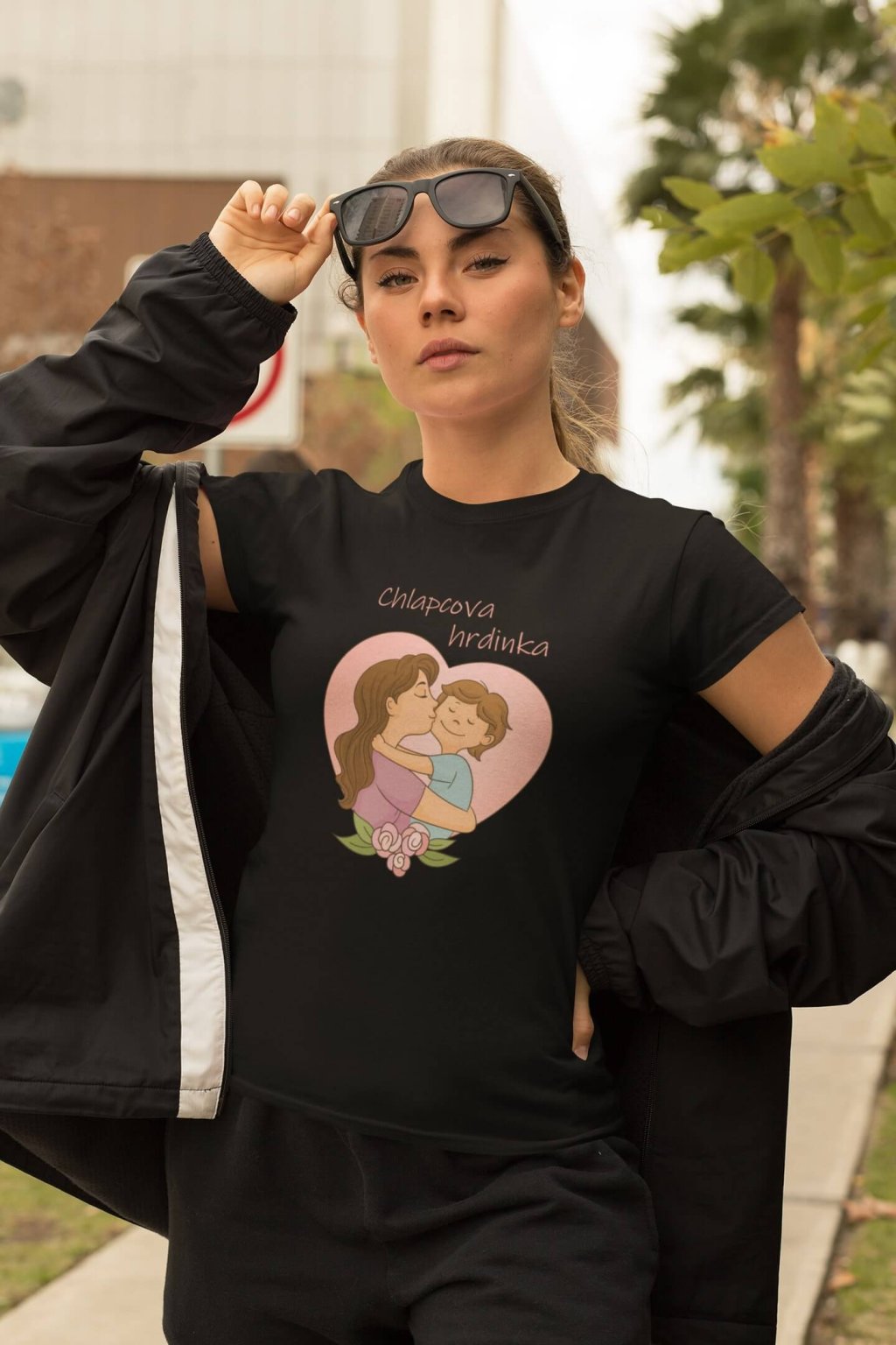 Dámske bavlnené tričko s krátkym rukávom pre matku. Matka je vždy pre svojho syna hrdinkou. Na tričku je obrázok matky so synom a nápisom: ,,Chlapcova hrdinka."