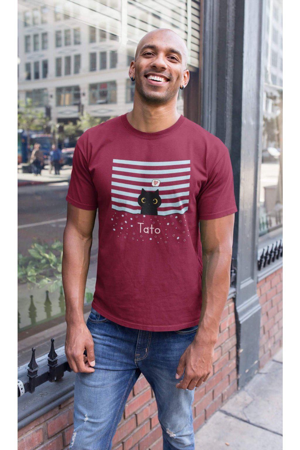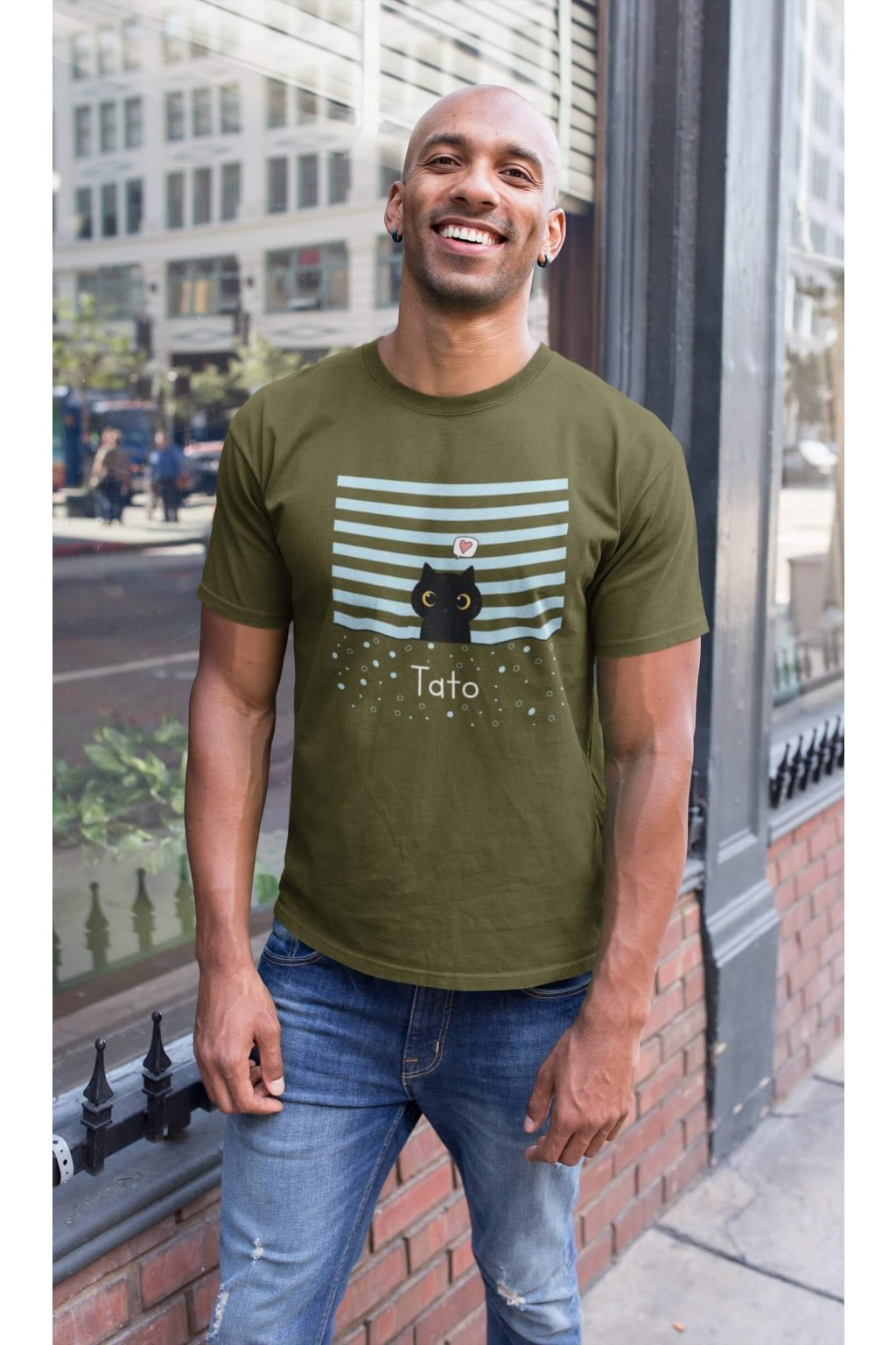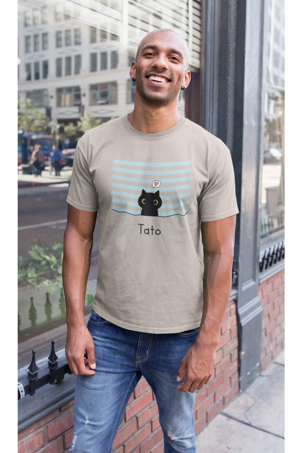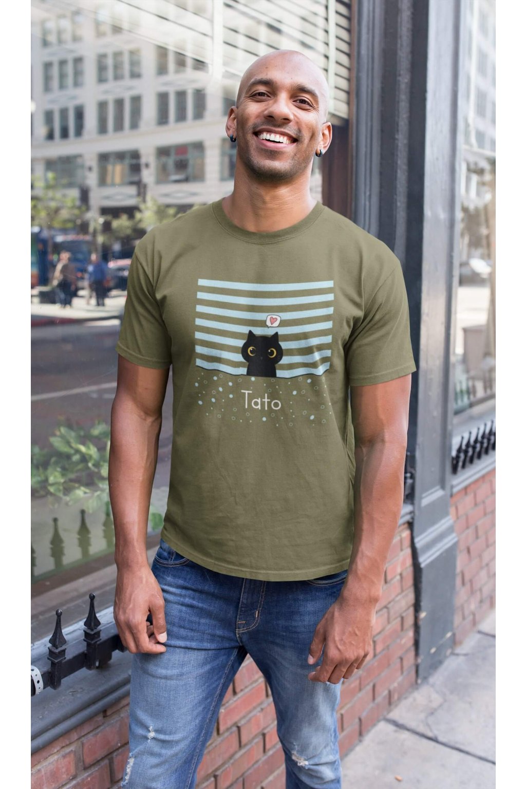 Pánske bavlnené tričko s krátky rukávom pre otca. Na tričku je obrázok mačičky a nápis "Tato." Nápis je možno zmeniť na meno otca, alebo iný nápis. Je to potrebné napísať do poznámky pri objednávke.