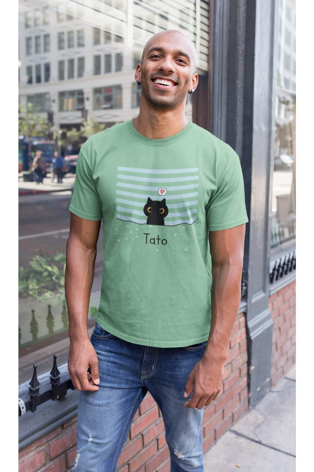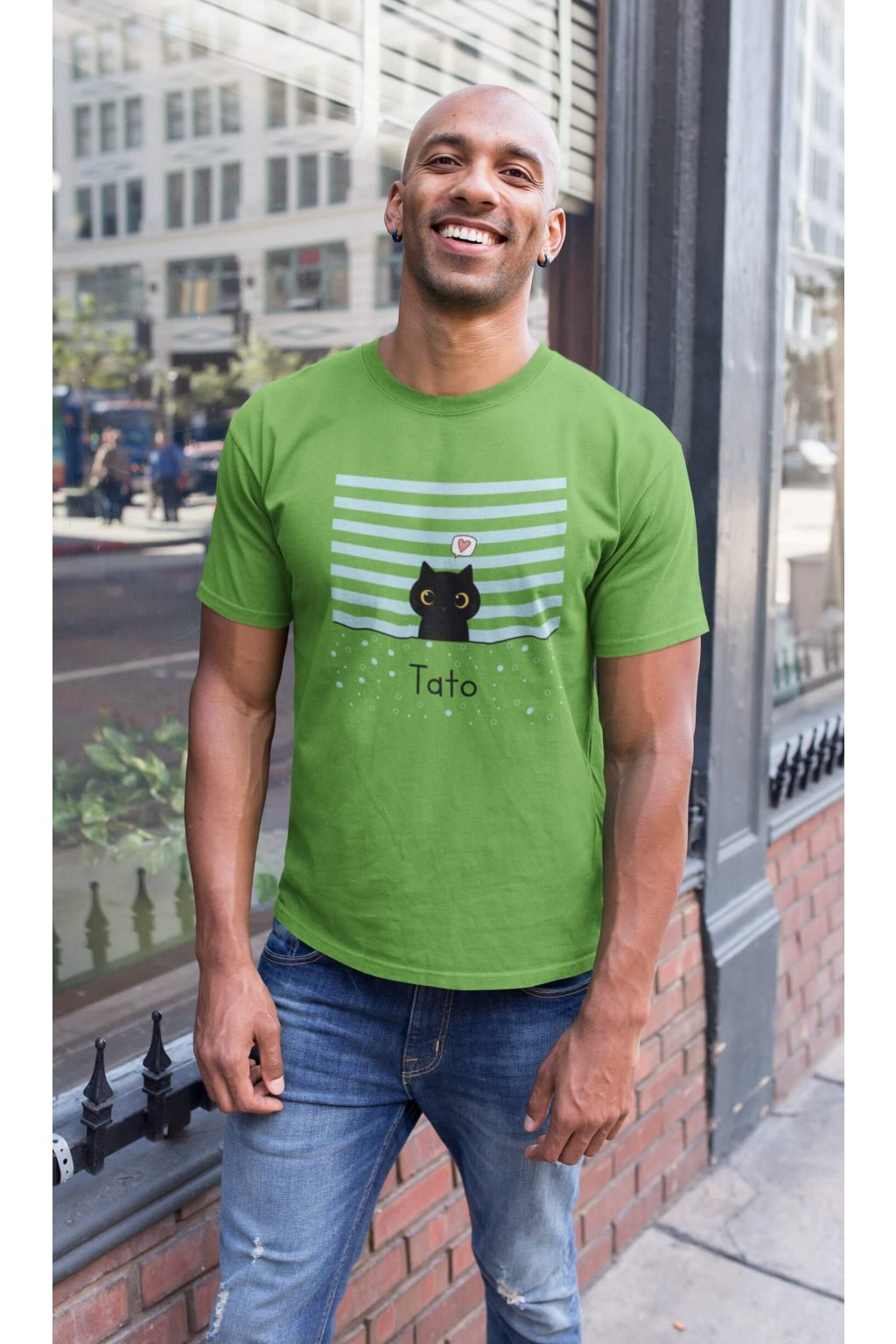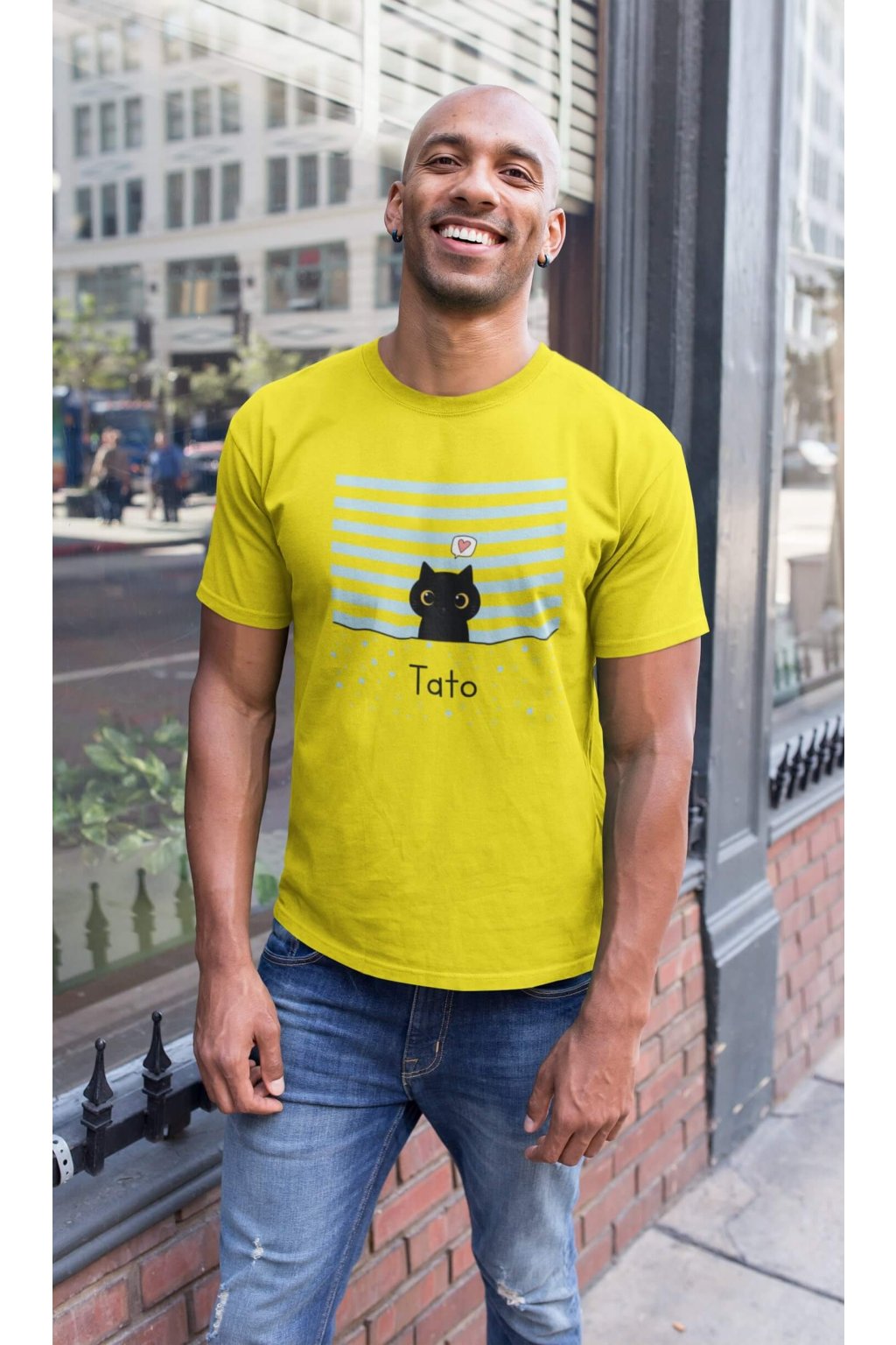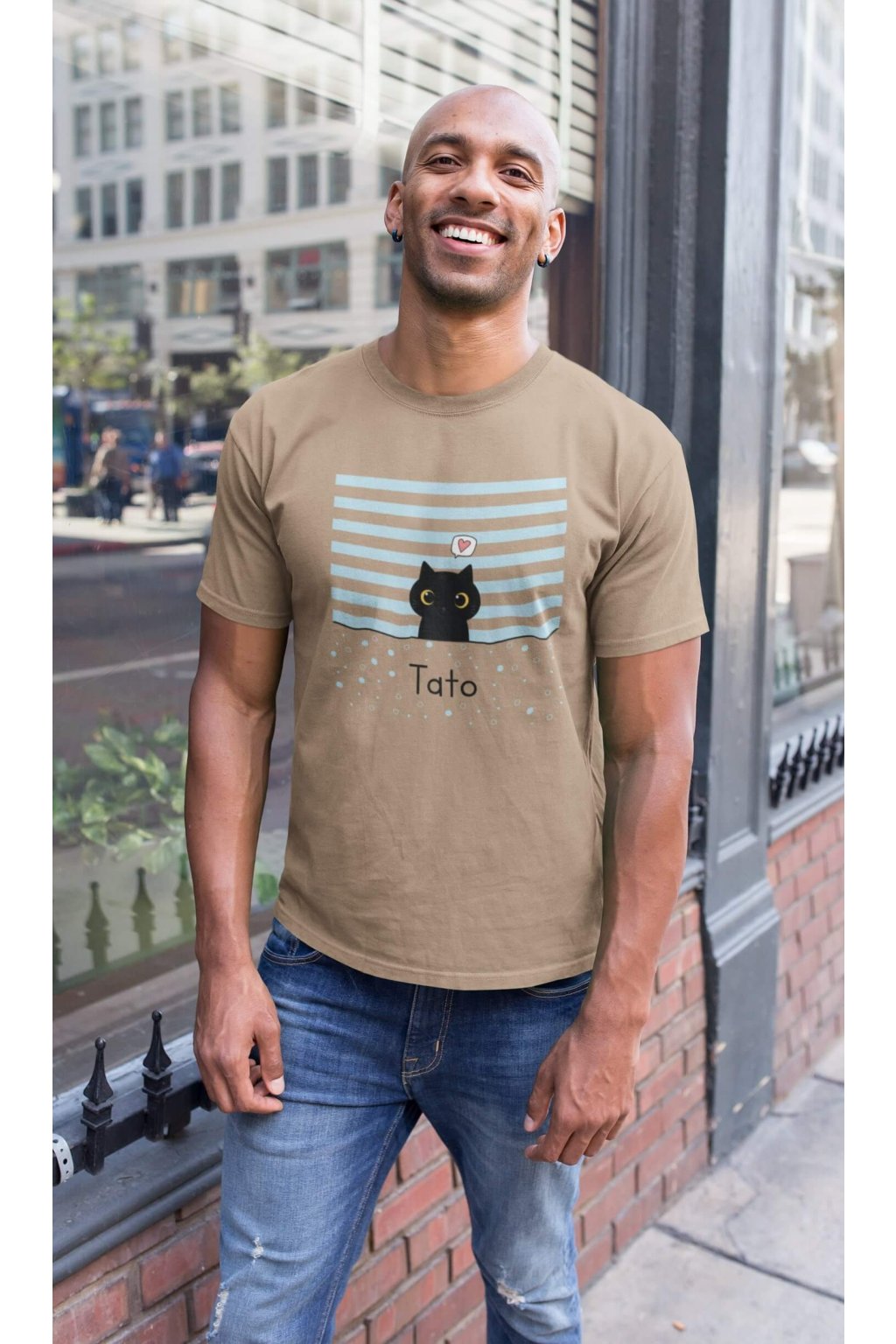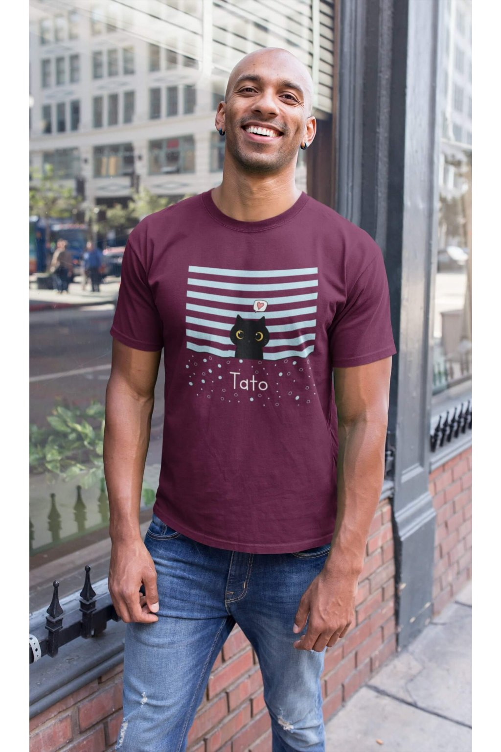 Pánske bavlnené tričko s krátky rukávom pre otca. Na tričku je obrázok mačičky a nápis "Tato." Nápis je možno zmeniť na meno otca, alebo iný nápis. Je to potrebné napísať do poznámky pri objednávke.