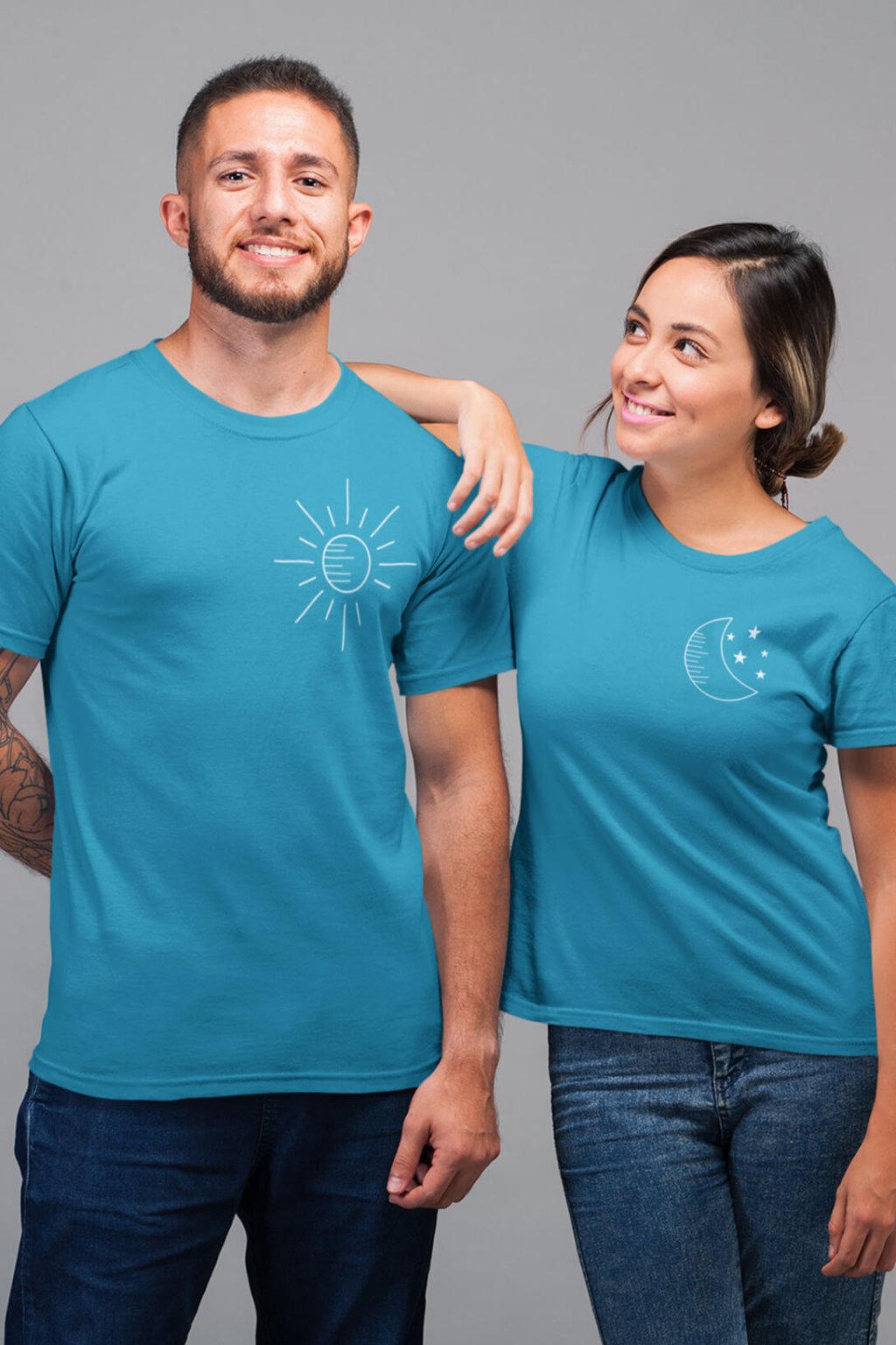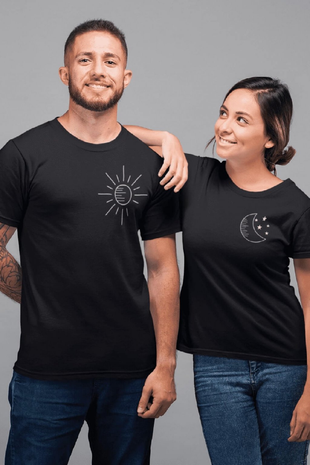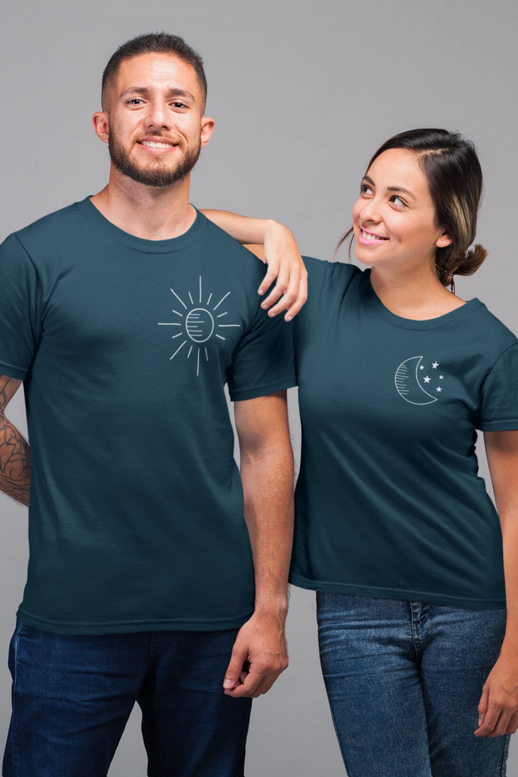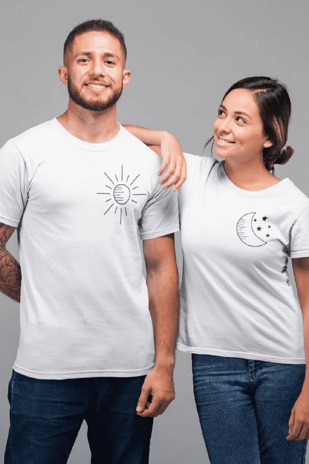 Bavlnené tričká pre páry s roztomilou potlačou. Na pánskom tričku je obrázok slnka. Ženy majú obrázkom mesiaca s hviezdičkami.