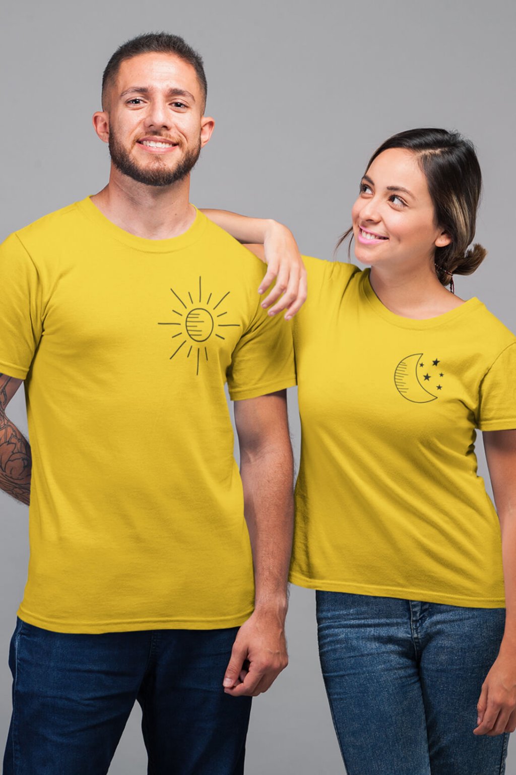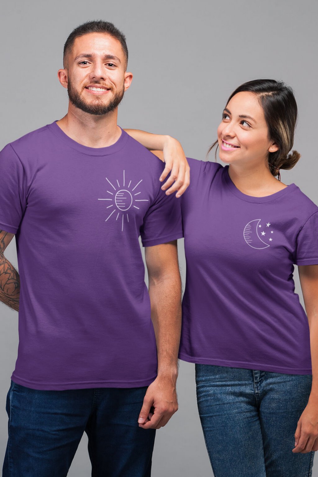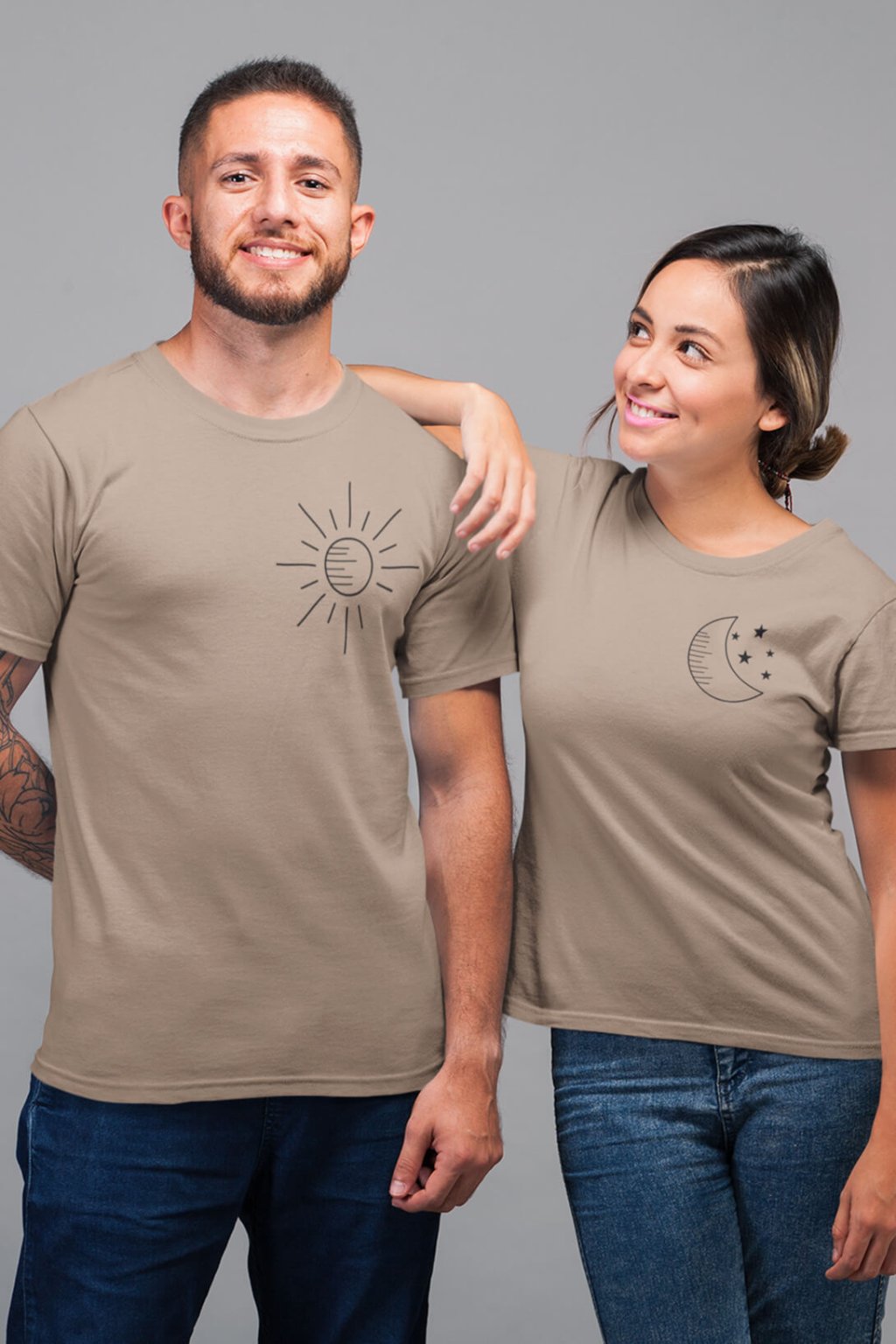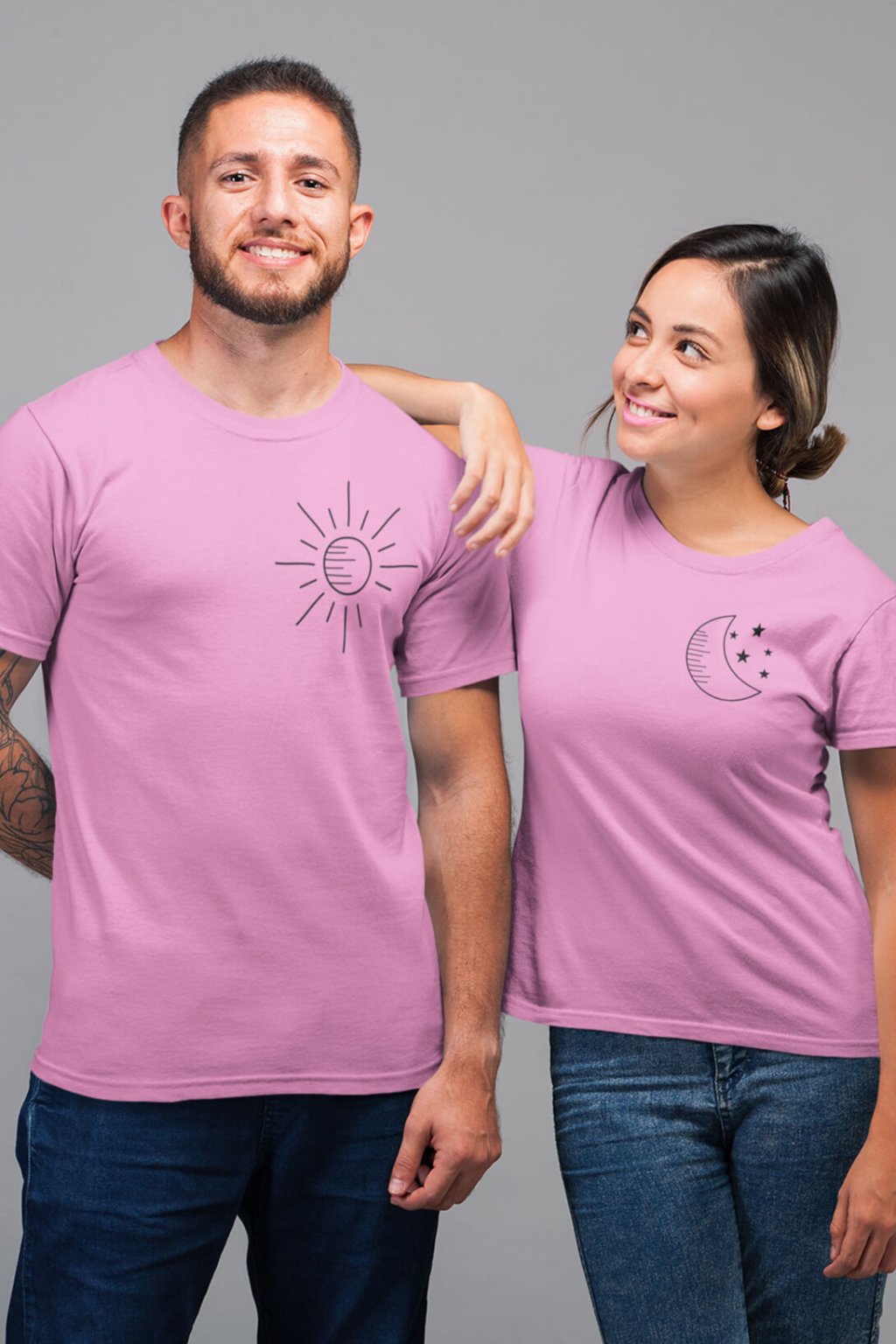 Bavlnené tričká pre páry s roztomilou potlačou. Na pánskom tričku je obrázok slnka. Ženy majú obrázkom mesiaca s hviezdičkami.