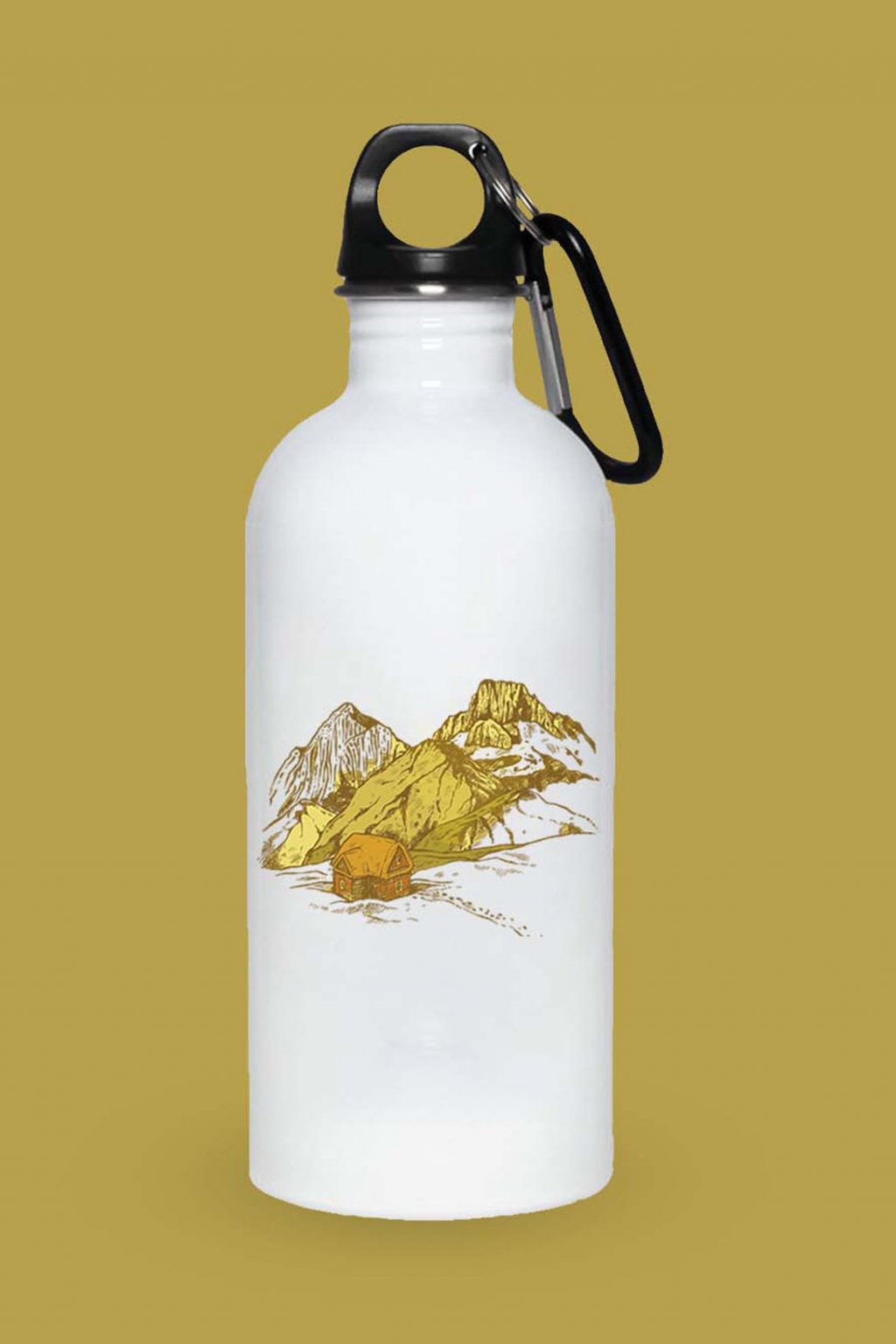 Turistická fľaška v rôznych veľkostiach s motívom turistu na horách. Telo fľaše na vodu je vyrobené z hliníka a uzáver s náustkom je vyrobený z plastu. Kryt má plastový pitón, ktorý vám umožňuje pripevniť fľašu napríklad k batohu. Šúčasťou fľašky je karabína.