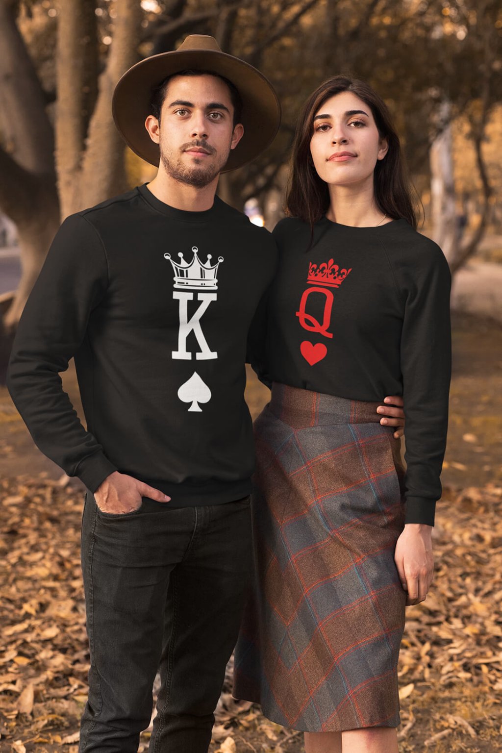 Unisex mikiny pre páry bez kapucne s roztomilou potlačou. Na pánskej mikine je symbolický znak kráľa K z kariet aj s korunou čiernej/ bielej farby. Na dámskej mikine je znak kráľovnej Q s korunkou červenej farby.
