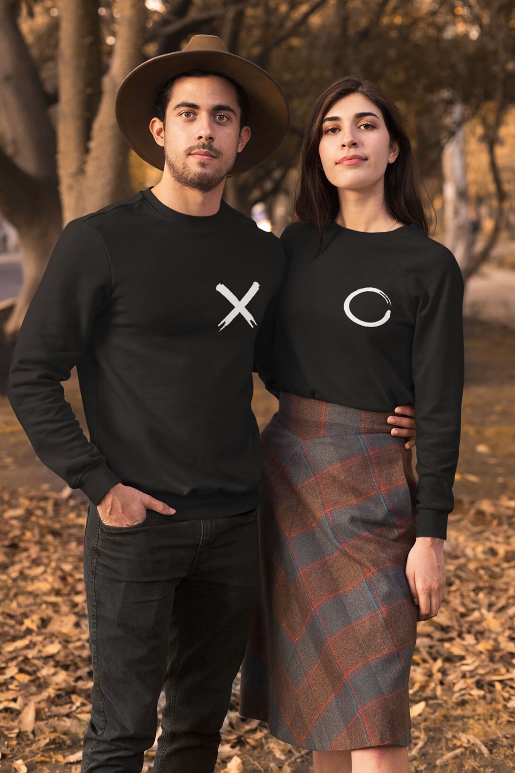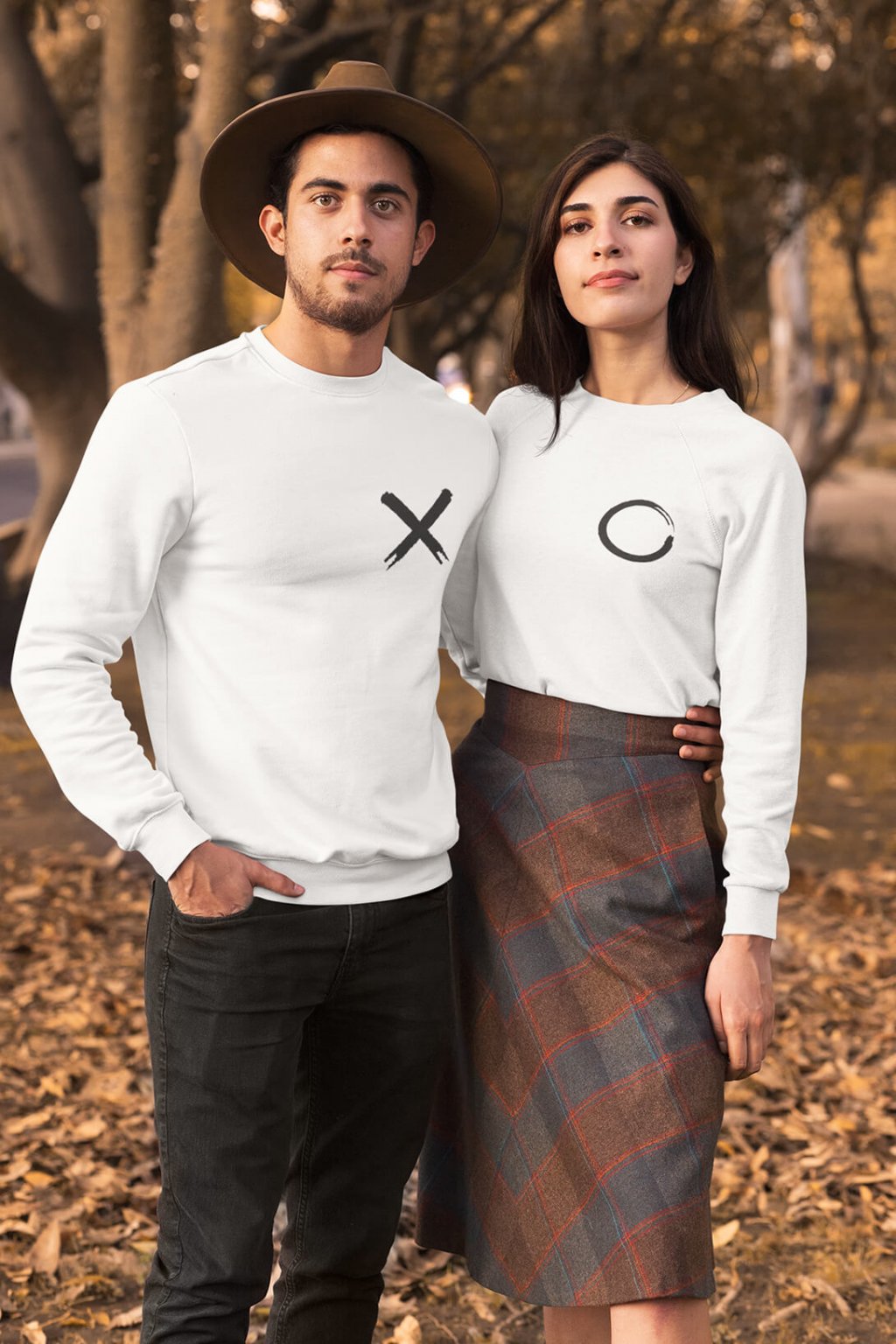 Unisex mikiny pre páry bez kapucne s roztomilou potlačou. Na pánskej mikine je znak X (krížik) a ženy majú O (krúžok).