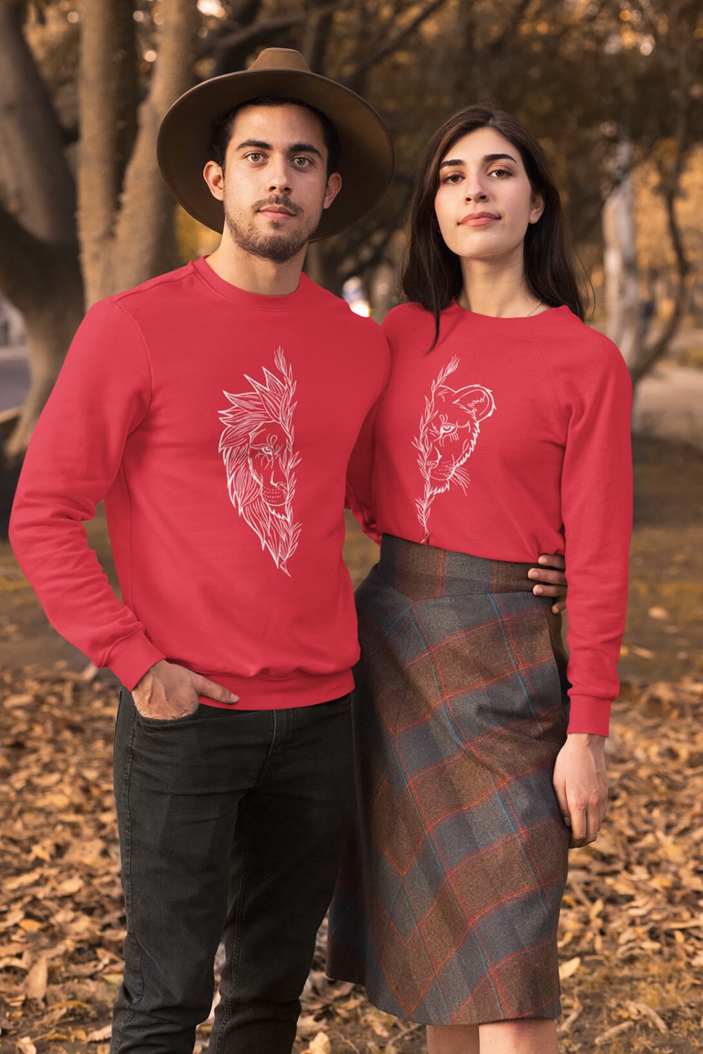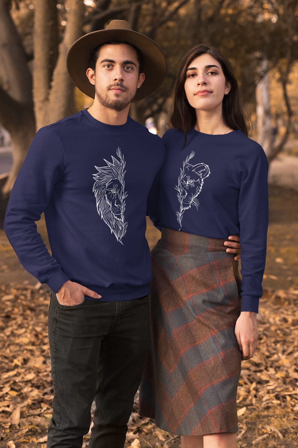 Unisex mikiny pre páry s roztomilou potlačou. Na pánskej mikine je obrázok leva a ženy majú levicu. Mikiny, ktoré sa vzájomne dopĺňajú, potešia každý zamilovaný pár.