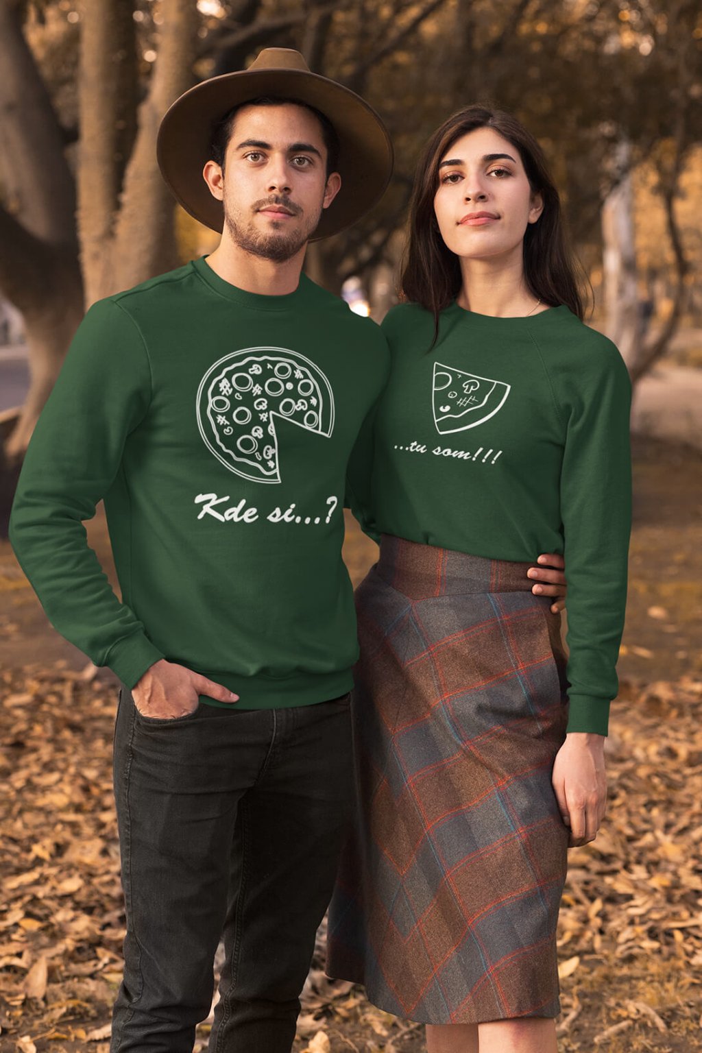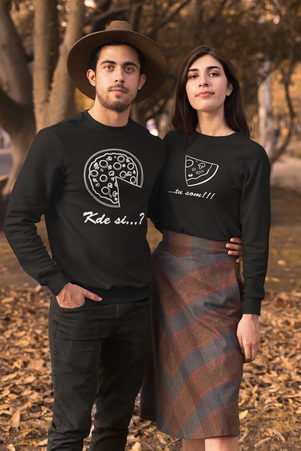 Unisex mikiny pre páry bez kapucne s roztomilou potlačou. Na pánskej mikine je obrázok pizze a nápis: "Kde si ?". Na dámskej mikine je obázok pizzového trojuholníka a nápis "...tu som!!!".