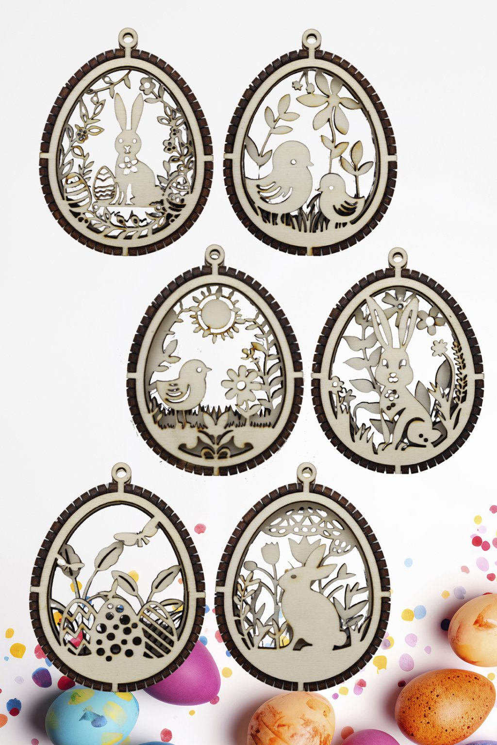 Oživte svoju veľkonočnú výzdobu jedinečnými drevenými ozdobami! Táto sada obsahuje šesť nádherných závesných dekorácií v tvare vajíčok, ktoré zobrazujú jarné a veľkonočné motívy – roztomilé zajačiky, vtáčiky, kvety a veľkonočné vajíčka.