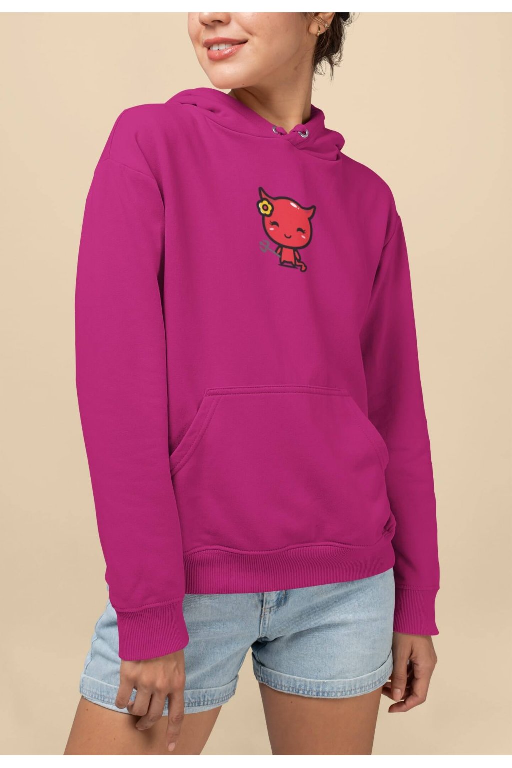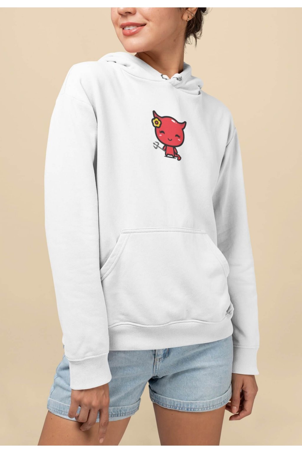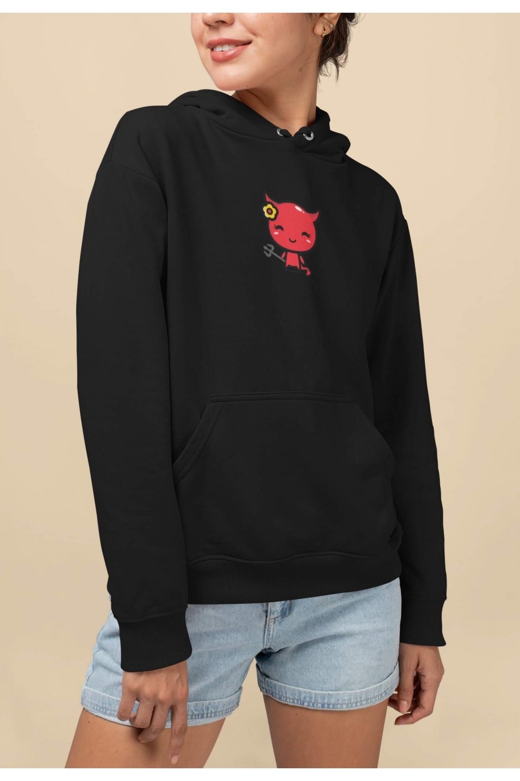 Dámska bavlnená mikina s kapucňou a roztomilou potlačou. V strede hrudníku sa nachádza usmievavý čertík s kvietkom pri uchu.