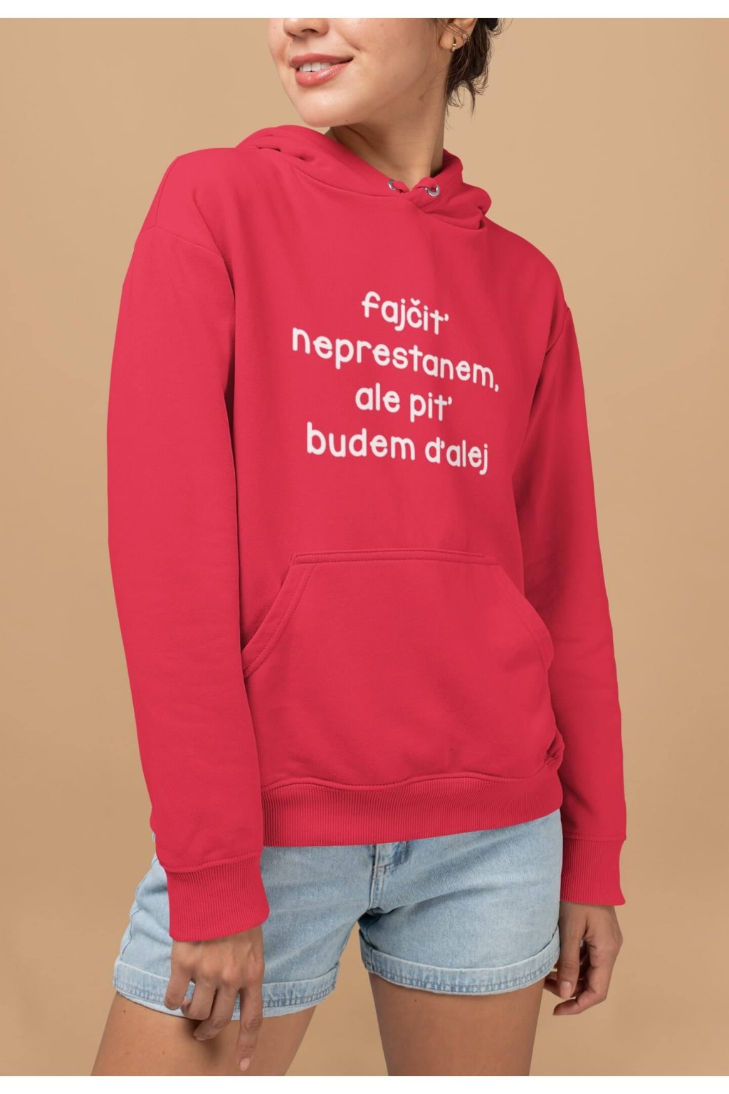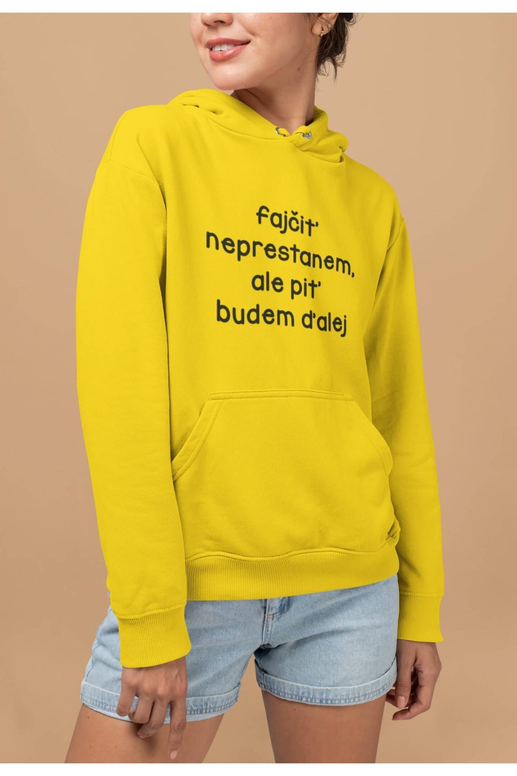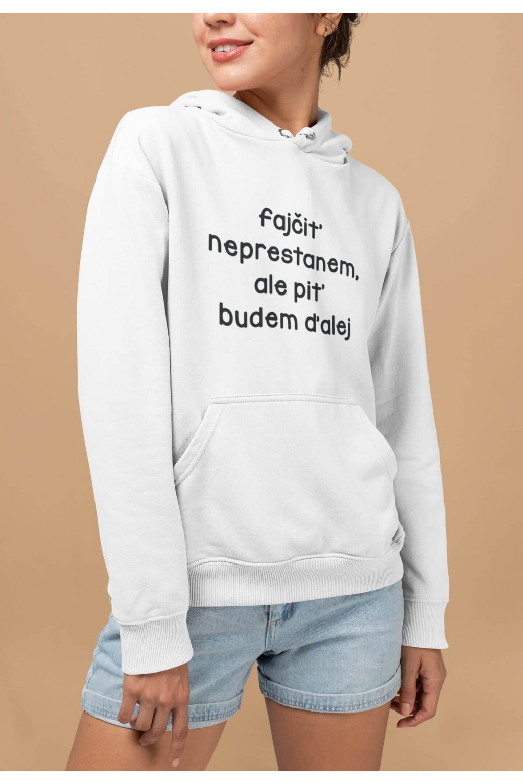 Dámska bavlnená mikina s kapucňou a vtipným motívom. Na mikine je originálny a úprimný nápis: ,,Fajčiť neprestanem, ale piť budem ďalej."