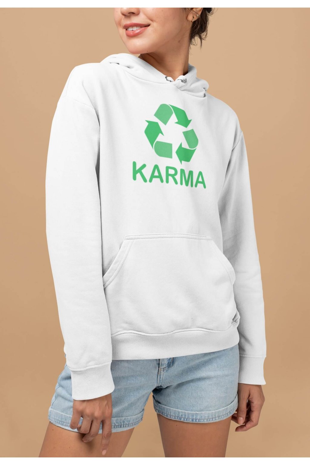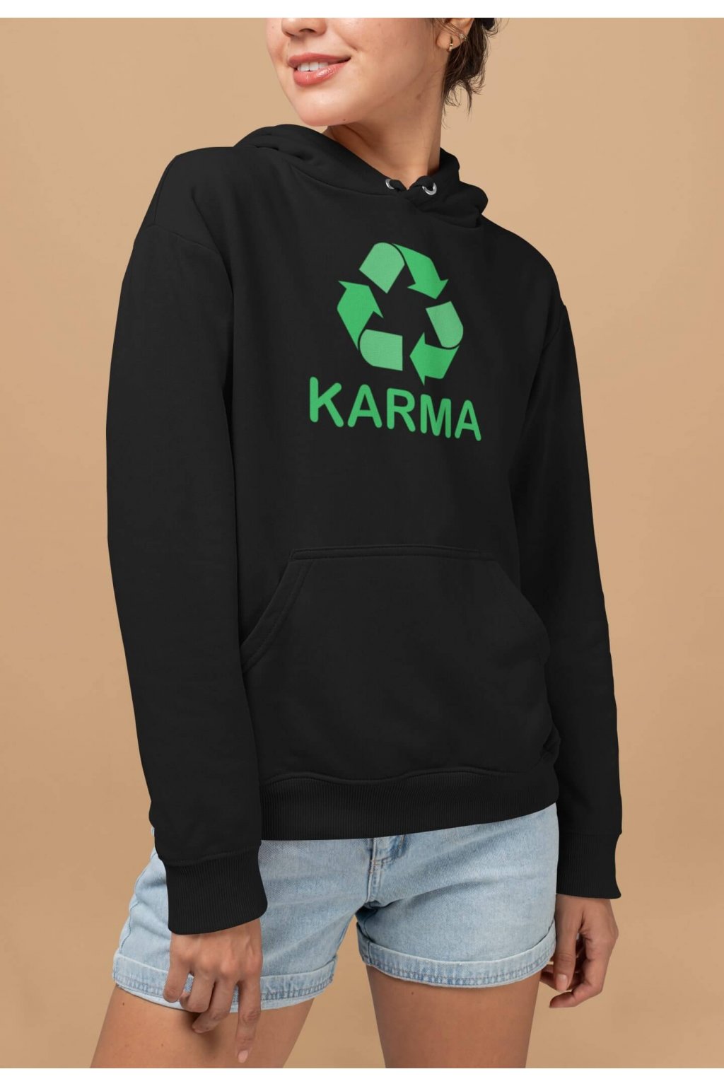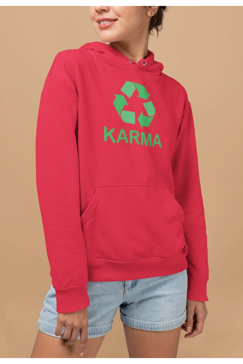 Dámska mikina s kapucňou, dlhými rukávmi a klokaním vreckom a nápisom určeným pre ľudí, milujúcich nosiť jednoduché a výstižné nápisy na oblečení. Na mikine je nápis: ,,KARMA," spolu so znázorneným kolobehom.