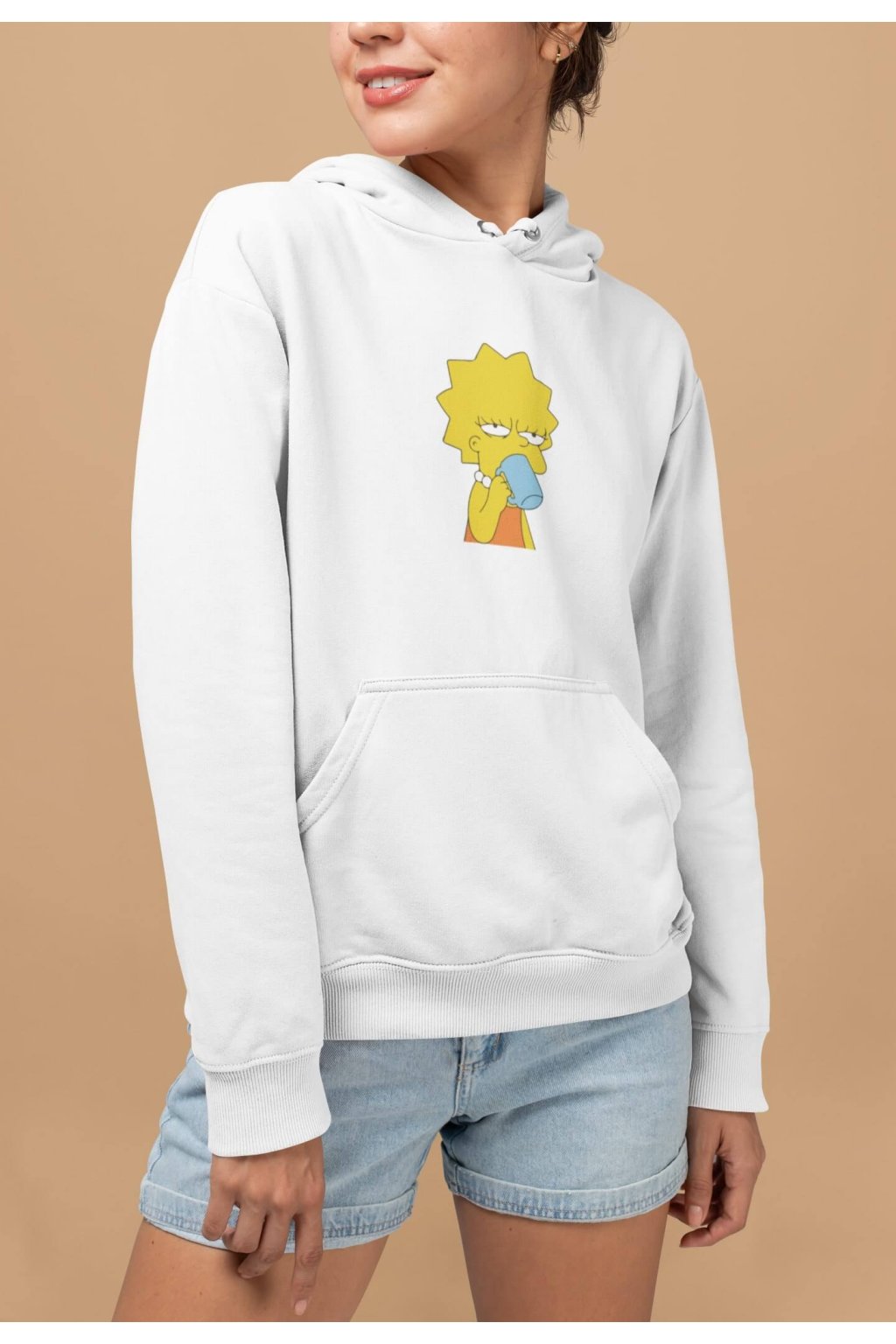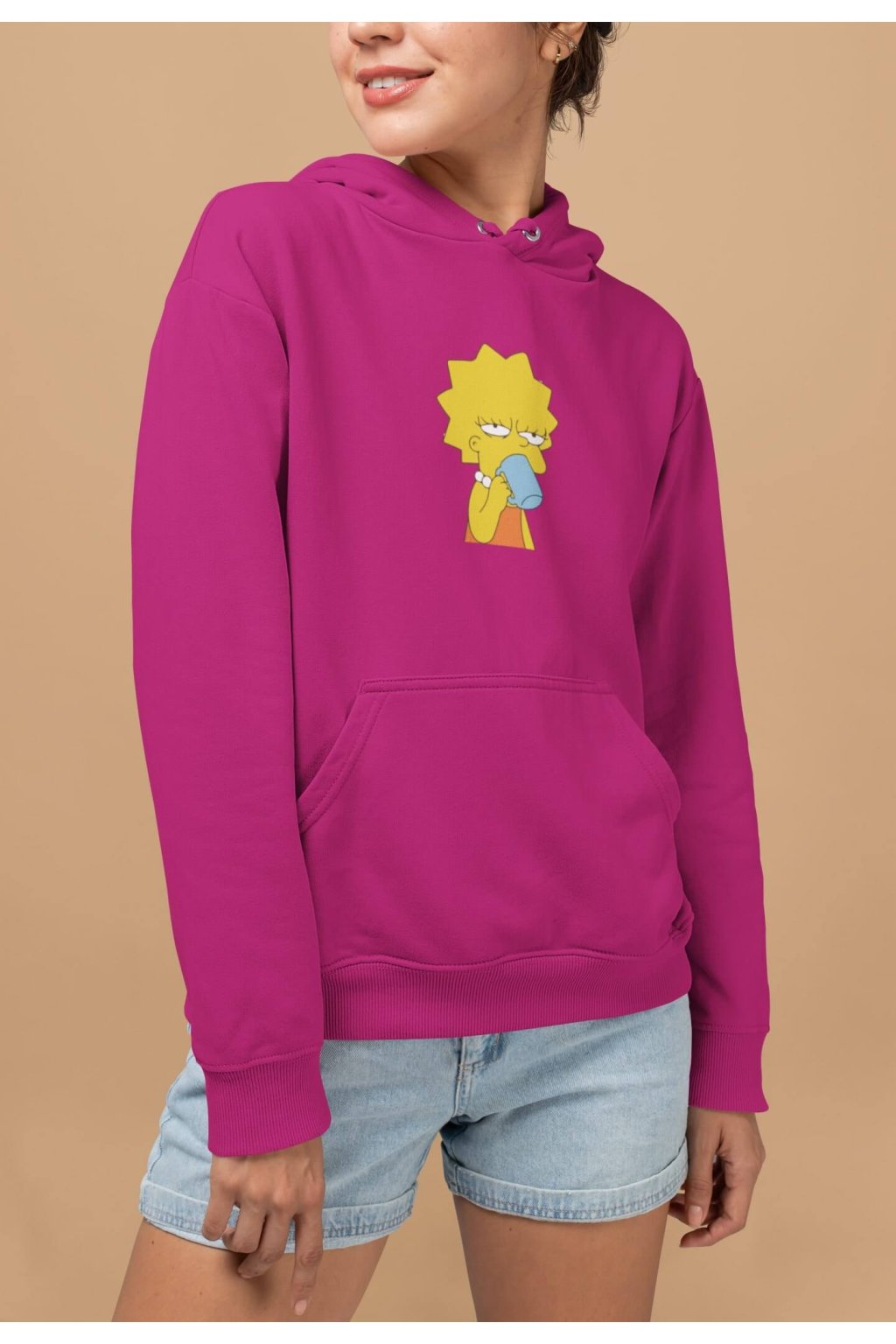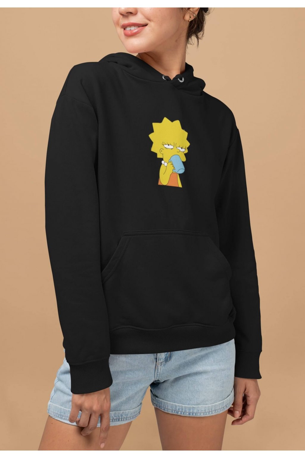 Dámska mikina s kapucňou, dlhými rukávmi, klokaním vreckom a vtipnou potlačou. Na mikine je obrázok vyčerpanej Lízy z obľúbeného seriálu Simpsonovci.