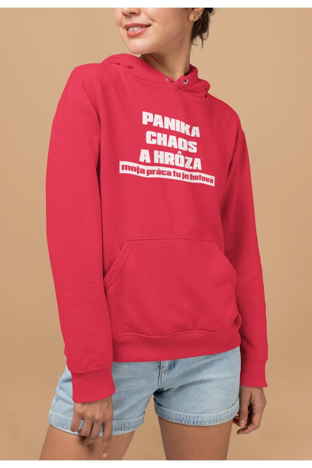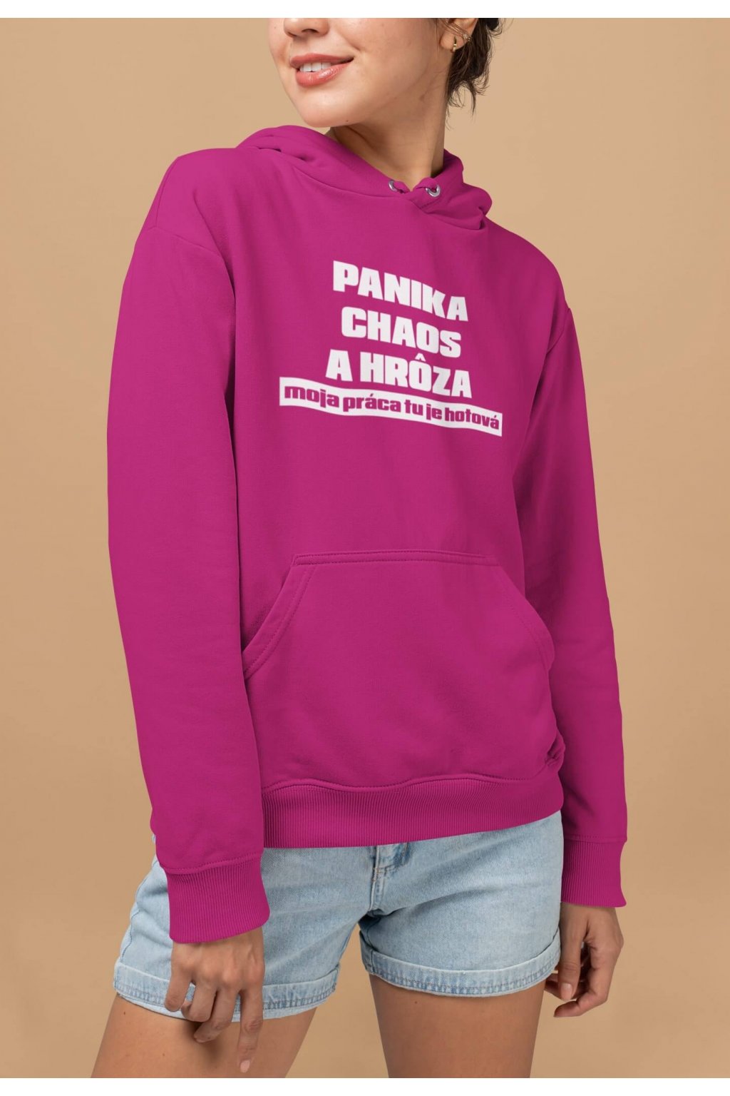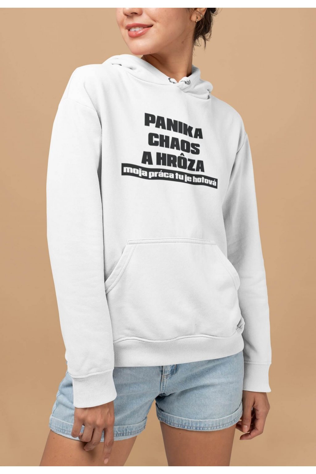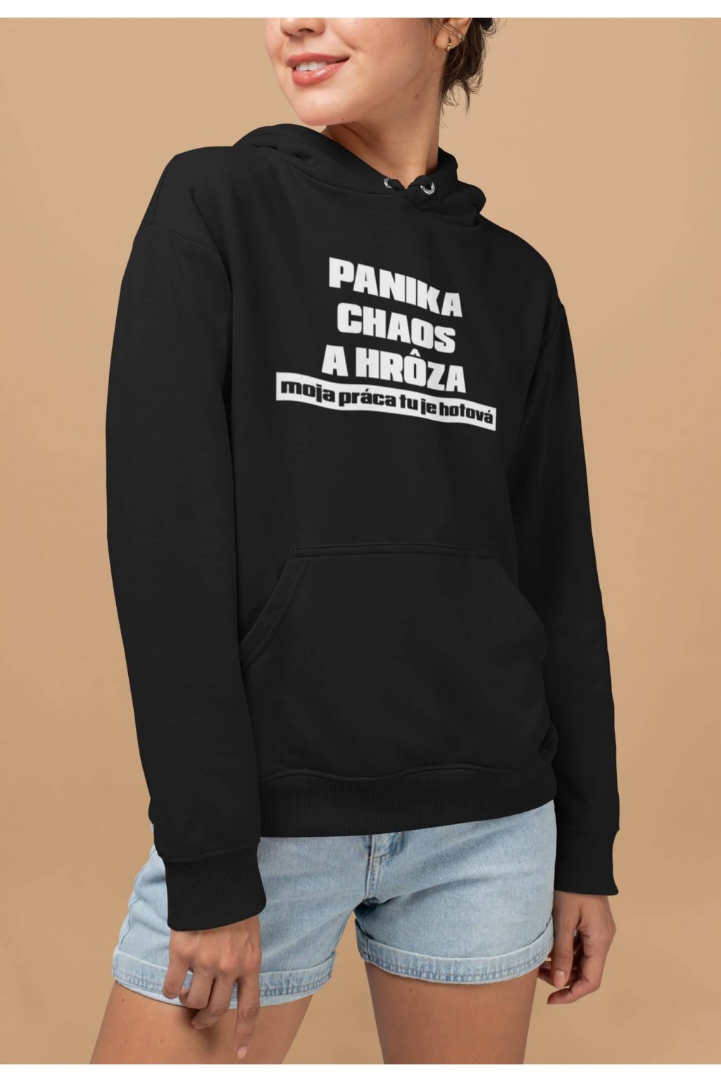 Dámska mikina s kapucňou, dlhými rukávmi, klokaním vreckom a vtipnou potlačou. Na mikine je vtipný text: ,,PANIKA, CHAOS A HRÔZA, moja práca tu je hotová." No a čo, že všade spôsobíš chaos, aspoň si výnimočná.